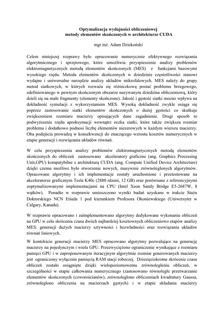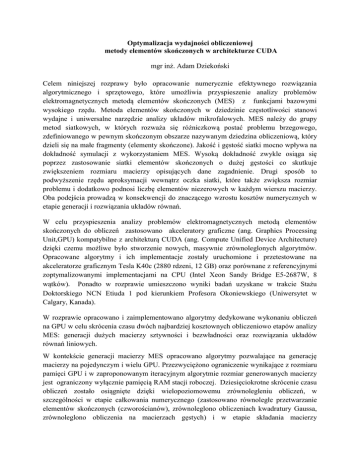 Optymalizacja wydajności obliczeniowej metody elementów skończonych w architekturze CUDA mgr inż. Adam Dziekoński Celem niniejszej rozprawy było opracowanie numerycznie efektywnego rozwiązania algorytmicznego i sprzętowego, które umożliwia przyspieszenie analizy problemów elektromagnetycznych metodą elementów skończonych (MES) z funkcjami bazowymi wysokiego rzędu. Metoda elementów skończonych w dziedzinie częstotliwości stanowi wydajne i uniwersalne narzędzie analizy układów mikrofalowych. MES należy do grupy metod siatkowych, w których rozważa się różniczkową postać problemu brzegowego, zdefiniowanego w pewnym skończonym obszarze nazywanym dziedzina obliczeniową, który dzieli się na małe fragmenty (elementy skończone). Jakość i gęstość siatki mocno wpływa na dokładność symulacji z wykorzystaniem MES. Wysoką dokładność zwykle osiąga się poprzez zastosowanie siatki elementów skończonych o dużej gęstości co skutkuje zwiększeniem rozmiaru macierzy opisujących dane zagadnienie. Drugi sposób to podwyższenie rzędu aproksymacji wewnątrz oczka siatki, które także zwiększa rozmiar problemu i dodatkowo podnosi liczbę elementów niezerowych w każdym wierszu macierzy. Oba podejścia prowadzą w konsekwencji do znaczącego wzrostu kosztów numerycznych w etapie generacji i rozwiązania układów równań. W celu przyspieszenia analizy problemów elektromagnetycznych metodą elementów skończonych do obliczeń zastosowano akceleratory graficzne (ang. Graphics Processing Unit,GPU) kompatybilne z architekturą CUDA (ang. Compute Unified Device Architecture) dzięki czemu możliwe było stworzenie nowych, masywnie zrównoleglonych algorytmów. Opracowane algorytmy i ich implementacje zostały uruchomione i przetestowane na akceleratorze graficznym Tesla K40c (2880 rdzeni, 12 GB) oraz porównane z referencyjnymi zoptymalizowanymi implementacjami na CPU (Intel Xeon Sandy Bridge E5-2687W, 8 wątków). Ponadto w rozprawie umieszczono wyniki badań uzyskane w trakcie Stażu Doktorskiego NCN Etiuda 1 pod kierunkiem Profesora Okoniewskiego (Uniwersytet w Calgary, Kanada). W rozprawie opracowano i zaimplementowano algorytmy dedykowane wykonaniu obliczeń na GPU w celu skrócenia czasu dwóch najbardziej kosztownych obliczeniowo etapów analizy MES: generacji dużych macierzy sztywności i bezwładności oraz rozwiązania układów równań liniowych. W kontekście generacji macierzy MES opracowano algorytmy pozwalające na generację macierzy na pojedynczym i wielu GPU. Przezwyciężono ograniczenie wynikające z rozmiaru pamięci GPU i w zaproponowanym iteracyjnym algorytmie rozmiar generowanych macierzy jest ograniczony wyłącznie pamięcią RAM stacji roboczej. Dziesięciokrotne skrócenie czasu obliczeń zostało osiągnięte dzięki wielopoziomowemu zrównolegleniu obliczeń, w szczególności w etapie całkowania numerycznego (zastosowano równoległe przetwarzanie elementów skończonych (czworościanów), zrównoleglono obliczeniach kwadratury Gaussa, zrównoleglono obliczenia na macierzach gęstych) i w etapie składania macierzy zrównoleglono proces budowy macierzy rzadkiej i zaproponowano nowy zrównoleglony algorytm konwersji między formatami reprezentacji macierzy rzadkiej. W rozprawie opracowano hybrydową implementację iteracyjnej metody gradientów sprzężonych z wielopoziomowym operatorem ściskającym pozwalającą efektywnie rozwiązać układ równań liniowych z wykorzystaniem pojedynczego i kilku akceleratorów graficznych. W trakcie rozwiązywania układu równań większość obliczeń wykonywanych jest na GPU (np. operacja mnożenia macierzy rzadkiej przez wektor, operacje na wektorach), a rozwiązanie relatywnie małego układu równań na najniższym poziomie operatora ściskającego realizowane jest na CPU. Na potrzeby, kluczowej z punktu widzenia iteracyjnego rozwiązywania układu równań, operacji mnożenia macierzy rzadkiej przez wektor w rozprawie zaproponowano nowy format zapisu macierzy rzadkiej (Sliced ELLR-T) zoptymalizowany do wykonania obliczeń na GPU, który jest wydajniejszy niż implementacje firmy NVIDIA dostępne w bibliotece CUSPARSE (CUDA 7.0). W rozprawie przeprowadzono testy numeryczne dla filtru grzebieniowego zaprojektowanego na pasmo GSM, których rezultaty potwierdziły postawione w rozprawie tezy. Zastosowanie GPU do wykonania obliczeń najbardziej kosztownych obliczeniowo etapów MES pozwoliło na ok. 4,7 krotne skrócenie czasu analizy MES dla największego problemu (5 milionów niewiadomych). Czas analizy MES skrócono z pięciu godzin (obliczenia wykonywane wyłącznie na CPU) do ok. godziny gdy obliczenia w etapach generacji macierzy i rozwiązania układu równań wykonywane są na GPU.