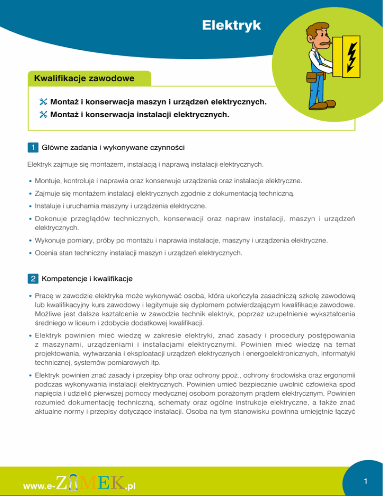 Elektryk Kwalifikacje zawodowe Montaż i konserwacja maszyn i urządzeń elektrycznych. Montaż i konserwacja instalacji elektrycznych. 1 Główne zadania i wykonywane czynności Elektryk zajmuje się montażem, instalacją i naprawą instalacji elektrycznych. Montuje, kontroluje i naprawia oraz konserwuje urządzenia oraz instalacje elektryczne. Zajmuje się montażem instalacji elektrycznych zgodnie z dokumentacją techniczną. Instaluje i uruchamia maszyny i urządzenia elektryczne. Dokonuje przeglądów technicznych, konserwacji oraz napraw instalacji, maszyn i urządzeń elektrycznych. Wykonuje pomiary, próby po montażu i naprawia instalacje, maszyny i urządzenia elektryczne. Ocenia stan techniczny instalacji maszyn i urządzeń elektrycznych. 2 Kompetencje i kwalifikacje Pracę w zawodzie elektryka może wykonywać osoba, która ukończyła zasadniczą szkołę zawodową lub kwalifikacyjny kurs zawodowy i legitymuje się dyplomem potwierdzającym kwalifikacje zawodowe. Możliwe jest dalsze kształcenie w zawodzie technik elektryk, poprzez uzupełnienie wykształcenia średniego w liceum i zdobycie dodatkowej kwalifikacji. Elektryk powinien mieć wiedzę w zakresie elektryki, znać zasady i procedury postępowania z maszynami, urządzeniami i instalacjami elektrycznymi. Powinien mieć wiedzę na temat projektowania, wytwarzania i eksploatacji urządzeń elektrycznych i energoelektronicznych, informatyki technicznej, systemów pomiarowych itp. Elektryk powinien znać zasady i przepisy bhp oraz ochrony ppoż., ochrony środowiska oraz ergonomii podczas wykonywania instalacji elektrycznych. Powinien umieć bezpiecznie uwolnić człowieka spod napięcia i udzielić pierwszej pomocy medycznej osobom porażonym prądem elektrycznym. Powinien rozumieć dokumentację techniczną, schematy oraz ogólne instrukcje elektryczne, a także znać aktualne normy i przepisy dotyczące instalacji. Osoba na tym stanowisku powinna umiejętnie łączyć 1 fakty w całość w celu podjęcia konkretnych czynności, a także umieć wykonać czytelną dokumentację po realizacji zadań. Wykonywanie zawodu elektryka wymaga zdolności manualnych, umiejętności precyzyjnego posługiwania się narzędziami i sprzętem. Elektryka powinna cechować dokładność, precyzyjność oraz dbałość o porządek. W tym zawodzie jest wskazana dociekliwość i opanowanie w trudnych sytuacjach. Elektryk powinien umieć pracować pod presją czasu oraz być odporny na długotrwały wysiłek fizyczny i umysłowy. Osobę pracującą na tym stanowisku powinien cechować dobry stan zdrowia i sprawność fizyczna, a także precyzyjność, spostrzegawczość i zręczność. Przeciwwskazaniami do wykonywania tego zawodu są: zakaz pracy na wysokości, daltonizm, wady wzroku niepoddające się korekcji, zaburzenia koordynacji wzrokowo-ruchowej oraz równowagi. 3 Środowisko i charakter pracy Elektryk ma możliwość pracy w dużych przedsiębiorstwach (firmach), a także małych warsztatach, zakładach. Może pracować indywidualnie lub w zespole. Praca w dużych przedsiębiorstwach może być monotonna i ograniczona do wąskiego zakresu wykonywanych czynności. Praca w warsztacie daje możliwość wykonywania szerszego zakresu czynności i zadań, jest różnorodna i wymaga dużej samodzielności. Elektryk często pracuje w wymuszonej pozycji ciała, na wysokości i pod presją czasu. Jest zagrożony ryzykiem porażenia prądem. Może wykonywać pracę w różnych warunkach atmosferycznych, a także w dużych lub małych, otwartych lub zamkniętych pomieszczeniach (halach). Może pracować w systemie zmianowym. 2