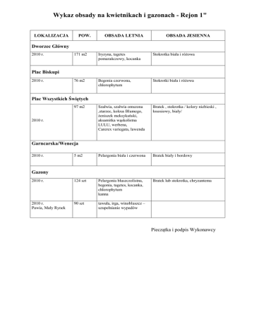 Wykaz obsady na kwietnikach i gazonach - Rejon 1" LOKALIZACJA POW. OBSADA LETNIA OBSADA JESIENNA Dworzec Główny 2010 r. 171 m2 Iryzyna, tagetes pomarańczowy, kocanka Stokrotka biała i róŜowa 76 m2 Begonia czerwona, chlorophytum Stokrotki biała i róŜowa Szałwia, szałwia omszona ,starzec, koleus Blumego, Ŝeniszek meksykański, aksamitka wąskolistna LULU, werbena, Carerex variegata, lawenda Bratek , stokrotka / kolory niebieski , łososiowy, biały/ 5 m2 Pelargonia biała i czerwona Bratek biały i bordowy 2010 r. 124 szt Pelargonia bluszczolistna, begonia, tagetes, kocanka, chlorophytum kanna Bratek lub stokrotka, chryzantema 2010 r. Pawia, Mały Rynek 90 szt tawuła, irga, winobluszcz – uzupełnianie wypadów Plac Biskupi 2010 r. Plac Wszystkich Świętych 97 m2 2010 r. Garncarska/Wenecja 2010 r. Gazony Pieczątka i podpis Wykonawcy