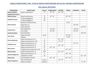 ZAJĘCIA DODATKOWE Z ART. 42 KN W SZKOLE PODSTAWOWEJ NR 313 IM. POLSKICH ODKRYWCÓW Rok szkolny 2015/2016 PROWADZĄCY Bielecka Elżbieta NAZWA ZAJĘĆ Zajęcia wyrównawcze NR SALI 32 PONIEDZIAŁEK 800 - 845 Zajęcia wyrównawcze 37 800 - 845 Terapia pedagogiczna 48 Terapia pedagogiczna 48 WTOREK 1425 - 1520 ŚRODA CZWARTEK PIATEK Bogusławska Paulina Błońska Renata Brodnicka Joanna 1330- 1420 900-930 Bezpieczne dziecko/ Szachy Boroń Grażyna 1330-1400 Śpiew dla kl. 1a 1430-1530 Szachy dla kl.0b Grotek Iwona Grotek Dominika Juras Paweł Karwot Agnieszka Kempisty Anna Kisiel Joanna Klicka Grażyna Lipińska Małgorzata Misiak Anna Mysłek Magdalena Koło kaligraficzne 1330-1400 1330-1400 Chór Cybiski 1400-1430 1400-1430 1430-1530 Koło Podróżnika Zajęcia sportowe 1140-1225 forum 700-800 Świetlica Zajęcia wyrównawcze kl. Vc 4 1430 – 1530 Zajęcia wyrównawcze kl. Vc4a 45 855 - 940 Zajęcia wyrównawcze kl. 1b 51 Zajęcia wyrównawcze kl. 4a 35 Zajęcia wyrównawcze kl. 5c 34 Przygotowanie do egzaminu kl. VIb 34 Zajęcia wyrównawcze kl. 1a 3/35 Zajęcia wyrównawcze kl. 1a 4 Ortografia na wesoło 38 800 - 845 1340 - 1425 1340 - 1425 1340 - 1425 1230 - 1315 1345 - 1430 1149 - 1430 1330 - 1430 Koło miłośników zwierząt Koło matematyczne nowa św. Opieka w świetlicy świetlica 1330 - 1430 855 - 940 700 - 800 Niegowska Maria Nieścioruk Katarzyna Koło języka angielskiego 34 Koło dziennikarskie 4 Kółko szachowe świetlica Opieka w świetlicy świetlica 0800 - 0845 1400 - 1445 1430 - 1530 0700 - 0800 1430 Perczak Sylwia Chrześcijańskie kółko filmowe 34 Puton Anna Koło religijne 14 1250 - 1335 Przała Barbara Zajęcia z reedukacji 6a, 6b czytelnia 6b 755 - 855 Puk Jolanta 1335 - 1350 3 Zajęcia wyrównawcze kl. 4b 32 Zajęcia dydaktyczno-wyrównawcze 35 Koło ortograficzne 35 Świerczyńska Bożena Szkolne koło sportowe sala Światek Martyna Gimnastyka „W zdrowym ciele zdrowy duch” z elementami korektywy „0B” Strublewska Monika Walburg Laura Wilczak Agnieszka Wojda Paweł Wrońska Hanna Wroniszewski Maciej Zemler Katarzyna Hryniewicz-Czarnecka Małgorzata 6a 755 - 855 Konsultacje z plastyki Zajęcia teatralne 4b Sieradyka Barbara 855 – 940 św. 1250 - 1335 1340 - 1425 1250 - 1330 1140 - 1225 1340 - 1425 1530 - 1600 1435 - 1520 1530 - 1600 1530 - 1600 1435 - 1520 Zajęcia wyrównawcze kl. 38 Koło matematyczne 38 Zajęcia wyrównawcze 32 1530 - 1615 Koło historyczne 32 1530 - 1730 Koło informatyczne 4 1340 - 1500 Zajęcia wyrównawcze 4b 37 1340 - 1425 Koło matematyczne 5a, 5b 37 Koło przyrodnicze Vc 3 Opieka w świetlicy 1530 - 1600 1340 - 1425 0800 - 0845 1530 - 1630