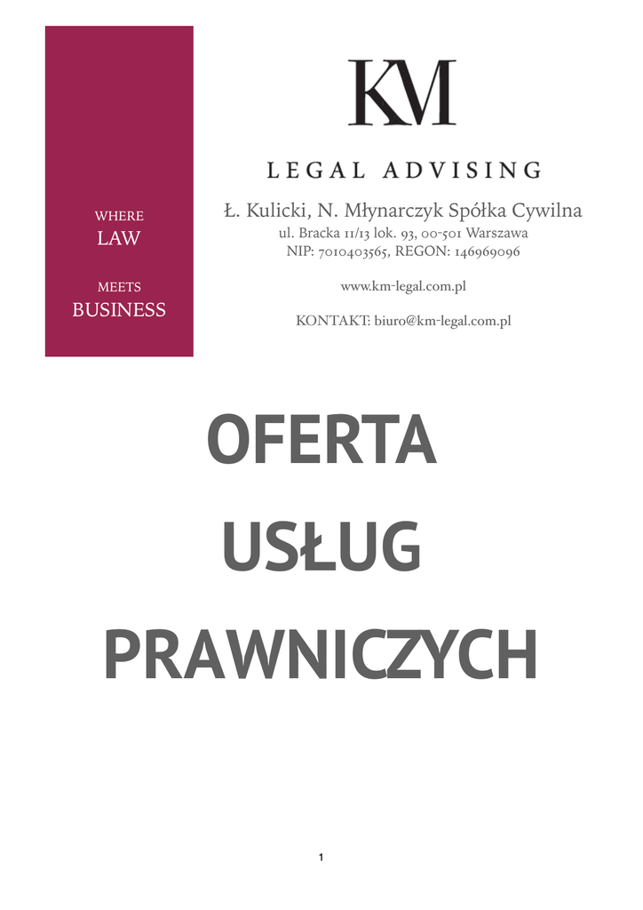 WHERE Ł. Kulicki, N. Młynarczyk Spółka Cywilna LAW ul. Bracka 11/13 lok. 93, 00-501 Warszawa NIP: 7010403565, REGON: 146969096 MEETS www.km-legal.com.pl BUSINESS KONTAKT: [email protected] OFERTA USŁUG PRAWNICZYCH 1 O NAS: KM LEGAL ADVISING Ł. Kulicki, N. Młynarczyk Spółka Cywilna jest firmą prawniczą działającą na rynku warszawskim. Wspólnikami są dwaj młodzi prawnicy, którzy przez lata studiów zdobyli bogate doświadczenie zawodowe, pracując w administracji publicznej, największych warszawskich kancelariach prawnych i działach prawnych międzynarodowych korporacji. Usługi prawnicze świadczone przez KM LEGAL ADVISING spotykają się z bardzo życzliwymi ocenami Klientów, czego dowodem są liczne słowa uznania i rekomendacje. W naszej pracy gwarantujemy kompletne rozwiązania prawne. Otwartość i kreatywne podejście do realizacji każdej usługi prawniczej sprawiają, że z powodzeniem wychodzimy naprzeciw oczekiwaniom naszych Klientów, realizując Państwa indywidualne potrzeby. Wskazujemy, jak z sukcesem wykorzystać pojawiające się możliwości biznesowe. Przedsiębiorcy potrzebują nowoczesnych rozwiązań i praktycznego wsparcia w sprawach, które na co dzień towarzyszą ich działalności. Doradzając, ściśle współpracujemy z Klientem, dążąc do zrozumienia specyfiki jego działalności, otaczających go uwarunkowań biznesowych i historycznych tak, aby stworzyć usługę uszytą na miarę jego oczekiwań. Dzięki temu, dbając o bezpieczeństwo prawne i ekonomiczne, proponujemy i wdrażamy rozwiązania dopasowane do potrzeb Klienta, a zarazem skuteczne i efektywne. Proponujemy też Państwu pełną obsługę współpracujących z nami prawników z całego kraju – w tym Autoryzowanych Doradców Rynku NewConnect, Notariuszy, Doradców podatkowych oraz specjalistów ds. nieruchomości. Swoje usługi świadczymy w językach angielskim, niemieckim, rosyjskim i ukraińskim. 2 KIM JESTEŚMY: NORBERT MŁYNARCZYK ŁUKASZ KULICKI Specjalizacja: Specjalizacja: Prawo spółek handlowych i prawo zobowiązań. Prawo korporacyjne i prawo rynków kapitałowych. Specjalizuje się również w transakcjach fuzji Specjalizuje się również w postępowaniu dochodzenia wierzytelności oraz bieżącej obsłudze i przejęć, private equity oraz bieżącej obsłudze korporacyjnej spółek prawa handlowego. Zajmował się także pracami nad prospektami emisyjnymi oraz podmiotów prowadzących działalność gospodarczą. Ponadto zajmuje się prawem podatkowym oraz prawem zamówień publicznych, a także przygotowywaniem analiz due diligence na potrzeby transakcji kapitałowych. zagadnieniami związanymi z konsorcjami. Doświadczenie: Doświadczenie zdobywał pracując w administracji skarbowej, warszawskich kancelariach prawnych Doświadczenie: Doświadczenie zawodowe zdobywał pracując w renomowanych warszawskich kancelariach prawnych, m.in. Kancelarii Gessel, Koziorowski Sp. k. m.in. Kancelaria L. Czarny, W. Budny sp.k. oraz w dziale prawnym Robert Bosch Sp. z o.o. oraz w jednej z największych spółek świadczących usługi leasingu. Wykształcenie: Wykształcenie: Studia prawnicze na Wydziale Prawa i Administracji Studia prawnicze na Wydziale Prawa i Administracji Uniwersytetu Kardynała Stefana Wyszyńskiego Uniwersytetu Kardynała Stefana Wyszyńskiego w Warszawie. Studia doktoranckie w Katedrze Prawa Finansowego Uniwersytetu Łódzkiego. w Warszawie. ZAKRES ŚWIADCZONYCH USŁUG: Oferta naszej firmy obejmuje obsługę podmiotów prowadzących działalność gospodarczą. Pracujemy dla dużych i średnich przedsiębiorców z wieloletnią tradycją, ale naszą specjalnością jest obsługa firm na wczesnym etapie rozwoju (seed, start-up, early growth). Z powodzeniem pomagamy im w rozwoju działalności i osiągnięciu sukcesu biznesowego. Ponadto doskonale wiemy, iż podmioty tego typu potrzebują stałych konsultacji prawnych w bieżącej działalności, lecz zazwyczaj nie mogą sobie na to pozwolić ze względów finansowych. Nasza oferta łamie te bariery. Oferujemy doradztwo w zakresie: 1. Prawa cywilnego: • prawo zobowiązań; przygotowywanie oraz opiniowanie wszelkich umów wykorzystywanych w obrocie gospodarczym, 3 • windykacja należności, począwszy od negocjacji przedsądowych, poprzez przygotowanie wezwania do zapłaty i pozwu o zapłatę, aż do sporządzenia wniosku o wszczęcie egzekucji i przeprowadzenie postępowania egzekucyjnego. 2. Prawa gospodarczego i prawa spółek: • pełna obsługa spółek - zakładanie spółek, ich przekształcenia, łączenie i likwidacja, • sprawy korporacyjne: obsługujemy organy spółek, ich posiedzenia, przygotowujemy projekty dokumentów, w tym uchwał, porozumień wspólników oraz umów o współpracy, • prawne aspekty reorganizacji spółek i tworzenia przepisów wewnętrznych, • przeprowadzanie badań due diligence spółek, • obsługa osób fizycznych prowadzących działalność gospodarczą, • opracowywanie i przygotowywanie dokumentów niezbędnych do funkcjonowania przedsiębiorstwa, • negocjacje biznesowe, • doradztwo w zakresie prawa antymonopolowego. 3. Prawa finansowego i prawa rynków kapitałowych: • doradztwo w zakresie ochrony akcjonariuszy mniejszościowych i większościowych spółek giełdowych i notowanych na NewConnect, • wprowadzanie spółek na rynek główny Giełdy Papierów Wartościowych w Warszawie S.A., a dzięki współpracy z Autoryzowanymi Doradcami - także na rynek NewConnect, • doradztwo w sprawach corporate governance oraz obowiązków informacyjnych w przypadku spółek, których akcje są przedmiotem obrotu na rynku regulowanym, m.in. przygotowywanie projektów wewnętrznych regulacji oraz świadczenie usług bieżącego doradztwa, • doradztwo przy transakcjach nabycia znacznych pakietów akcji spółek publicznych, obsługa wezwań na sprzedaż akcji spółek publicznych, • zakładanie i obsługa funduszy inwestycyjnych, • doradztwo poda
