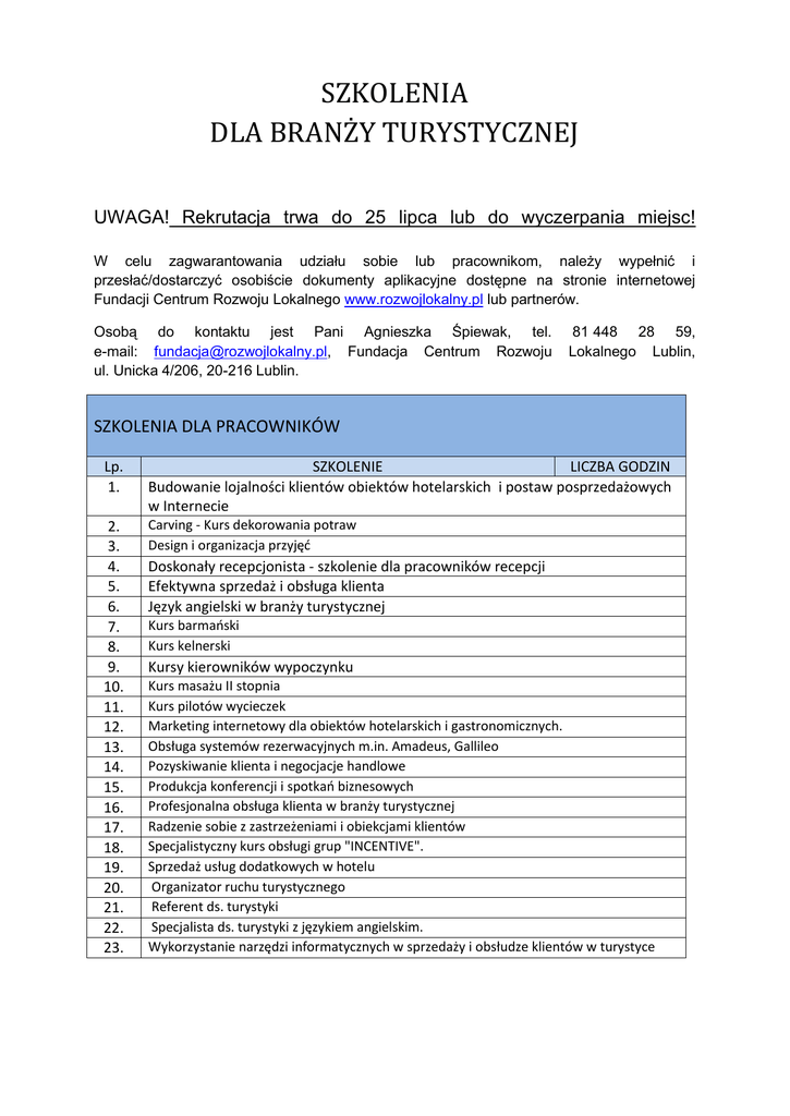 SZKOLENIA DLA BRANŻY TURYSTYCZNEJ UWAGA! Rekrutacja trwa do 25 lipca lub do wyczerpania miejsc! W celu zagwarantowania udziału sobie lub pracownikom, należy wypełnić i przesłać/dostarczyć osobiście dokumenty aplikacyjne dostępne na stronie internetowej Fundacji Centrum Rozwoju Lokalnego www.rozwojlokalny.pl lub partnerów. Osobą do kontaktu jest Pani Agnieszka Śpiewak, tel. e-mail: [email protected], Fundacja Centrum Rozwoju ul. Unicka 4/206, 20-216 Lublin. 81 448 28 59, Lokalnego Lublin, SZKOLENIA DLA PRACOWNIKÓW Lp. 1. SZKOLENIE LICZBA GODZIN Budowanie lojalności klientów obiektów hotelarskich i postaw posprzedażowych w Internecie 2. 3. 4. 5. 6. 7. 8. 9. 10. 11. 12. 13. 14. 15. 16. 17. 18. 19. 20. 21. 22. 23. Carving - Kurs dekorowania potraw Design i organizacja przyjęd Doskonały recepcjonista - szkolenie dla pracowników recepcji Efektywna sprzedaż i obsługa klienta Język angielski w branży turystycznej Kurs barmaoski Kurs kelnerski Kursy kierowników wypoczynku Kurs masażu II stopnia Kurs pilotów wycieczek Marketing internetowy dla obiektów hotelarskich i gastronomicznych. Obsługa systemów rezerwacyjnych m.in. Amadeus, Gallileo Pozyskiwanie klienta i negocjacje handlowe Produkcja konferencji i spotkao biznesowych Profesjonalna obsługa klienta w branży turystycznej Radzenie sobie z zastrzeżeniami i obiekcjami klientów Specjalistyczny kurs obsługi grup "INCENTIVE". Sprzedaż usług dodatkowych w hotelu Organizator ruchu turystycznego Referent ds. turystyki Specjalista ds. turystyki z językiem angielskim. Wykorzystanie narzędzi informatycznych w sprzedaży i obsłudze klientów w turystyce SZKOLENIA DLA KADRY ZARZĄDZAJĄCEJ Lp. 24. 25. 26. 27. 28. 29. 30. 31. 32. 33. 34. 35. 35. 36. 37. 38. 39. 40. 41. 42. 43. 44. 45. 46. SZKOLENIE Agroturystyka - przedsiębiorczośd na wsi Analiza pozycji konkurencyjnej obiektu hotelarskiego Budowanie efektywnych zespołów w branży hotelarsko-gastronomicznej Controlling i rachunkowośd zarządcza Kurs menedżera hotelarstwa Szkolenie: Manager ds. turystyki Menedżer SPA & Wellness Nowe trendy w produktach hotelowych oraz podstawy analityki operacyjnej Organizacja i zarządzanie przedsiębiorstwem turystycznym Pozafinansowe motywowanie pracowników Prawo konkurencji Prawo podatkowe dla turystyki Produkt branży turystycznej Profesjonalny menadżer gastronomii Promocja i zarządzanie hotelowym SPA Przepisy krajowe i unijne w zakresie GHP, GMP, wdrażanie HACCP Public relations w turystyce – zintegrowany dialog z otoczeniem Rekrutacja i selekcja pracowników w branży hotelarsko-gastronomiczej Revenue Management – maksymalizacja przychodów w hotelu Sztuka pozyskiwania najlepszych pracowników Umowy w transakcjach handlowych Zamówienia publiczne Zarządzanie i optymalizacja kosztów w hotelu i restauracji Zarządzanie wiedzą i rozwojem - Profesjonalne zarządzanie zasobami ludzkimi kluczem do sukcesu Firmy
