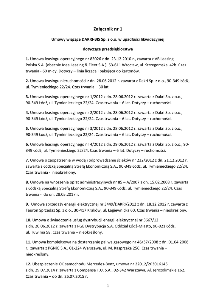 Załącznik nr 1 Umowy wiążące DAKRI-BIS Sp. z o.o. w upadłości likwidacyjnej dotyczące przedsiębiorstwa 1. Umowa leasingu operacyjnego nr 83026 z dn. 23.12.2010 r., zawarta z VB Leasing Polska S.A. (obecnie Idea Leasing & Fleet S.A.), 53-611 Wrocław, ul. Strzegomska 42b. Czas trwania - 60 m-cy. Dotyczy – linia licząca i pakująca do kartonów. 2. Umowa leasingu nieruchomości z dn. 28.06.2012 r. zawarta z Dakri Sp. z o.o., 90-349 Łódź, ul. Tymienieckiego 22/24. Czas trwania – 30 lat. 3. Umowa leasingu operacyjnego nr 1/2012 z dn. 28.06.2012 r. zawarta z Dakri Sp. z o.o., 90-349 Łódź, ul. Tymienieckiego 22/24. Czas trwania – 6 lat. Dotyczy – ruchomości. 4. Umowa leasingu operacyjnego nr 2/2012 z dn. 28.06.2012 r. zawarta z Dakri Sp. z o.o., 90-349 Łódź, ul. Tymienieckiego 22/24. Czas trwania – 6 lat. Dotyczy – ruchomości. 5. Umowa leasingu operacyjnego nr 3/2012 z dn. 28.06.2012 r. zawarta z Dakri Sp. z o.o., 90-349 Łódź, ul. Tymienieckiego 22/24. Czas trwania – 6 lat. Dotyczy – ruchomości. 6. Umowa leasingu operacyjnego nr 4/2012 z dn. 29.06.2012 r. zawarta z Dakri Sp. z o.o., 90349 Łódź, ul. Tymienieckiego 22/24. Czas trwania – 6 lat. Dotyczy – ruchomości. 7. Umowa o zaopatrzenie w wodę i odprowadzanie ścieków nr 232/2012 z dn. 21.12.2012 r. zawarta z Łódzką Specjalną Strefą Ekonomiczną S.A., 90-349 Łódź, ul. Tymienieckiego 22/24. Czas trwania - nieokreślony. 8. Umowa na wnoszenie opłat administracyjnych nr 85 – A/2007 z dn. 15.02.2008 r. zawarta z Łódzką Specjalną Strefą Ekonomiczną S.A., 90-349 Łódź, ul. Tymienieckiego 22/24. Czas trwania - do dn. 28.05.2017 r. 9. Umowa sprzedaży energii elektrycznej nr 3449/DAKRI/2012 z dn. 18.12.2012 r. zawarta z Tauron Sprzedaż Sp. z o.o., 30-417 Kraków, ul. Łagiewnicka 60. Czas trwania – nieokreślony. 10. Umowa o świadczenie usług dystrybucji energii elektrycznej nr 3667/12 z dn. 20.06.2012 r. zawarta z PGE Dystrybucja S.A. Oddział Łódź-Miasto, 90-021 Łódź, ul. Tuwima 58. Czas trwania – nieokreślony. 11. Umowa kompleksowa na dostarczanie paliwa gazowego nr 46/37/2008 z dn. 01.04.2008 r. zawarta z PGNiG S.A., 01-224 Warszawa, ul. M. Kasprzaka 25C. Czas trwania – nieokreślony. 12. Ubezpieczenie OC samochodu Mercedes-Benz, umowa nr 22012/203016145 z dn. 29.07.2014 r. zawarta z Compensa T.U. S.A., 02-342 Warszawa, Al. Jerozolimskie 162. Czas trwania – do dn. 26.07.2015 r. 1 13. Ubezpieczenie odpowiedzialności cywilnej, polisa nr 908538020822 z dn. 13.06.2015r. zawarta z TUiR WARTA S.A. 00-805 Warszawa, ul. Chmielna 85/87. Czas trwania – do dn. 12.06.2016r. 14. Ubezpieczenie mienia od ognia i innych zdarzeń losowych, polisa typ 8001 nr 000017998 z dn. 28.05.2015 r. zawarta z Compensa T.U. S.A., 02-342 Warszawa, Al. Jerozolimskie 162. Czas trwania – do dn. 28.05.2016 r. 15. Umowa o ochronę mienia nr 1/06/2013 z dn. 01.06.2013 r. zawarta między ARJAN M. Rojewski i Wspólnicy sp. k., 91-328 Łódź, ul. Polna 15A, a Dakri Dystrybucja Sp. z o.o. przy udziale Syndyka Masy Upadłości Dakri-Bis Sp. z o.o. w upadłości likwidacyjnej. Czas trwania – nieokreślony. 16. Umowa najmu BTS (powierzchni dachu) nr 29798 z dn. 30.04.2014 r. zawarta z T-Mobile Polska S.A., 02-674 Warszawa, ul. Marynarska 12. Czas trwania – nieokreślony. 2