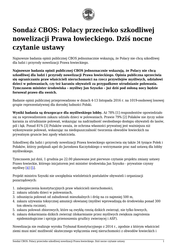 Sondaż CBOS: Polacy przeciwko szkodliwej nowelizacji Prawa łowieckiego. Dziś nocne czytanie ustawy Najnowsze badania opinii publicznej CBOS jednoznacznie wskazują, że Polacy nie chcą szkodliwej dla ludzi i przyrody nowelizacji Prawa łowieckiego. Najnowsze badania opinii publicznej CBOS jednoznacznie wskazują, że Polacy nie chcą szkodliwej dla ludzi i przyrody nowelizacji Prawa łowieckiego. Opinia publiczna sprzeciwia się ograniczaniu praw właścicieli nieruchomości na rzecz przywilejów myśliwych, udziałowi dzieci w polowaniach, czy też karaniu obywateli za przypadkowe utrudnianie polowania. Tymczasem minister środowiska – myśliwy Jan Szyszko – już dziś pod osłoną nocy będzie forsował prawo dla swoich. Badanie opinii publicznej przeprowadzono w dniach 4-13 listopada 2016 r. na 1019-osobowej losowej grupie reprezentatywnej dla dorosłej ludności Polski. Wyniki badania są druzgocące dla myśliwskiego lobby. Aż 78% [1] respondentów opowiedziało się za wprowadzeniem zakazu udziału dzieci w polowaniach. Prawie 79% [2] Polaków nie życzy sobie karania za utrudnianie polowań, wskazując na nadrzędność swobodnego dostępu obywateli do lasów, pól i łąk. Ponad 81% [3] Polaków uważa, że ochrona własności prywatnej jest ważniejsza niż wykonywanie polowań, wskazując na niedopuszczalność tworzenia obwodów łowieckich na prywatnym gruncie bez zgody właściciela. Szkodliwej dla ludzi i przyrody nowelizacji Prawa łowieckiego sprzeciwia się także 34 tysiące Polek i Polaków, którzy podpisali apel do Jarosława Kaczyńskiego o wstrzymanie prac nad ustawą dla lobby myśliwskiego. Tymczasem już dziś, 1 grudnia po 22.00 planowane jest pierwsze czytanie projektu zmiany ustawy Prawo łowieckie, którego inicjatorem jest minister środowiska Jan Szyszko - prywatnie czynny myśliwy [4] [5]. Projekt ministra Szyszki nie uwzględnia wieloletnich postulatów obywateli i organizacji pozarządowych: 1. 2. 3. 4. zabezpieczenia konstytucyjnych praw właścicieli nieruchomości, zakazu udziału dzieci w polowaniach, odsunięcia polowań od zabudowań mieszkalnych i dróg na co najmniej 500 m, zakazu używania toksycznej amunicji ołowianej (myśliwi wprowadzają do środowiska ponad 300 ton ołowiu rocznie), 5. zakazu polowań zbiorowych, które są zwykłą rzezią dzikich zwierząt, nie tylko łownych, 6. zakazu dokarmiania dzikich zwierząt (dokarmianie przez myśliwych zwiększa zagrożenia epidemiologiczne i sprzyja przenoszeniu gruźlicy zwierzęcej i ASF). Nowelizacja nie realizuje wyroku Trybunał Konstytucyjnego z 2014 r., zgodnie z którym właściciel ziemi musi mieć możliwość skutecznego wyłączenia swej nieruchomości z obwodów łowieckich i Sondaż CBOS: Polacy przeciwko szkodliwej nowelizacji Prawa łowieckiego. Dziś nocne czytanie ustawy 1 wyrażenia sprzeciwu wobec polowań na niej. Projekt przewiduje, że właściciel, który nie zgadza się na polowanie na swej nieruchomości musi udowodnić przed sądem przekonania religijne czy wyznawane zasady moralne. Tymczasem zgodnie z Konstytucją "nikt nie może być obowiązany przez organy władzy do ujawnienia swojego światopoglądu, przekonań religijnych lub wyznania". Minister Szyszko proponuje też karanie obywateli za przypadkowe utrudnienie polowania. To sprawi, że prawo myśliwych do zabijania zwierząt stanie się nadrzędne wobec prawa nas wszystkich do swobodnego korzystania z lasów. Polacy nie chcą prawa kształtowanego pod dyktando entuzjastów krwawego hobby. Apelujemy do posłanek i posłów o odrzucenie w całości tego skandalicznego projektu ustawy podczas pierwszego czytania. Osoby do kontaktu: Sylwia Szczutkowska, Stowarzyszenie Pracownia na rzecz Wszystkich Istot, [email protected], tel. 512 281 664 Zenon Kruczyński, Koalicja Niech Żyją!, [email protected], tel. 696 604 746 Cezary Wyszyński, Fundacja Międzynarodowy Ruch na Rzecz Zwierząt – Viva!, [email protected], tel. 502 279 920 Piotr Cykowski, Akcja Demokracja, [email protected], tel. 604 266 997 [1] zdecydowanie należałoby zakazać – 52,5%, raczej należałoby zakazać – 25,5%, raczej nie należałoby zakazywać – 13,4%, zdecydowanie nie należałoby zakazywać – 5,6%, trudno powiedzieć – 3,0% [2] zdecydowanie należałoby karać – 4,2%, raczej należałoby karać – 11,1%, raczej nie należałoby karać – 29,8%, zdecydowanie nie należałoby karać – 48,9%, trudno powiedzieć 6,1% [3] ochrona własności jest ważniejsza niż wykonywanie polowań – 81,1%, wykonywanie polowań jest ważniejsze niż ochrona własności prywatnej – 8,3%, trudno powiedzieć – 10,7% [4] http://petycja.pracownia.org.pl/petycja/nie-dla-rzeczpospolitej-mysliwskiej [5] https://dzialaj.akcjademokracja.pl/campaigns/nie-dla-rzeczpospolitej-mysliwskiej Sondaż CBOS: Polacy przeciwko szkodliwej nowelizacji Prawa łowieckiego. Dziś nocne czytanie ustawy 2