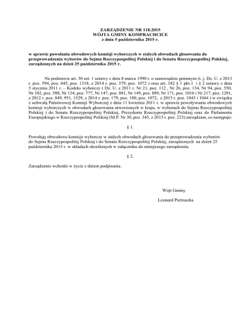 ZARZĄDZENIE NR 118.2015 WÓJTA GMINY KOMPRACHCICE z dnia 5 października 2015 r. w sprawie powołania obwodowych komisji wyborczych w stałych obwodach głosowania do przeprowadzenia wyborów do Sejmu Rzeczypospolitej Polskiej i do Senatu Rzeczypospolitej Polskiej, zarządzonych na dzień 25 października 2015 r. Na podstawie art. 30 ust. 1 ustawy z dnia 8 marca 1990 r. o samorządzie gminnym (t. j. Dz. U. z 2013 r. poz. 594, poz. 645, poz. 1318, z 2014 r. poz. 379, poz. 1072 ) oraz art. 182 § 1 pkt.1 i § 2 ustawy z dnia 5 stycznia 2011 r. – Kodeks wyborczy ( Dz. U. z 2011 r. Nr 21, poz. 112 , Nr 26, poz. 134, Nr 94, poz. 550, Nr 102, poz. 588, Nr 134, poz. 777, Nr 147, poz. 881, Nr 149, poz. 889, Nr 171, poz. 1016 i Nr 217, poz. 1281, z 2012 r. poz. 849, 951, 1529, z 2014 r. poz. 179, poz. 180, poz. 1072, z 2015 r. poz. 1043 i 1044 ) w związku z uchwałą Państwowej Komisji Wyborczej z dnia 11 kwietnia 2011 r. w sprawie powoływania obwodowych komisji wyborczych w obwodach głosowania utworzonych w kraju, w wyborach do Sejmu Rzeczypospolitej Polskiej i do Senatu Rzeczypospolitej Polskiej, Prezydenta Rzeczypospolitej Polskiej oraz do Parlamentu Europejskiego w Rzeczypospolitej Polskiej (M.P. Nr 30, poz. 345, z 2015 r. poz. 223) zarządzam, co następuje: § 1. Powołuję obwodowe komisje wyborcze w stałych obwodach głosowania do przeprowadzenia wyborów do Sejmu Rzeczypospolitej Polskiej i do Senatu Rzeczypospolitej Polskiej, zarządzonych na dzień 25 października 2015 r. w składach określonych w załączniku do niniejszego zarządzenia. § 2. Zarządzenie wchodzi w życie z dniem podpisania. Wójt Gminy Leonard Pietruszka Załącznik do Zarządzenia nr 118.2015 Wójta Gminy Komprachcice z dnia 5 października 2015r. Składy obwodowych komisji wyborczych w stałych obwodach głosowania do przeprowadzenia wyborów do Sejmu Rzeczypospolitej Polskiej i do Senatu Rzeczypospolitej Polskiej, zarządzonych na dzień 25 października 2015 r. Obwodowa Komisja Wyborcza nr 1 w Komprachcicach – Urząd Gminy w Komprachcicach, ul. Kolejowa 3 Lp. Imię/Imiona i Nazwisko Miejscowość Podmiot zgłaszający 1 Zuzanna Wioleta Klimek 2 3 4 5 6 7 8 9 Andrzej Jan Tomas Mariusz Leszek Dynkiewicz Angelika Luiza Zając Joanna Weronika Buchwald Jakub Józef Kowalski Sandra Urszula Pawleta Paulina Lucyna Kostrzewa Justyna Agnieszka Zając Polska Nowa Wieś Chmielowice Komprachcice Polska Nowa Wieś Komprachcice Wawelno Ochodze Komprachcice Komprachcice osoba zgłoszona przez Wójta KWW „Kukiz´15” KW Prawo i Sprawiedliwość KW Platforma Obywatelska RP KWW Min. 15zł/h Świeckie Państwo ZUS Max. 30% Komitet Wyborczy PSL KW KORWiN KWW JOW Bezpartyjni KWW Mniejszość Niemiecka Obwodowa Komisja Wyborcza nr 2 w Chmielowicach – Publiczna Szkoła Podstawowa w Chmielowicach, ul. Nyska 1 1 Monika Magdalena Lasaj Wawelno osoba zgłoszona przez Wójta 2 Anna Tomas Chmielowice KWW „Kukiz´15” 3 Janusz Łukasz Uchnast Chmielowice KW Prawo i Sprawiedliwość 4 Karina Elżbieta Schmolke Komprachcice KW Platforma Obywatelska RP 5 Ireneusz Jan Krawczyk Domecko KKW Zjednoczona Lewica SLD+TR+PPS+UP+Zieloni 6 Nikola Anna Wiench Wawelno Komitet Wyborczy PSL 7 Dominika Maria Niestrój Chmielowice KW KORWiN 8 Klaudiusz Andrzej Weber Domecko KWW JOW Bezpartyjni 9 Magdalena Maria Molek Dziekaństwo KWW Mniejszość Niemiecka Obwodowa Komisja Wyborcza nr 3 w Ochodzach – Publiczna Stowarzyszeniowa Szkoła Podstawowa w Ochodzach, ul. Opolska 34 1 Komprachcice osoba zgłoszona przez Wójta Joanna Katarzyna Woźnica 2 Magdalena Kościółek Domecko KWW „Kukiz´15” 3 Monika Weronika Hydel Ochodze KW Prawo i Sprawiedliwość 4 Jolanta Maria Żyła Ochodze KW Platforma Obywatelska RP 5 Daniel Artur Gawlista Wawelno Komitet Wyborczy PSL 6 Klaudia Kornelia Rimpler Chmielowice KW KORWiN 7 Daniel Stanisław Soroka Komprachcice KWW Grzegorza Brauna "Szczęść Boże!" 8 Daniela Stokłosa Komprachcice KWW JOW Bezpartyjni 9 Magdalena Hajduk Ochodze KWW Mniejszość Niemiecka Obwodowa Komisja Wyborcza nr 4 w Domecku – Publiczna Szkoła Podstawowa w Domecku, ul. Opolska 52 1 Krzysztof Sośniak Chmielowice osoba zgłoszona przez Wójta 2 Andrzej Kułaga Chmielowice KWW „Kukiz´15” 3 Adam Piotr Kuchczyński Osiny KW Prawo i Sprawiedliwość 4 Leon Józef Gaj Osiny KW Platforma Obywatelska RP 5 Renata Jadwiga Sanetra Domecko KKW Zjednoczona Lewica SLD+TR+PPS+UP+Zieloni 6 Alicja Joanna Gawlista Wawelno Komitet Wyborczy PSL 7 Dorota Maria Makiola Chmielowice KW KORWiN 8 Katarzyna Maria Weber Domecko KWW JOW Bezpartyjni 9 Justyna Karolina Kasperek Domecko KWW Mniejszość Niemiecka Obwodowa Komisja Wyborcza nr 5 w Polskiej Nowej Wsi – Publiczna Szkoła Podstawowa w Polskiej Nowej Wsi, ul. Lipowa 56 1 Justyna Joanna Karbowska Osiny osoba zgłoszona przez Wójta 2 Żerkowice KWW „Kukiz´15” Małgorzata Wróbel 3 Komprachcice KW Prawo i Sprawiedliwość Adrian Patryk Cichos 4 Polska Nowa Wieś KW Platforma Obywatelska RP Zofia Maria Kotońska 5 Wawelno Komitet Wyborczy PSL Barbara Dorota Nowak 6 Patrycja Gabriela Tudyka Domecko KW KORWiN 7 Aneta Elżbieta Gala Polska Nowa Wieś KWW Grzegorza Brauna "Szczęść Boże!" 8 Komprachcice KWW JOW Bezpartyjni Iwona Maria Kandziora 9 Polska Nowa Wieś KWW Mniejszość Niemiecka Barbara Maria Józwa Obwodowa Komisja Wyborcza nr 6 w Wawelnie – Publiczna Szkoła Podstawowa w Wawelnie, ul. Nowowiejska 14 1 Marta Maria Lisoń Wawelno osoba zgłoszona przez Wójta 2 Leokadia Kalinowska Chmielowice KWW „Kukiz´15” 3 Florian Jan Hydel Ochodze KW Prawo i Sprawiedliwość 4 Violetta Ewa Rychlicka Polska Nowa Wieś KW Platforma Obywatelska RP 5 Paweł Pohorecki Żerkowice KKW Zjednoczona Lewica SLD+TR+PPS+UP+Zieloni 6 Ditmar Eugeniusz Gawlista Wawelno Komitet Wyborczy PSL 7 Joanna Stefania Chrzanowska Komprachcice KWW JOW Bezpartyjni 8 Magdalena WesołowskaKomprachcice KWW Grzegorza Brauna "Szczęść Boże!" Rosołowska 9 Anna Maria Eisenbart Wawelno KWW Mniejszość Niemiecka Ob
