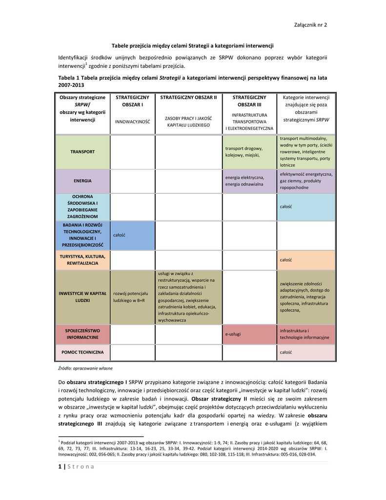 Załącznik nr 2 Tabele przejścia między celami Strategii a kategoriami interwencji Identyfikacji środków unijnych bezpośrednio powiązanych ze SRPW dokonano poprzez wybór kategorii 1 interwencji zgodnie z poniższymi tabelami przejścia. Tabela 1 Tabela przejścia między celami Strategii a kategoriami interwencji perspektywy finansowej na lata 2007-2013 Obszary strategiczne SRPW/ obszary wg kategorii interwencji STRATEGICZNY OBSZAR I INNOWACYJNOŚĆ STRATEGICZNY OBSZAR II ZASOBY PRACY I JAKOŚĆ KAPITAŁU LUDZKIEGO STRATEGICZNY OBSZAR III INFRASTRUKTURA TRANSPORTOWA I ELEKTROENEGETYCZNA Kategorie interwencji znajdujące się poza obszarami strategicznymi SRPW TRANSPORT transport drogowy, kolejowy, miejski, transport multimodalny, wodny w tym porty, ścieżki rowerowe, inteligentne systemy transportu, porty lotnicze ENERGIA energia elektryczna, energia odnawialna efektywność energetyczna, gaz ziemny, produkty ropopochodne OCHRONA ŚRODOWISKA I ZAPOBIEGANIE ZAGROŻENIOM BADANIA I ROZWÓJ TECHNOLOGICZNY, INNOWACJE I PRZEDSIĘBIORCZOŚĆ całość całość TURYSTYKA, KULTURA, REWITALIZACJA INWESTYCJE W KAPITAŁ LUDZKI SPOŁECZEŃSTWO INFORMACYJNE POMOC TECHNICZNA całość rozwój potencjału ludzkiego w B+R usługi w związku z restrukturyzacją, wsparcie na rzecz samozatrudnienia i zakładania działalności gospodarczej, zwiększenie zatrudnienia kobiet, edukacja, infrastruktura opiekuńczowychowawcza zwiększenie zdolności adaptacyjnych, dostęp do zatrudnienia, integracja społeczna, infrastruktura społeczna, e-usługi infrastruktura i technologie informacyjne całość Źródło: opracowanie własne Do obszaru strategicznego I SRPW przypisano kategorie związane z innowacyjnością: całość kategorii Badania i rozwój technologiczny, innowacje i przedsiębiorczość oraz część kategorii „inwestycje w kapitał ludzki”: rozwój potencjału ludzkiego w zakresie badań i innowacji. Obszar strategiczny II mieści się ze swoim zakresem w obszarze „inwestycje w kapitał ludzki”, obejmując część projektów dotyczących przeciwdziałaniu wykluczeniu z rynku pracy oraz wzmocnieniu potencjału kadr dla gospodarki opartej na wiedzy. W zakresie obszaru strategicznego III znajdują się kategorie związane z transportem i energią oraz e-usługami (z wyjątkiem 1 Podział kategorii interwencji 2007-2013 wg obszarów SRPW: I. Innowacyjność: 1-9, 74; II. Zasoby pracy i jakość kapitału ludzkiego: 64, 68, 69, 72, 73, 77; III. Infrastruktura: 13-14, 16-23, 25, 33-34, 39-42. Podział kategorii interwencji 2014-2020 wg obszarów SRPW: I. Innowacyjność: 002, 056-065; II. Zasoby pracy i jakość kapitału ludzkiego: 080, 102-108, 115-118; III. Infrastruktura: 005-016, 028-034. 1|Strona Załącznik nr 2 transportu multimodalnego i wodnego, ścieżek rowerowych, inteligentnych systemów transportu, portów lotniczych oraz efektywności energetycznej, gazu ziemnego i produktów ropopochodnych). Oprócz wymienionych powyżej, w zestawieniu nie uwzględniono środków zakontraktowanych w obszarach: ochrona środowiska, turystyka, kultura i rewitalizacja, społeczeństwo informacyjne (z wyjątkiem e-usług), pomoc techniczna oraz części obszaru kapitał ludzki (np. integracja społeczna, dostęp do zatrudnienia). Tabela 2 Tabela przejścia między celami Strategii a kategoriami interwencji perspektywy finansowej na lata 2014-2020 Obszary strategiczne SRPW/ obszary wg kategorii interwencji STRATEGICZNY OBSZAR I INNOWACYJNOŚĆ STRATEGICZNY OBSZAR II ZASOBY PRACY I JAKOŚĆ KAPITAŁU LUDZKIEGO TRANSPORT SPOŁECZEŃSTWO INFORMACYJNE Kategorie interwencji znajdujące się poza obszarami strategicznymi SRPW transport kolejowy, multimodalny, wodny w tym porty, ścieżki rowerowe, inteligentne systemy transportu, porty lotnicze, transport miejski całość OCHRONA ŚRODOWISKA I ŚRODOWISKO INWESTYCJE W KAPITAŁ LUDZKI INFRASTRUKTURA TRANSPORTOWA I ELEKTROENEGETYCZNA transport drogowy ENERGIA BADANIA, ROZWÓJ I INNOWACJE, PRZEDSIĘBIORCZOŚĆ STRATEGICZNY OBSZAR III całość procesy badawcze i innowacyjne w dużych przedsiębiorstwach, całość badań, rozwoju i innowacji cała przedsiębiorczość, większość inwestycji produkcyjnych w przedsiębiorstwach wszystkie kategorie w zakresie promowania trwałego i wysokiej jakości zatrudnienia oraz wsparcia mobilności pracowników oraz inwestowania w kształcenie, szkolenie i szkolenie zawodowe na rzecz zdobywania umiejętności oraz uczenia się przez całe życie infrastruktura społeczna, zdrowotna i komunikacyjna, całość w ramach wspierania włączenia społecznego, walki z ubóstwem i wszelką dyskryminacją usługi i aplikacje w zakresie włączenia cyfrowego, edostępności, e-uczenia się i e-edukacji, umiejętności cyfrowe e-administracja, e-kultura, turystyka elektroniczna, ezdrowie, usługi i aplikacje TIK dla MŚP WZMACNIANIE ZDOLNOŚCI INSTYTUCJONALNYCH całość POMOC TECHNICZNA całość Źródło: opracowanie własne 2|Strona Załącznik nr 2 Do obszaru strategicznego I SRPW przypisano kategorie związane z innowacyjnością: procesy badawcze i innowacyjne w dużych przedsiębiorstwach oraz całość badań, rozwoju i innowacji. Obszar strategiczny II mieści się ze swoim zakresem w obszarze „inwestycje w kapitał ludzki”, obejmując wszystkie kategorie w zakresie promowania trwałego i wysokiej jakości zatrudnienia oraz wsparcia mobilności pracowników, a także inwestowania w kształcenie, szkolenie i szkolenie zawodowe na rzecz zdobywania umiejętności oraz uczenia się przez całe życie. Ponadto, włączono do niego kategorie dotyczące włączenia cyfrowego, e-dostępności, e-uczenia się i e-edukacji oraz umiejętności cyfrowych W zakresie obszaru strategicznego III znajdują się kategorie związane z transportem i energią (z wyjątkami przedstawionymi w tabeli). Oprócz wymienionych powyżej, w zestawieniu nie uwzględniono środków zakontraktowanych w obszarach: ochrona środowiska, przedsi