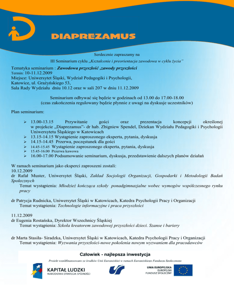 Serdecznie zapraszamy na III Seminarium cyklu „Kształcenie i preorientacja zawodowa w cyklu życia” Tematyka seminarium : Zawodowa przyszłość ,zawody przyszłości Termin: 10-11.12.2009 Miejsce: Uniwersytet Śląski, Wydział Pedagogiki i Psychologii, Katowice, ul. Grażyńskiego 53, Sala Rady Wydziału dniu 10.12 oraz w sali 207 w dniu 11.12.2009 Seminarium odbywać się będzie w godzinach od 13.00 do 17.00-18.00 (czas zakończenia regulowany będzie płynnie z uwagi na dyskusje uczestników) Plan seminarium: 13.00-13.15 Przywitanie gości oraz prezentacja koncepcji określonej w projekcie „Diaprezamus”- dr hab. Zbigniew Spendel, Dziekan Wydziału Pedagogiki i Psychologii Uniwersytetu Śląskiego w Katowicach 13.15-14.15 Wystąpienie zaproszonego eksperta, pytania, dyskusja 14.15-14.45 Przerwa, poczęstunek dla gości 14.45-15.45 Wystąpienie zaproszonego eksperta, pytania, dyskusja 15.45-16.00 Przerwa kawowa 16.00-17.00 Podsumowanie seminarium, dyskusja, przedstawienie dalszych planów działań W ramach seminarium jako eksperci zaproszeni zostali: 10.12.2009 dr Rafał Muster, Uniwersytet Śląski, Zakład Socjologii Organizacji, Gospodarki i Metodologii Badań Społecznych Temat wystąpienia: Młodzież kończąca szkoły ponadgimnazjalne wobec wymogów współczesnego rynku pracy dr Patrycja Rudnicka, Uniwersytet Śląski w Katowicach, Katedra Psychologii Pracy i Organizacji Temat wystąpienia: Technologie informacyjne i praca przyszłości 11.12.2009 dr Eugenia Rostańska, Dyrektor Wszechnicy Śląskiej Temat wystąpienia: Szkoła kreatorem zawodowej przyszłości dzieci. Szanse i bariery dr Marta Stasiła- Siradzka, Uniwersytet Śląski w Katowicach, Katedra Psychologii Pracy i Organizacji Temat wystąpienia: Wyzwania przyszłości-nowe pokolenia nowym wyzwaniem dla pracodawców Człowiek - najlepsza inwestycja Projekt współfinansowany ze środków Unii Europejskiej w ramach Europejskiego Funduszu Społecznego