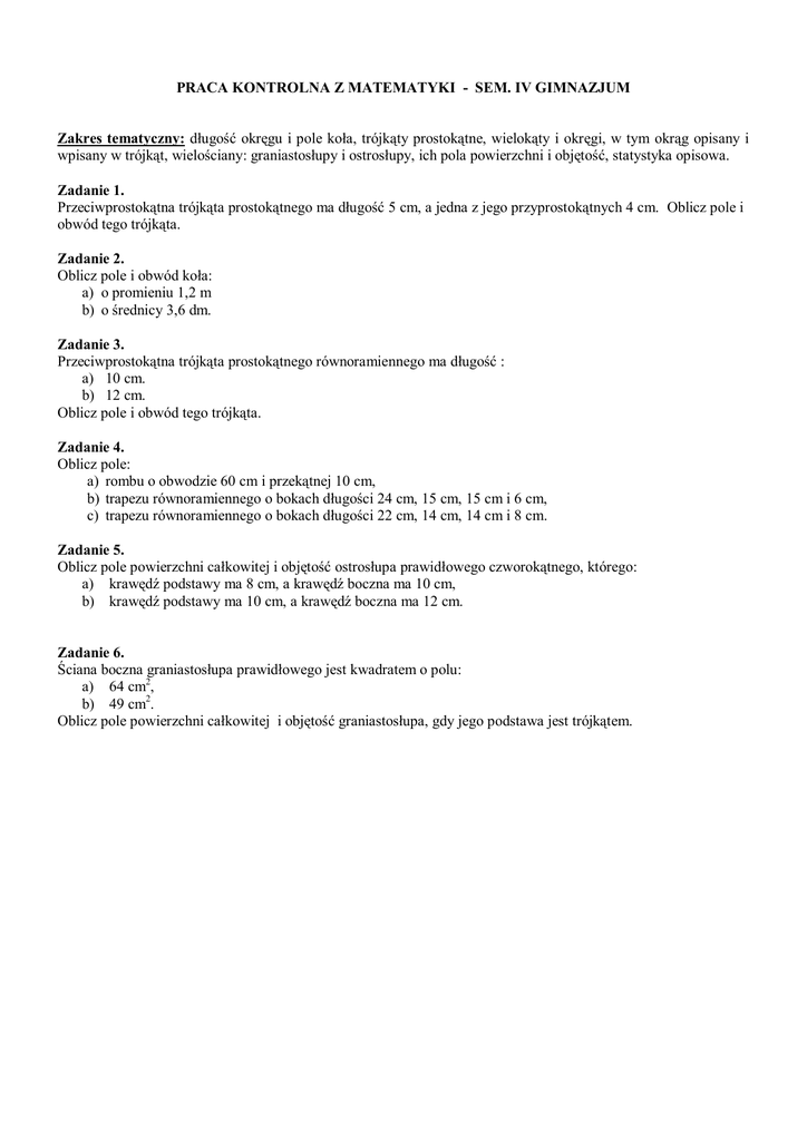 PRACA KONTROLNA Z MATEMATYKI - SEM. IV GIMNAZJUM Zakres tematyczny: długość okręgu i pole koła, trójkąty prostokątne, wielokąty i okręgi, w tym okrąg opisany i wpisany w trójkąt, wielościany: graniastosłupy i ostrosłupy, ich pola powierzchni i objętość, statystyka opisowa. Zadanie 1. Przeciwprostokątna trójkąta prostokątnego ma długość 5 cm, a jedna z jego przyprostokątnych 4 cm. Oblicz pole i obwód tego trójkąta. Zadanie 2. Oblicz pole i obwód koła: a) o promieniu 1,2 m b) o średnicy 3,6 dm. Zadanie 3. Przeciwprostokątna trójkąta prostokątnego równoramiennego ma długość : a) 10 cm. b) 12 cm. Oblicz pole i obwód tego trójkąta. Zadanie 4. Oblicz pole: a) rombu o obwodzie 60 cm i przekątnej 10 cm, b) trapezu równoramiennego o bokach długości 24 cm, 15 cm, 15 cm i 6 cm, c) trapezu równoramiennego o bokach długości 22 cm, 14 cm, 14 cm i 8 cm. Zadanie 5. Oblicz pole powierzchni całkowitej i objętość ostrosłupa prawidłowego czworokątnego, którego: a) krawędź podstawy ma 8 cm, a krawędź boczna ma 10 cm, b) krawędź podstawy ma 10 cm, a krawędź boczna ma 12 cm. Zadanie 6. Ściana boczna graniastosłupa prawidłowego jest kwadratem o polu: a) 64 cm2, b) 49 cm2. Oblicz pole powierzchni całkowitej i objętość graniastosłupa, gdy jego podstawa jest trójkątem.