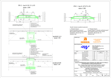PW-2 - km 0+181.31 £-P3 PW-3 - km 0+187.07 £-P4 skala 1:200 o £P3 0.4 111 110 o £P4 skala 1:200 A B 1.37 0.4 111 rz. 109.10 110 111 109 110 108 109 107 108 0.4 1.37 0.4 111 + + + + + + + 0. 2 108 0. 18 + rz. 107.04 + + 107 106 0.71 0. 18 105 104 A 1.02 + + + + rz. 106.96 i=0.5% 110 rz. 109.10 106 107 105 106 104 105 + 109 + 0. 2 109 + rz. 107.40 108 rz. 107.31 107 1.77 2.26 i=0.5% 1.71 0.69 B 2.17 106 105 1.33 konstrukcja nawierzchni ochrona izolacji, gr. min. 0.09 m geosiatka dwukierunkowa polipropylenowa (wytrzyma‡o na rozci„ganie 50 kN/m) izolacja gruba z papy zgrzewalnej p‡yta zespalaj„ca wykonywana na miejscu element prefabrykowany 2.9 2.9 2.0 0. 25 2.0 Rysunki wykonano na podstawie opracowaæ: 1: 1 nasyp zagŒszczony wg projektu drogowego I - "Przepusty drogowe II - "Przepusty drogowe flelbetowe przepusty skrzynkowe" Przepusty drogowe z elementw prefabrykowanych" Biuro projektowo-badawcze drg i mostw Biuro projektowo-badawcze drg i mostw Transprojekt - Warszawa Sp. z o.o. Transprojekt - Warszawa Sp. z o.o. Warszawa, 2004 Warszawa, 2007 1 1: przekrj A-A nasyp o wskaniku zagŒszczenia Is=1.03 1.0 skala 1:50 ZAMAWIAJ¥CY 03-808 WARSZAWA ul. Miæska 25 tel. (22) 810 39 84 fax (22) 810 04 12 izolacja cienka 1.8 BIURO PROJEKTOWE element prefabrykowany ‡awa fundamentowa z gruntu stabilizowanego cementem, gr. 0.40 m DHV POLSKA Sp. z o.o. ul. Domaniewska 41 02-672 Warszawa tel. (22) 606 28 02 ; fax (22) 606 28 03 e-mail: [email protected] SMA 8mm PMB 45/80-65, gr. 0.04 m AC WMS 16mm, gr. 0.08 m AC WMS 16mm, gr. 12cm kruszywo ‡amane 0/31.5, gr. zmienna na d‡. przepustu FUNKCJA IMI˚ I NAZWISKO BRANflA SPECJALNO˘/NR UPRAWNIE ochrona izolacji, gr. min. 0.09 m izolacja gruba z papy zgrzewalnej geosiatka dwukierunkowa polipropylenowa (wytrzyma‡o na rozci„ganie 50 kN/m) p‡yta zespalaj„ca wykonywana na miejscu element prefabrykowany 1.50 drogi Opracowa‡: mgr in¿. £ukasz Wandzel drogi mgr in¿. Andrzej Jaczewski drogi mgr in¿. Tomasz Szyszka drogi in¿. Pawe‡ Rajs drogi Sprawdzaj„cy: 2.9 2.0 1 1: nasyp zagŒszczony wg projektu drogowego 2.9 1: 1 2.0 mgr in¿. S‡awomir Dziewit in¿. Damian Skurczyk 0. 25 1.50 geosiatka dwukierunkowa polipropylenowa (wytrzyma‡o na rozci„ganie 50 kN/m) 1.0 MAZ/0196/POOD/04 drogi mgr in¿. Krystyna JastrzŒbska konstr.-bud. Wa 326/01 Zamierzenie budowlane: przekrj B-B DROGA EKSPRESOWA S8 NA ODCINKU SALOMEA-WOLICA WRAZ Z POWI¥ZANIEM Z DROG¥ KRAJOW¥ NR 7 skala 1:50 nasyp o wskaniku zagŒszczenia Is=1.03 PODPIS drogowa Projektant: Etap I - Budowa drogi ekspresowej S8 wŒze‡ Paszkw (z wŒz‡em) - wŒze‡ Opacz (bez wŒz‡a) - wŒze‡ £opuszaæska (bez wŒz‡a) izolacja cienka CzŒ 1 - odcinek zlokalizowany poza granicami m.st. Warszawy Temat opracowania: PROJEKT WYKONAWCZY 1.8 element prefabrykowany ‡awa fundamentowa z gruntu stabilizowanego cementem, gr. 0.40 m TOM 2 - PROJEKT DROGOWY Nazwa rysuku: SZCZEG£Y KONSTRUKCYJNE Przepusty skrzynkowe - przekroje PW-2 i PW-3 Nr umowy: 251/2009 Bran¿a: Stadium: Drogi PW Skala: Data: 1:200 09.2012 Rewizja: 00 Nr rys: II-11.13