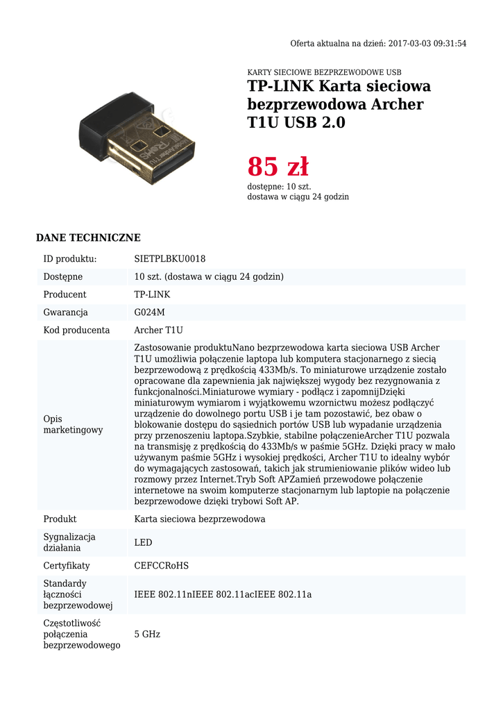 Oferta aktualna na dzień: 2017-03-03 09:31:54 KARTY SIECIOWE BEZPRZEWODOWE USB TP-LINK Karta sieciowa bezprzewodowa Archer T1U USB 2.0 85 zł dostępne: 10 szt. dostawa w ciągu 24 godzin DANE TECHNICZNE ID produktu: SIETPLBKU0018 Dostępne 10 szt. (dostawa w ciągu 24 godzin) Producent TP-LINK Gwarancja G024M Kod producenta Archer T1U Opis marketingowy Zastosowanie produktuNano bezprzewodowa karta sieciowa USB Archer T1U umożliwia połączenie laptopa lub komputera stacjonarnego z siecią bezprzewodową z prędkością 433Mb/s. To miniaturowe urządzenie zostało opracowane dla zapewnienia jak największej wygody bez rezygnowania z funkcjonalności.Miniaturowe wymiary - podłącz i zapomnijDzięki miniaturowym wymiarom i wyjątkowemu wzornictwu możesz podłączyć urządzenie do dowolnego portu USB i je tam pozostawić, bez obaw o blokowanie dostępu do sąsiednich portów USB lub wypadanie urządzenia przy przenoszeniu laptopa.Szybkie, stabilne połączenieArcher T1U pozwala na transmisję z prędkością do 433Mb/s w paśmie 5GHz. Dzięki pracy w mało używanym paśmie 5GHz i wysokiej prędkości, Archer T1U to idealny wybór do wymagających zastosowań, takich jak strumieniowanie plików wideo lub rozmowy przez Internet.Tryb Soft APZamień przewodowe połączenie internetowe na swoim komputerze stacjonarnym lub laptopie na połączenie bezprzewodowe dzięki trybowi Soft AP. Produkt Karta sieciowa bezprzewodowa Sygnalizacja działania LED Certyfikaty CEFCCRoHS Standardy łączności bezprzewodowej IEEE 802.11nIEEE 802.11acIEEE 802.11a Częstotliwość połączenia bezprzewodowego 5 GHz Tryby pracy bezprzewodowej Ad-HocInfrastruktury Typ anteny wbudowana Czułość odbiornika 11a Zabezpieczenia WEPWPAWPA2WPA-PSKWPA2-PSK802.1x Modulacja DBPSKDQPSKOFDM16-QAM64-QAM256-QAM Komunikacja z komputerem USB 2.0 Zgodność z systemem operacyjnym Windows 8.1/8/7/XP 32/64 Temperatura pracy 0 do 40 °C Temperatura przechowywania -40 do 70 °C Dopuszczalna wilgotność powietrza podczas pracy 90 % Wymiary 18,6x15x7,1 mm W komplecie instrukcja, płyta CD Strona www produktu http://www.tp-link.com.pl/products/details/cat-11_Archer-T1U.html#overview Podane ceny są cenami brutto. ** Mimo dołożenia wszelkich starań nie gwarantujemy, że publikowane dane techniczne nie zawierają uchybień lub błędów. Ewentualne błędne opisy nie mogą być podstawą do roszczeń, dlatego w przypadku jakichkolwiek wątpliwości prosimy przed podjęciem decyzji o zakupie o kontakt z handlowcem. * GALERIA