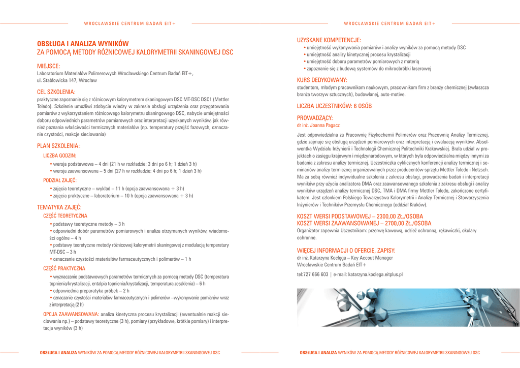 WROCŁAWSKIE CENTRUM BADAŃ EIT+ OBSŁUGA I ANALIZA WYNIKÓW ZA POMOCĄ METODY RÓŻNICOWEJ KALORYMETRII SKANINGOWEJ DSC MIEJSCE: WROCŁAWSKIE CENTRUM BADAŃ EIT+ UZYSKANE KOMPETENCJE: • umiejętność wykonywania pomiarów i analizy wyników za pomocą metody DSC • umiejętność analizy kinetycznej procesu krystalizacji • umiejętność doboru parametrów pomiarowych z materią • zapoznanie się z budową systemów do mikroobróbki laserowej Laboratorium Materiałów Polimerowych Wrocławskiego Centrum Badań EIT+, ul. Stabłowicka 147, Wrocław KURS DEDYKOWANY: CEL SZKOLENIA: studentom, młodym pracownikom naukowym, pracownikom firm z branży chemicznej (zwłaszcza branża tworzyw sztucznych), budowlanej, auto-motive. praktyczne zapoznanie się z różnicowym kalorymetrem skaningowym DSC MT-DSC DSC1 (Mettler Toledo). Szkolenie umożliwi zdobycie wiedzy w zakresie obsługi urządzenia oraz przygotowania pomiarów z wykorzystaniem różnicowego kalorymetru skaningowego DSC, nabycie umiejętności doboru odpowiednich parametrów pomiarowych oraz interpretacji uzyskanych wyników, jak również poznania właściwości termicznych materiałów (np. temperatury przejść fazowych, oznaczanie czystości, reakcje sieciowania) PLAN SZKOLENIA: LICZBA GODZIN: • wersja podstawowa – 4 dni (21 h w rozkładzie: 3 dni po 6 h; 1 dzień 3 h) • wersja zaawansowana – 5 dni (27 h w rozkładzie: 4 dni po 6 h; 1 dzień 3 h) PODZIAŁ ZAJĘĆ: • zajęcia teoretyczne – wykład – 11 h (opcja zaawansowana + 3 h) • zajęcia praktyczne – laboratorium – 10 h (opcja zaawansowana + 3 h) TEMATYKA ZAJĘĆ: CZĘŚĆ TEORETYCZNA • podstawy teoretyczne metody – 3 h • odpowiedni dobór parametrów pomiarowych i analiza otrzymanych wyników, wiadomości ogólne – 4 h • podstawy teoretyczne metody różnicowej kalorymetrii skaningowej z modulacją temperatury MT-DSC – 3 h • oznaczanie czystości materiałów farmaceutycznych i polimerów – 1 h CZĘŚĆ PRAKTYCZNA • wyznaczanie podstawowych parametrów termicznych za pomocą metody DSC (temperatura topnienia/krystalizacji, entalpia topnienia/krystalizacji, temperatura zeszklenia) – 6 h • odpowiednia preparatyka próbek – 2 h • oznaczanie czystości materiałów farmaceutycznych i polimerów –wykonywanie pomiarów wraz z interpretacją (2 h) LICZBA UCZESTNIKÓW: 6 OSÓB PROWADZĄCY: dr inż. Joanna Pagacz Jest odpowiedzialna za Pracownię Fizykochemii Polimerów oraz Pracownię Analizy Termicznej, gdzie zajmuje się obsługą urządzeń pomiarowych oraz interpretacją i ewaluacją wyników. Absolwentka Wydziału Inżynierii i Technologii Chemicznej Politechniki Krakowskiej. Brała udział w projektach o zasięgu krajowym i międzynarodowym, w których była odpowiedzialna między innymi za badania z zakresu analizy termicznej. Uczestniczka cyklicznych konferencji analizy termicznej i seminariów analizy termicznej organizowanych przez producentów sprzętu Mettler Toledo i Netzsch. Ma za sobą również indywidualne szkolenia z zakresu obsługi, prowadzenia badań i interpretacji wyników przy użyciu analizatora DMA oraz zaawansowanego szkolenia z zakresu obsługi i analizy wyników urządzeń analizy termicznej DSC, TMA i DMA firmy Mettler Toledo, zakończone certyfikatem. Jest członkiem Polskiego Towarzystwa Kalorymetrii i Analizy Termicznej i Stowarzyszenia Inżynierów i Techników Przemysłu Chemicznego (oddział Kraków). KOSZT WERSI PODSTAWOWEJ – 2300,00 ZŁ./OSOBA KOSZT WERSI ZAAWANSOWANEJ – 2700,00 ZŁ./OSOBA Organizator zapewnia Uczestnikom: przerwę kawową, odzież ochronną, rękawiczki, okulary ochronne. WIĘCEJ INFORMACJI O OFERCIE, ZAPISY: dr inż. Katarzyna Koclęga – Key Accout Manager Wrocławskie Centrum Badań EIT+ tel:727 666 603 | e-mail: katarzyna.koclega.eitplus.pl OPCJA ZAAWANSOWANA: analiza kinetyczna procesu krystalizacji (ewentualnie reakcji sieciowania np.) – podstawy teoretyczne (3 h), pomiary (przykładowe, krótkie pomiary) i interpretacja wyników (3 h) OBSŁUGA I ANALIZA WYNIKÓW ZA POMOCĄ METODY RÓŻNICOWEJ KALORYMETRII SKANINGOWEJ DSC OBSŁUGA I ANALIZA WYNIKÓW ZA POMOCĄ METODY RÓŻNICOWEJ KALORYMETRII SKANINGOWEJ DSC