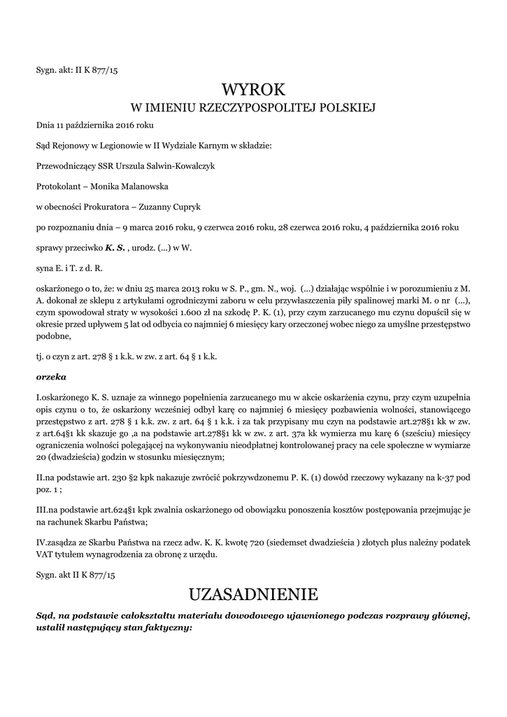 Sygn. akt: II K 877/15 WYROK W IMIENIU RZECZYPOSPOLITEJ POLSKIEJ Dnia 11 października 2016 roku Sąd Rejonowy w Legionowie w II Wydziale Karnym w składzie: Przewodniczący SSR Urszula Salwin-Kowalczyk Protokolant – Monika Malanowska w obecności Prokuratora – Zuzanny Cupryk po rozpoznaniu dnia – 9 marca 2016 roku, 9 czerwca 2016 roku, 28 czerwca 2016 roku, 4 października 2016 roku sprawy przeciwko K. S. , urodz. (...) w W. syna E. i T. z d. R. oskarżonego o to, że: w dniu 25 marca 2013 roku w S. P., gm. N., woj. (...) działając wspólnie i w porozumieniu z M. A. dokonał ze sklepu z artykułami ogrodniczymi zaboru w celu przywłaszczenia piły spalinowej marki M. o nr (...), czym spowodował straty w wysokości 1.600 zł na szkodę P. K. (1), przy czym zarzucanego mu czynu dopuścił się w okresie przed upływem 5 lat od odbycia co najmniej 6 miesięcy kary orzeczonej wobec niego za umyślne przestępstwo podobne, tj. o czyn z art. 278 § 1 k.k. w zw. z art. 64 § 1 k.k. orzeka I.oskarżonego K. S. uznaje za winnego popełnienia zarzucanego mu w akcie oskarżenia czynu, przy czym uzupełnia opis czynu o to, że oskarżony wcześniej odbył karę co najmniej 6 miesięcy pozbawienia wolności, stanowiącego przestępstwo z art. 278 § 1 k.k. zw. z art. 64 § 1 k.k. i za tak przypisany mu czyn na podstawie art.278§1 kk w zw. z art.64§1 kk skazuje go ,a na podstawie art.278§1 kk w zw. z art. 37a kk wymierza mu karę 6 (sześciu) miesięcy ograniczenia wolności polegającej na wykonywaniu nieodpłatnej kontrolowanej pracy na cele społeczne w wymiarze 20 (dwadzieścia) godzin w stosunku miesięcznym; II.na podstawie art. 230 §2 kpk nakazuje zwrócić pokrzywdzonemu P. K. (1) dowód rzeczowy wykazany na k-37 pod poz. 1 ; III.na podstawie art.624§1 kpk zwalnia oskarżonego od obowiązku ponoszenia kosztów postępowania przejmując je na rachunek Skarbu Państwa; IV.zasądza ze Skarbu Państwa na rzecz adw. K. K. kwotę 720 (siedemset dwadzieścia ) złotych plus należny podatek VAT tytułem wynagrodzenia za obronę z urzędu. Sygn. akt II K 877/15 UZASADNIENIE Sąd, na podstawie całokształtu materiału dowodowego ujawnionego podczas rozprawy głównej, ustalił następujący stan faktyczny: W dniu 25 marca 2013 r. oskarżony K. S. wraz z M. A. przyjechali do sklepu i serwisu narzędzi ogrodniczych w S. P. na ul. (...), należącego do P. K. (1). M. A. wszedł do sklepu i zapytał o możliwość zaostrzenia łańcucha do piły. Po chwili do sklepu wszedł oskarżony. Wówczas M. A. wyszedł do samochodu po łańcuch. Po chwili wrócił i wskazał oskarżonemu jedną z pił , które stały na wystawie . Sam zaś podszedł do pokrzywdzonego z łańcuchem do zaostrzenia. W tym czasie oskarżony , zabrał z wystawy piłę spalinową marki M. o wartości 1.600 złotych. M. A. zaostrzył łańcuch i wrócił do samochodu , w którym czekał na niego oskarżony. Następnie pojechali do M. A. do domu , gdzie użyli w/w piły do cięcia drewna. Pokrzywdzony P. K. (2) ujawnił kradzież piły dopiero w dniu 3 kwietnia 2013 r. i w dniu tym zawiadomił o zdarzeniu Policję. M. A. w dniu 4 kwietnia 2013 r. zgłosił się dobrowolnie do Komisariatu Policji w N. , gdzie zwrócił skradzioną piłę pokrzywdzonemu . Była ona jednak bardzo zniszczona. W dniu 14 lutego 2016 roku oskarżony K. S. zapłacił pokrzywdzonemu kwotę 1.000 złotych tytułem naprawienia wyrządzonej mu szkody. Oskarżony K. S. był skazany za czyn z art. 286 § 1 k.k. w zb. z art. 270 § 1 k.k. w zw. z art. 11 § 2 k.k. wyrokiem z dnia 28 sierpnia 2008 r. Sądu Rejonowego dla m.st. Warszawy, na karę 1 roku i 3 miesięcy pozbawienia wolności. Karę tą odbył w okresie od dnia 30.06.2008 r. do dnia 1.08.2008 r. i od dnia 10.09.2009 r. do dnia 8.09.2010 r. Powyższy stan faktyczny ,Sąd ustalił w oparciu o : zeznania pokrzywdzonego P. K. (1) (k.4-5,165,235-236,417-418), częściowo zeznania M. świadka A. (k. 32v-33,70v,165-166,260-262,418-419), nagranie /k-13a,477/ protokół przeszukania (k.15-16),protokół zatrzymania rzeczy (k.21-23), protokół oględzin (k.25-26),dokumentacja fotograficzna (k.24),protokół okazania (k.59-60), pokwitowanie (k.61),protokół oględzin (k.63-64), odpis wyroku (k-77-78),odpis postanowienia (k.263-264), opinie (k-270-273,373-376),382-384,424-428),porozumienie (k-475). Oskarżony K. S. słuchany zarówno w toku postępowania przygotowawczego , jak i na rozprawie przed Sądem nie przyznał się do popełnienia zarzucanego mu czynu . Wyjaśnił , że M. A. , którego poznał przez znajomych , zaproponował mu pracę przy przewozie podkładów kolejowych i ich rąbaniu. Dziennie zarabiał około 100 zł. W dniu zdarzenia M. A. przyjechał po niego i powiedział, że pojadą do znajomych jego ojca, aby wymienić sprzęt. M. A. wszedł sam do sklepu , po czym zadzwonił do niego i poprosił go, by przyniósł piłę z samochodu do naostrzenia. Oskarżony dał ją pracownikowi do zaostrzenia, a w tym czasie M. A. wchodził i wychodził ze sklepu. W którymś momencie powiedział oskarżonemu , żeby zabrał wskazaną przez niego piłę , która była w magazynku. Następnie pojechali do M. A. , gdzie wykorzystali ją do cięcia drewna. Za jakiś czas zadzwoniła do M. A. jego matka , mówiąc że jest u niej Policja w związku z kradzieżą przedmiotowej piły. Oskarżony kazał więc M. A. odwieźć ją na Komisariat Policji w N. . Oskarżony wyjaśnił nadto , że nie zdziwiło go , że w/w kazał mu wziąć ze sklepu piłę mimo , że za na nią nie zapłacił , albowiem „podkłady kolejowe też brali , a płacili za nie za parę dni”. W jego ocenie sytuacja materialna M. A. była na tyle dobra , że wykluczała jakąkolwiek kradzież /k53-54,235,416-417/. Sąd zważył , co następuje : Materiał dowodowy zgromadzony w przedmiotowej sprawie , dał podstawy do uznania oskarżonego winnym popełnienia zarzucanego mu czynu. Co prawda oskarżony nie przyznał się do winy , jed