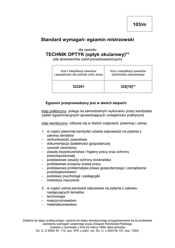 103/m Standard wymagań- egzamin mistrzowski dla zawodu TECHNIK OPTYK (optyk okularowy)** (dla absolwentów szkół ponadzasadniczych) Kod z klasyfikacji zawodów i specjalności dla potrzeb rynku pracy Kod z klasyfikacji zawodów szkolnictwa zawodowego 322201 322[16]** Egzamin przeprowadzany jest w dwóch etapach: etap praktyczny: polega na samodzielnym wykonaniu przez kandydata zadań egzaminacyjnych sprawdzających umiejętności praktyczne etap teoretyczny: odbywa się w dwóch częściach; pisemnej i ustnej 1. w części pisemnej kandydat udziela odpowiedzi na pytania z zakresu tematów: - rachunkowość zawodowa - dokumentacja działalności gospodarczej - rysunek zawodowy - zasady bezpieczeństwa i higieny pracy oraz ochrony przeciwpożarowej - podstawowe zasady ochrony środowiska - podstawowe przepisy prawa pracy - podstawowa problematyka prawa gospodarczego i zarządzania przedsiębiorstwem - podstawy psychologii i pedagogiki - metodyka nauczania 2. w części ustnej kandydat odpowiada na pytania z zakresu następujących tematów: - technologia - maszynoznawstwo - materiałoznawstwo Zadania do etapu praktycznego i pytania do etapu teoretycznego przygotowywane są na podstawie standardu wymagań ustalonego przez Związek Rzemiosła Polskiego (Ustawa o rzemiośle z dnia 22 marca 1989, tekst jednolity: Dz. U. Z 2002r Nr 112, poz. 979, z późn. zm. Dz. U. z 2003 Nr 137, poz. 1304) Zawód: technik optyk (optyk okularowy) I. Etap teoretyczny (część pisemna i ustna) egzaminu obejmuje: Zakres wiadomości i umiejętności właściwych dla kwalifikacji w zawodzie Kandydat na mistrza powinien umieć: 1. Czytać ze zrozumieniem informacje przedstawione w formie opisów, instrukcji, rysunków, szkiców, wykresów, dokumentacji technicznych i technologicznych, a w szczególności: 1.1. znać i stosować nazwy i pojęcia właściwe dla optyki okularowej; 1.2. znać budowę i podstawy funkcjonowania układu wzrokowego; 1.3. znać wady refrakcji, sposoby ich pomiaru metodami obiektywnymi i subiektywnymi oraz sposoby korekcji wad refrakcji; 1.4. znać podstawowe zaburzenia widzenia obuocznego, metody i sposoby ich pomiaru oraz sposoby ich korekcji; 1.5. znać sposoby zapisu wyników pomiaru refrakcji; 1.6. znać właściwości i rozpoznawać rodzaje szkieł mineralnych i organicznych oraz materiałów do produkcji szkieł okularowych i opraw okularowych; 1.7. znać nazwy i pojęcia stosowane przez producentów materiałów i urządzeń stosowanych w branży; 1.8. rozpoznawać symbole i oznaczenia dotyczące pomocy wzrokowych. 2. Przetwarzać dane liczbowe i operacyjne, a w szczególności: 2.1. stosować odpowiednie sposoby obróbki w zależności od rodzajów materiałów; 2.2. dobierać właściwe narzędzia obróbkowe i pomiarowe do wykonywania pomiarów wielkości fizycznych i parametrów anatomicznych; 2.3. przeprowadzać pomiary konieczne do wykonania właściwych pomocy wzrokowych; 2.4. obliczyć właściwe parametry pomocy wzrokowych; 2.5. stosować właściwe normy dopuszczalnych błędów wykonania. 3. Bezpiecznie wykonywać zadania zawodowe zgodnie z przepisami bezpieczeństwa i higieny pracy, ochrony przeciwpożarowej oraz ochrony środowiska, a w szczególności: 3.1. stosować przepisy bezpieczeństwa i higieny pracy, ochrony przeciwpożarowej i ochrony środowiska; 3.2. wskazywać zagrożenia związane z wykonywanymi czynnościami; 3.3. dobierać środki ochrony indywidualnej właściwych dla wykonywanych czynności; 3.4. znać i umieć zastosować sposoby udzielania pierwszej pomocy w nagłych przypadkach. Zakres wiadomości i umiejętności związanych z zatrudnieniem i działalnością gospodarczą Kandydat na mistrza powinien umieć: 1. Czytać ze zrozumieniem informacje przedstawione w formie opisu, instrukcji, tabeli, wykresu, w szczególności: 1.1. rozróżniać podstawowe pojęcia i terminy z obszaru funkcjonowania gospodarki oraz prawa pracy, prawa podatkowego i przepisów regulujących podejmowanie i wykonywanie działalności gospodarczej; 1.2. rozróżniać dokumenty regulujące zatrudnienie oraz działalność gospodarczą; 1.3. identyfikować i analizować informacje dotyczące wymagań i uprawnień pracownika, pracodawcy, bezrobotnego i klienta; 1.4. wykorzystywać informacje dotyczące sposobu zarządzania małą firmą i znać zasady organizacji pracy; 1.5. znać zasady normowania pracy i systemu płac; 1.6. wykorzystywać podstawowe wiadomości dotyczące gospodarki rynkowej; 1.7. wypełniać druki rejestracyjne i rozliczeniowe ZUS i deklaracje podatkowe; 1.8. korzystać ze źródeł wiedzy ekonomicznej i prawnej; 1.9. znać podstawowe przepisy prawne i zarządzenia wykonawcze wynikające z kodeksu pracy; 1.10. posiadać wiedzę dotyczącą przepisów określających zatrudnienie i szkolenie praktyczne młodocianych uczniów w zakładzie pracy. 2. Przetwarzać dane liczbowe i operacyjne, w szczególności: 2.1. analizować informacje związane z podnoszeniem kwalifikacji, poszukiwaniem pracy i zatrudnieniem oraz podejmowaniem i wykonywaniem działalności gospodarczej; 2.2. sporządzać dokumenty związane z poszukiwaniem pracy i zatrudnieniem oraz z podejmowaniem i wykonywaniem działalności gospodarczej; 2.3. rozróżniać skutki wynikające z nawiązywania i rozwiązywania stosunku pracy; 2.4. dokonywać rozliczeń i kosztorysowania wykonywanych robót pod względem opłacalności prowadzenia działalności gospodarczej. Podstawy psychologii i pedagogiki oraz metodyka nauczania Kandydat na mistrza powinien posiadać wiadomości i rozumieć procesy a w szczególności: 1. Wyjaśniać i oceniać sytuacje stosując się do opisu zagadnień i problemów w obszarze: 1.1. 1.2. 1.3. 2. psychologii osobowości: 1.1.1. rozumieć rozwój psychiczny człowieka i czynniki na niego wpływające oraz cechy psychiczne osobowości i jej składniki: - charakter i jego cechy, zdolności i uzdolnienia; - zainteresowania i skłonności; - temperament i jego rodzaje. 1.1.2.
