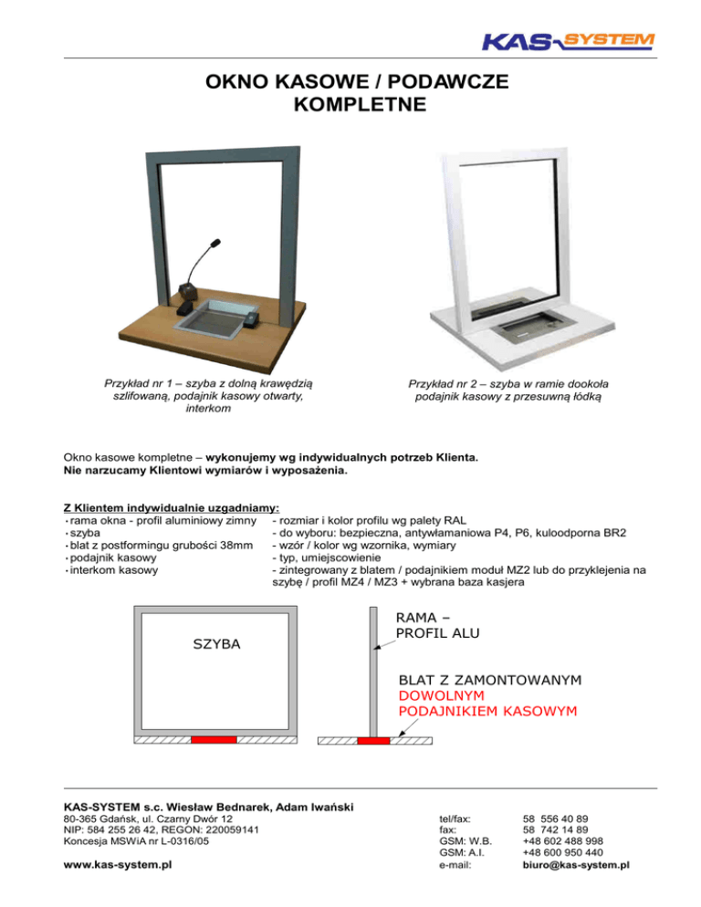 OKNO KASOWE / PODAWCZE KOMPLETNE Przykład nr 1 – szyba z dolną krawędzią szlifowaną, podajnik kasowy otwarty, interkom Przykład nr 2 – szyba w ramie dookoła podajnik kasowy z przesuwną łódką Okno kasowe kompletne – wykonujemy wg indywidualnych potrzeb Klienta. Nie narzucamy Klientowi wymiarów i wyposażenia. Z Klientem indywidualnie uzgadniamy: - rozmiar i kolor profilu wg palety RAL - do wyboru: bezpieczna, antywłamaniowa P4, P6, kuloodporna BR2 - wzór / kolor wg wzornika, wymiary - typ, umiejscowienie - zintegrowany z blatem / podajnikiem moduł MZ2 lub do przyklejenia na szybę / profil MZ4 / MZ3 + wybrana baza kasjera •rama okna - profil aluminiowy zimny •szyba •blat z postformingu grubości 38mm •podajnik kasowy •interkom kasowy RAMA – PROFIL ALU SZYBA BLAT Z ZAMONTOWANYM DOWOLNYM PODAJNIKIEM KASOWYM KAS-SYSTEM s.c. Wiesław Bednarek, Adam Iwański 80-365 Gdańsk, ul. Czarny Dwór 12 NIP: 584 255 26 42, REGON: 220059141 Koncesja MSWiA nr L-0316/05 www.kas-system.pl tel/fax: fax: GSM: W.B. GSM: A.I. e-mail: 58 556 40 89 58 742 14 89 +48 602 488 998 +48 600 950 440 [email protected] WITRYNA KASOWA / PODAWCZA Witryna kasowa / podawcza wykonywana wg indywidualnych potrzeb Klienta: Z Klientem każdorazowo uzgadniamy: • miejsce instalacji witryny: • profil aluminiowy: • szyba: • podajnik szufladowy: • opcjonalny blat wewnętrzny: • interkom kasowy: wewnętrzna czy zewnętrzna wymiary, podział (przeszklenie / panel) i kolor profilu i panelu do wyboru: bezpieczna, antywłamaniowa P4, kuloodporna BR2 typ, kolor, umiejscowienie kolor / wzór rodzaj, umiejscowienie modułu zewnętrznego (wbudowany w podajnik lub wyprowadzony na zewnątrz – za pomocą modułu MZ2, MZ3 / MZ4 – do wyboru) KAS-SYSTEM s.c. Wiesław Bednarek, Adam Iwański 80-365 Gdańsk, ul. Czarny Dwór 12 NIP: 584 255 26 42, REGON: 220059141 Koncesja MSWiA nr L-0316/05 www.kas-system.pl tel/fax: fax: GSM: W.B. GSM: A.I. e-mail: 58 556 40 89 58 742 14 89 +48 602 488 998 +48 600 950 440 [email protected] NOWOŚĆ OKNO kasowe z obniżonym stanowiskiem DO OBSŁUGI OSÓB NIEPEŁNOSPRAWNYCH NA WÓZKU. Opracowaliśmy okno kasowe / podawcze umożliwiającą wygodną obsługę osób na wózku inwalidzkim. Obok blatu głównego z podajnikiem kasowym instaluje się obniżony moduł z podajnikiem szufladowym do obsługi osób na wózku inwalidzkim. Okna wykonujemy śćiśle wg potrzeb Klienta: • Wymiary okna – do uzgodnienia (szerokośc minimum 1000mm) • Obniżenie podajnika szufladowego w stosunku do poziomu blatu głównego – do uzgodnienia (minimum 100mm) • Umiejscowienie obniżónego modułu względem blatu głównego (po prawej, po lewej) – do uzgodnienia • Typ i rodzaj podajnika kasowego w blacie głównym oraz typ podajniksza szufladowego w obniżonym module – do wyboru z naszej oferty podajników. • Interkom kasowy zamontowany przy blacie głównym + dodatkowy mikrofon przy module dla niepełnosprawnych. • • • • Opcjonalnie – interkom z pętlą indukcyjną dla osób niedosłyszących Kolor ramy (profilu), kolor / wzór blatu, kolor podajnika szufladowego – do uzgodnienia Szklenie – pojedyncze lub zespolone, szyby bezpieczne i antywłamaniowe klasy P4 – do uzgodnienia Dostawa w dowolne miejsce w Polsce KAS-SYSTEM s.c. Wiesław Bednarek, Adam Iwański 80-365 Gdańsk, ul. Czarny Dwór 12 NIP: 584 255 26 42, REGON: 220059141 Koncesja MSWiA nr L-0316/05 www.kas-system.pl tel/fax: fax: GSM: W.B. GSM: A.I. e-mail: 58 556 40 89 58 742 14 89 +48 602 488 998 +48 600 950 440 [email protected]