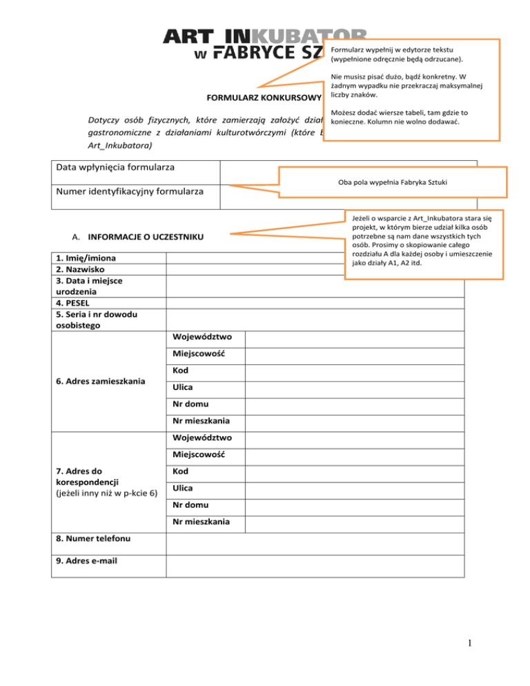 Formularz wypełnij w edytorze tekstu (wypełnione odręcznie będą odrzucane). FORMULARZ KONKURSOWY Nie musisz pisać dużo, bądź konkretny. W żadnym wypadku nie przekraczaj maksymalnej liczby znaków. Możesz dodać wiersze tabeli, tam gdzie to Dotyczy osób fizycznych, które zamierzają założyć działalność gospodarczą łączącą funkcje konieczne. Kolumn nie wolno dodawać. gastronomiczne z działaniami kulturotwórczymi (które będą zgodne z profilem działalności Art_Inkubatora) Data wpłynięcia formularza Oba pola wypełnia Fabryka Sztuki Numer identyfikacyjny formularza A. INFORMACJE O UCZESTNIKU 1. Imię/imiona 2. Nazwisko 3. Data i miejsce urodzenia 4. PESEL 5. Seria i nr dowodu osobistego Jeżeli o wsparcie z Art_Inkubatora stara się projekt, w którym bierze udział kilka osób potrzebne są nam dane wszystkich tych osób. Prosimy o skopiowanie całego rozdziału A dla każdej osoby i umieszczenie jako działy A1, A2 itd. Województwo Miejscowość Kod 6. Adres zamieszkania Ulica Nr domu Nr mieszkania Województwo Miejscowość 7. Adres do korespondencji (jeżeli inny niż w p-kcie 6) Kod Ulica Nr domu Nr mieszkania 8. Numer telefonu 9. Adres e-mail 1 10. Status Uczestnika na rynku pracy (zaznaczyć wszystkie, które dotyczą wpisując X w odpowiedniej kratce) Osoba: zatrudniona na umowę o pracę zatrudniona na umowy cywilnoprawne niezatrudniona prowadząca działalność gospodarczą Aby zakreślić pole kliknij na nie prawym klawiszem, wybierz WŁAŚCIWOŚCI i zaznacz Wartość domyślna: Zaznaczone Bezrobotny (osoba zarejestrowana w Powiatowym Urzędzie Pracy): bezrobotny Osoba ucząca się/ studiująca: dziennie wieczorowo zaocznie W konkursie mogą brać udział osoby fizyczne jak i mikroprzedsiębiorstwa działające nie dłużej niż 365 dni (osobny formularz). Możesz dodać wiersze tabeli. 11. Wykształcenie: (zaznaczyć właściwe wpisując X w odpowiedniej kratce) Nazwa szkoły/uczelni Wydział, kierunek średnie ogólnokształcące brak średnie zawodowe podstawowe wyższe zawodowe (w tym gimnazjalne licencjat) zasadnicze zawodowe wyższe magisterskie Okres nauki Uzyskany stopień, dyplom, w latach od..... – do ……. np. 2 Interesują nas wszystkie doświadczenia zawodowe, zarówno te formalne jak i różnego rodzaju wolontariaty czy staże, które w sposób znaczący 12. Doświadczenie zawodowe (w tym: praca, praktyki, wolontariaty,powiększyły staże) wasze doświadczenie zawodowe. W polu Rodzaj wykonywanej pracy opisz krótko czym się zajmowałeś/aś. Możesz dodać wiersze tabeli. Forma Lp. Rodzaj wykonywanej pracy termin pracy/współpracy pracodawca 1. 2. 13. Doświadczenie w prowadzeniu działalności gospodarczej (podać nazwę i rodzaj działalności) maksymalnie 500 znaków Jeśli kiedykolwiek wcześniej prowadziłeś lub współprowadziłeś działalność gospodarczą opisz krótko to doświadczenie. 14. Pozostałe kwalifikacje – certyfikaty/ukończone szkolenia/kursy/uzyskane uprawnienia Lp. Nazwa szkolenia/kursu Data odbycia (dzień/ m-c/rok) Nazwa organizatora Uzyskane kwalifikacje/ uprawnienia 1. 2. 3. 4. 5. 3 Być może udało Ci się wygrać jakieś konkursy, wystąpić lub prezentować Twoje projekty w ciekawym miejscu. Możesz dodać wiersze w tabeli. 15. Osiągnięcia w branży, w której Pan/Pani planuje działalność Lp. Nazwa osiągnięcia Data (dzień/m-c/rok) Nazwa organizatora 1. 2. 3. 4. 5. 16. Czy korzystał/a Pan/Pani ze środków publicznych? (np. dotacja UE, staż z Urzędu Pracy, „dotacja” na otwarcie działalności gospodarczej) (zaznaczyć właściwe wpisując X w odpowiedniej kratce) Jeśli korzystałeś z dotacji upewnij się, że możesz jeszcze otrzymać pomoc de minimis w zakresie w jakim świadczy ją Art_Inkubator. tak Z jakiego rodzaju środków? ………………………………………………………………………………. Czy korzystanie ze środków publicznych było pomocą de minimis? Jeśli tak to w jakiej kwocie? ....................................................................... nie B. OPIS PLANOWANEGO PRZEDSIĘWZIĘCIA REALIZOWONEGO W RAMACH ART_INKUBATORA 1. Opis planowanej działalności. Rodzaj świadczonych usług /tworzonych produktów (maksymalna ilość znaków 2000) Opisz Twój pomysł na biznes. Kolejne pytania służą pogłębieniu opisu. 2. Opis i przykłady proponowanej działalności gospodarczej łączącej funkcje gastronomiczne z działaniami kulturotwórczymi (które będą zgodne z profilem działalności Art_Inkubatora) Opisz Twój pomysł na działania kulturalne / artystyczne, które zamierzasz realizować równolegle z działalnością gastronomiczną. Podaj konkretne przykłady działań np. konkretny rodzaj wydarzeń wraz z nazwiskami osób lub podmiotów zaangażowanych w daną realizację. Mogą to być min.: koncerty, spotkania, wystawy, debaty, etc. 4 3. Forma prawna planowanej działalności, ewentualne pozwolenia wymagane dla planowanej działalności. Do ART_INKUBATORA mogą zgłosić się osoby fizyczne i mikroprzedsiębiorstwa. Będąc już rezydentem ART_INKUBATORA można natomiast założyć inny rodzaj działalności lub dokonać przekształcenia. 4. Opis docelowych odbiorców produktów/usług wraz z uzasadnieniem (maksymalna ilość znaków 1000) 5. Opis konkurencji na rynku wraz z uzasadnieniem (maksymalna ilość znaków 1000) Jak dobrze znasz rynek, na którym zamierzasz działać? 6. Słabe i mocne strony proponowanej działalności (maksymalna ilość znaków 1000) Np. Zgodnie z analizą SWOT 7. Jakie posiadane już zasoby planowane są do zaangażowania w proponowaną działalność gospodarczą (prosimy wskazać zasoby, które zostaną wykorzystane w proponowanej działalności np. laptop, samochód lub inne; proszę określić szacunkową wartość ww. Chodzi o zasoby, zaangażowanie które już posiadasz, w zasobów)? Należy podać podstawę oszacowania wartości oraz uzasadnić tym przedmioty i pieniądze. Najlepiej