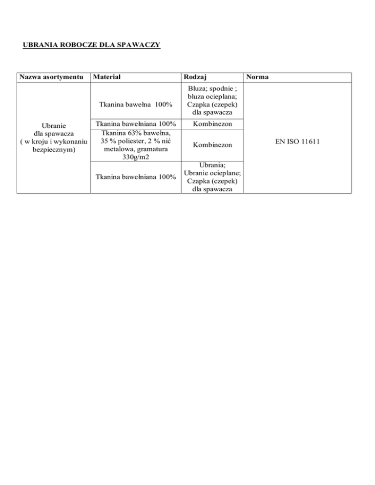 UBRANIA ROBOCZE DLA SPAWACZY Nazwa asortymentu Materiał Tkanina bawełna 100% Ubranie dla spawacza ( w kroju i wykonaniu bezpiecznym) Tkanina bawełniana 100% Tkanina 63% bawełna, 35 % poliester, 2 % nić metalowa, gramatura 330g/m2 Tkanina bawełniana 100% Rodzaj Norma Bluza; spodnie ; bluza ocieplana; Czapka (czepek) dla spawacza Kombinezon Kombinezon Ubrania; Ubranie ocieplane; Czapka (czepek) dla spawacza EN ISO 11611