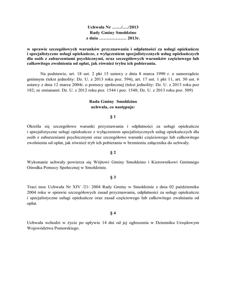 Uchwała Nr ……/.…/2013 Rady Gminy Smołdzino z dnia ……………… 2013r. w sprawie szczegółowych warunków przyznawania i odpłatności za usługi opiekuńcze i specjalistyczne usługi opiekuńcze, z wyłączeniem specjalistycznych usług opiekuńczych dla osób z zaburzeniami psychicznymi, oraz szczegółowych warunków częściowego lub całkowitego zwolnienia od opłat, jak również trybu ich pobierania. Na podstawie, art. 18 ust. 2 pkt 15 ustawy z dnia 8 marca 1990 r. o samorządzie gminnym (tekst jednolity: Dz. U. z 2013 roku poz. 594), art. 17 ust. 1 pkt 11, art. 50 ust. 6 ustawy z dnia 12 marca 2004r. o pomocy społecznej (tekst jednolity: Dz. U. z 2013 roku poz 182; ze zmianami: Dz. U. z 2012 roku poz. 1544 i poz. 1548; Dz. U. z 2013 roku poz. 509) Rada Gminy Smołdzino uchwala, co następuje: §1 Określa się szczegółowe warunki przyznawania i odpłatności za usługi opiekuńcze i specjalistyczne usługi opiekuńcze z wyłączeniem specjalistycznych usług opiekuńczych dla osób z zaburzeniami psychicznymi oraz szczegółowe warunki częściowego lub całkowitego zwolnienia od opłat, jak również tryb ich pobierania w brzmieniu załącznika do uchwały. §2 Wykonanie uchwały powierza się Wójtowi Gminy Smołdzino i Kierownikowi Gminnego Ośrodka Pomocy Społecznej w Smołdzinie. §3 Traci moc Uchwała Nr XIV /21/ 2004 Rady Gminy w Smołdzinie z dnia 02 października 2004 roku w sprawie szczegółowych zasad przyznawania, odpłatności za usługi opiekuńcze i specjalistyczne usługi opiekuńcze oraz zasad częściowego lub całkowitego zwalniania od opłat. §4 Uchwała wchodzi w życie po upływie 14 dni od jej ogłoszenia w Dzienniku Urzędowym Województwa Pomorskiego. Załącznik Nr 1 do Uchwały Nr ………. Rady Gminy Smołdzino z dnia ................ 2013 r. SZCZEGÓŁOWE WARUNKI PRZYZNAWANIA I ODPŁATNOŚCI ZA USŁUGI OPIEKUŃCZE I SPECJALISTYCZNE USŁUGI OPIEKUŃCZE, Z WYŁĄCZENIEM SPECJALISTYCZNYCH USŁUG OPIEKUŃCZYCH DLA OSÓB Z ZABURZENIAMI PSYCHICZNYMI, ORAZ SZCZEGÓŁOWE WARUNKI CZĘŚCIOWEGO LUB CAŁKOWITEGO ZWOLNIENIA OD OPŁAT, JAK RÓWNIEŻ TRYB ICH POBIERANIA §1 POSTAWNOWIENIA OGÓLNE 1. Niniejszy dokument nie ma zastosowania do specjalistycznych usług opiekuńczych dla osób z zaburzeniami psychicznymi. 2. Pomoc w formie usług opiekuńczych i specjalistycznych usług opiekuńczych, zwanych dalej „usługami”, przeznaczona jest dla mieszkańców Gminy Smołdzino, przede wszystkim dla osób samotnych, które z powodu wieku, choroby lub innych przyczyn wymagają pomocy ze strony innych osób, a także dla osób w rodzinie, gdy rodzina, a także wspólnie niezamieszkujący małżonek, wstępni i zstępni, takiej pomocy nie może zapewnić. 3. Usługi dostosowane są do potrzeb wynikających z wieku świadczeniobiorcy, jej niepełnosprawności, choroby lub innych przyczyn. 4. Usługi organizuje i przyznaje Gminny Ośrodek Pomocy Społecznej w Smołdzinie, uwzględniając zgłoszone potrzeby i możliwości ich realizacji (finansowe, osobowe, etc.) §2 USŁUGI OPIEKUŃCZE 1. Usługi opiekuńcze obejmują pomoc w zaspokajaniu codziennych potrzeb życiowych, opiekę higieniczną, zaleconą przez lekarza pielęgnację oraz, w miarę możliwości, zapewnienie kontaktów z otoczeniem. 2. Do czynności mających na celu zaspokajanie codziennych potrzeb życiowych podopiecznego należy w szczególności: a) utrzymanie czystości w pomieszczeniach osoby wymagającej opieki, b) przygotowywanie posiłków dla osoby wymagającej opieki z uwzględnieniem diety, c) zaopatrzenie w artykuły spożywcze i niezbędne artykuły przemysłowe, d) utrzymanie w czystości sprzętu sanitarnego, e) pranie bielizny osobistej i pościelowej (u osób samotnych), f) palenie w piecu, g) zamawianie wizyt lekarskich i realizacja recept, h) załatwianie spraw urzędowych. 3. Do czynności pielęgnacyjnych należy w szczególności: a) dbanie o higienę osobistą podopiecznego, b) zapobieganie powstawaniu odleżyn i odparzeń, c) wykonywanie czynności zleconych przez lekarza, d) współuczestniczenie w rehabilitacji podopiecznego. 4. W celu zapewnienia kontaktów podopiecznego z otoczeniem do obowiązków osób świadczących usługi opiekuńcze należy w szczególności: a) podtrzymywanie indywidualnych zainteresowań podopiecznego, b) organizowanie i podtrzymywanie kontaktów sąsiedzkich. §3 SPECJALISTYCZNE USŁUGI OPIEKUŃCZE 1. Specjalistyczne usługi opiekuńcze są to usługi dostosowane do szczególnych potrzeb wynikających z rodzaju schorzenia lub niepełnosprawności. 2. Specjalistyczne usługi opiekuńcze świadczone są przez osoby ze specjalistycznym przygotowaniem zawodowym według zasad ustalonych przepisami szczegółowymi. §4 PRZYZNAWANIE USŁUG 1. Usługi przyznawane są na wniosek osoby zainteresowanej, jej przedstawiciela ustawowego, bądź innej osoby, za zgodą osoby zainteresowanej. 2. Usługi mogą być przyznane z urzędu. 3. Przyznanie usług opiekuńczych i specjalistycznych usług opiekuńczych poprzedzone musi być przeprowadzeniem rodzinnego wywiadu środowiskowego, zaświadczeniem lekarskim o potrzebie świadczenia takich usług, jak również przedstawieniem zaświadczenia o dochodach od wszystkich osób prowadzących wspólne gospodarstwo domowe oraz innych potrzebnych dokumentów potrzebnych do wydania decyzji. 4. Gminny Ośrodek Pomocy Społecznej w Smołdzinie wydaje decyzję administracyjną określając miejsce, rodzaj, wymiar dzienny, okres, przez który mają być świadczone usługi, oraz wysokość i tryb pobierania opłat. §5 ODPŁATNOŚĆ 1. Wartość 1 godziny usługi opiekuńczej ustala się jako równowartość 1,5% najniższej emerytury ogłaszanej w formie Komunikatu Prezesa Zakładu Ubezpieczeń Społecznych w Monitorze Polskim od dnia obowiązywania. 2. Cenę 1 godziny specjalistycznych usług opiekuńczych, z wyłączeniem specjalistycznych usług opiekuńczych dla osób z zaburzeniami psychicznymi, ustala Gmi