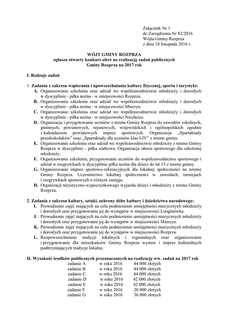 Załącznik Nr 1 do Zarządzenia Nr 82/2016 Wójta Gminy Rozprza z dnia 18 listopada 2016 r. WÓJT GMINY ROZPRZA ogłasza otwarty konkurs ofert na realizację zadań publicznych Gminy Rozprza na 2017 rok I. Rodzaje zadań 1. Zadania z zakresu wspierania i upowszechniania kultury fizycznej, sportu i turystyki: A. Organizowanie szkolenia oraz udział we współzawodnictwie młodzieży i dorosłych w dyscyplinie - piłka nożna - w miejscowości Rozprza. B. Organizowanie szkolenia oraz udział we współzawodnictwie młodzieży i dorosłych w dyscyplinie - piłka nożna - w miejscowości Mierzyn. C. Organizowanie szkolenia oraz udział we współzawodnictwie młodzieży i dorosłych w dyscyplinie - piłka nożna - w miejscowości Niechcice. D. Organizacja i przygotowanie uczniów z terenu Gminy Rozprza do zawodów szkolnych, gminnych, powiatowych, rejonowych, wojewódzkich i ogólnopolskich zgodnie z kalendarzem powiatowych imprez sportowych. Organizacja ,,Spartakiady przedszkolaków” oraz ,,Spartakiady dla uczniów klas I-IV” z terenu gminy. E. Organizowanie szkolenia oraz udział we współzawodnictwie młodzieży z terenu Gminy Rozprza w dyscyplinie - piłka siatkowa. Organizacja obozu sportowego dla szkolonej młodzieży. F. Organizowanie szkolenia, przygotowanie uczniów do współzawodnictwa sportowego i udział w rozgrywkach w dyscyplinie piłka nożna dla dzieci do lat 15 z terenu gminy. G. Organizowanie imprez sportowo-rekreacyjnych dla lokalnej społeczności na terenie Gminy Rozprza. Uczestnictwo lokalnej społeczności w zawodach, turniejach i rozgrywkach sportowych o różnym zasięgu. H. Organizacji turystyczno-wypoczynkowego wyjazdu dzieci i młodzieży z terenu Gminy Rozprza. 2. Zadania z zakresu kultury, sztuki, ochrony dóbr kultury i dziedzictwa narodowego: I. Prowadzenie zajęć mających na celu podniesienie umiejętności muzycznych młodzieży i dorosłych oraz przygotowanie jej do występów w miejscowości Longinówka. J. Prowadzenie zajęć mających na celu podniesienie umiejętności muzycznych młodzieży i dorosłych oraz przygotowanie jej do występów w miejscowości Mierzyn. K. Prowadzenie zajęć mających na celu podniesienie umiejętności muzycznych młodzieży i dorosłych oraz przygotowanie jej do występów w miejscowości Rozprza. L. Rozpowszechnianie tradycji lokalnych i regionalnych oraz organizowanie i przygotowanie dla mieszkańców Gminy Rozprza wystaw i imprez kulturalnych podtrzymujących tradycje lokalne. II. Wysokość środków publicznych przeznaczonych na realizację ww. zadań na 2017 rok zadanie A w roku 2016 44 000 złotych zadanie B w roku 2016 44 000 złotych zadanie C w roku 2016 44 000 złotych zadanie D w roku 2016 42 000 złotych zadanie E w roku 2016 42 000 złotych zadanie F w roku 2016 20 000 złotych zadanie G w roku 2016 36 000 złotych zadanie H zadanie I zadanie J zadanie K zadanie L w roku 2016 w roku 2016 w roku 2016 w roku 2016 w roku 2016 20 000 złotych 19 000 złotych 16 500 złotych 16 500 złotych 20 000 złotych Zastrzega się możliwość zmiany wysokości środków publicznych na poszczególne zadania w przypadku stwierdzenia, że zadanie można zrealizować mniejszym kosztem. III. Zasady przyznawania dotacji 1. Zlecenie zadania i udzielenie dotacji następuje z zastosowaniem przepisów art. 16 ustawy z dnia 24 kwietnia 2003 roku o działalności pożytku publicznego i o wolontariacie. 2. Wysokość dotacji może być niższa niż wnioskowana w ofercie. W takim przypadku oferentowi przysługuje prawo negocjowania zmniejszenia zakresu rzeczowego zadania lub rezygnacji z jego realizacji. 3. Złożenie oferty nie jest równoznaczne z przyznaniem dotacji. 4. Wójt Gminy Rozprza może odmówić podmiotowi wyłonionemu w konkursie przyznania dotacji i podpisania umowy w przypadku, gdy okaże sie, iż podmiot lub jego reprezentanci utracą zdolność do czynności prawnych, zostaną ujawnione nieznane wcześniej okoliczności podważające wiarygodność merytoryczną lub finansową oferenta. 5. Szczegółowe i ostateczne warunki realizacji, finansowania i rozliczania zadania reguluje umowa zawarta między oferentem a Gminą Rozprza. IV. Termin i warunki realizacji zadań: 1. Termin realizacji zadań 1) z zakresu wspierania i upowszechniania kultury fizycznej, sportu i turystyki: od dnia 16.01.2017 r. do dnia 31.12.2017 r. 2) z zakresu kultury, sztuki, ochrony dóbr kultury i dziedzictwa narodowego: od dnia 16.01.2017 r. do dnia 31.12.2017 r. 2. Zlecenie realizacji zadań publicznych Gminy Rozprza na 2017 rok nastąpi poprzez powierzenie organizacjom pozarządowym oraz podmiotom wymienionym w art. 3 ust. 3 ustawy z dnia 24 kwietnia 2003 roku o działalności pożytku publicznego i o wolontariacie wykonywania zadania wraz z udzieleniem dotacji na jego finansowanie. 3. Szczegółowe warunki realizacji, finansowania i rozliczania będzie regulować umowa zawarta pomiędzy Gminą Rozprza a Oferentem, którego oferta zostanie wybrana. V. Termin i miejsce składania ofert: Oferty należy składać w/g wzoru określonego w Rozporządzeniu Ministra Pracy i Polityki Społecznej z dnia 17 sierpnia 2016 r. w sprawie wzorów ofert i ramowych wzorów umów dotyczących realizacji zadań publicznych oraz wzorów sprawozdań z wykonania tych zadań (Dz. U. poz. 1300) wraz z załącznikami pod rygorem odrzucenia oferty, w formie pisemnej, w zamkniętej kopercie z napisem ,,Oferta na realizację zadania publicznego w 2017/ nazwa zadania/numer zadania zgodny z numeracją zawartą w ogłoszeniu” w Urzędzie Gminy w Rozprzy, Al. 900-lecia 3 (pok. nr 13), w terminie do dnia 10.01.2017 r. do godz. 1700. Koperta zawierać musi dane identyfikacyjne oferenta (pieczęć lub odręcznie zapisana nazwa i adres organizacji). Otwarcie ofert nastąpi dnia 11.01.2017 r. o godz. 1000 w sali nr 13 UG w Rozprzy. Do oferty należy dołączyć: 1. Kopia aktualnego odpisu z Krajowego Rejestru Sądowego, innego rejestru lub ewidencji stanowiący o pods