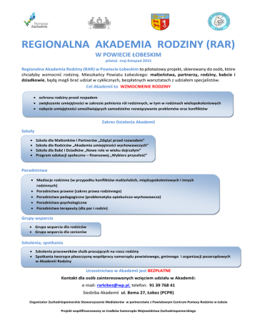 REGIONALNA AKADEMIA RODZINY (RAR) W POWIECIE ŁOBESKIM pilotaż maj-listopad 2015 Regionalna Akademia Rodziny (RAR) w Powiecie Łobeskim to pilotażowy projekt, skierowany do osób, które chciałyby wzmocnić rodzinę. Mieszkańcy Powiatu Łobeskiego: małżeństwa, partnerzy, rodziny, babcie i dziadkowie, będą mogli brać udział w cyklicznych, bezpłatnych warsztatach z udziałem specjalistów. Cel Akademii to WZMOCNIENIE RODZINY ochrona rodziny przed rozpadem zwiększenie umiejętności w zakresie pełnienia ról rodzinnych, w tym w rodzinach wielopokoleniowych nabycie umiejętności umożliwiających samodzielne rozwiązywanie problemów oraz konfliktów Zakres Działania Akademii Szkoły Szkoła dla Małżonków i Partnerów „Zdążyć przed rozwodem” Szkoła dla Rodziców „Akademia umiejętności wychowawczych” Szkoła dla Babć i Dziadków „Nowe role w wieku dojrzałym” Program edukacji społeczno – finansowej „Wybierz przyszłość” Poradnictwo Mediacje rodzinne (w przypadku konfliktów małżeńskich, międzypokoleniowych i innych rodzinnych) Poradnictwo prawne (zakres prawa rodzinnego) Poradnictwo pedagogiczne (problematyka opiekuńczo-wychowawcza) Poradnictwo psychologiczne Poradnictwo terapeuty (dla par i rodzin) Grupy wsparcia Grupa wsparcia dla rodziców Grupa wsparcia dla seniorów Szkolenia, spotkania Szkolenia pracowników służb pracujących na rzecz rodziny Spotkania tworzące płaszczyznę współpracy samorządu powiatowego, gminnego i organizacji pozarządowych w Akademii Rodziny Uczestnictwo w Akademii jest BEZPŁATNE Kontakt dla osób zainteresowanych wzięciem udziału w Akademii: e-mail: [email protected], telefon: 91 39 768 41 Siedziba Akademii ul. Bema 27, Łobez (PCPR) Organizator Zachodniopomorskie Stowarzyszenie Mediatorów w partnerstwie z Powiatowym Centrum Pomocy Rodzinie w Łobzie Projekt współfinansowany ze środków Samorządu Województwa Zachodniopomorskiego