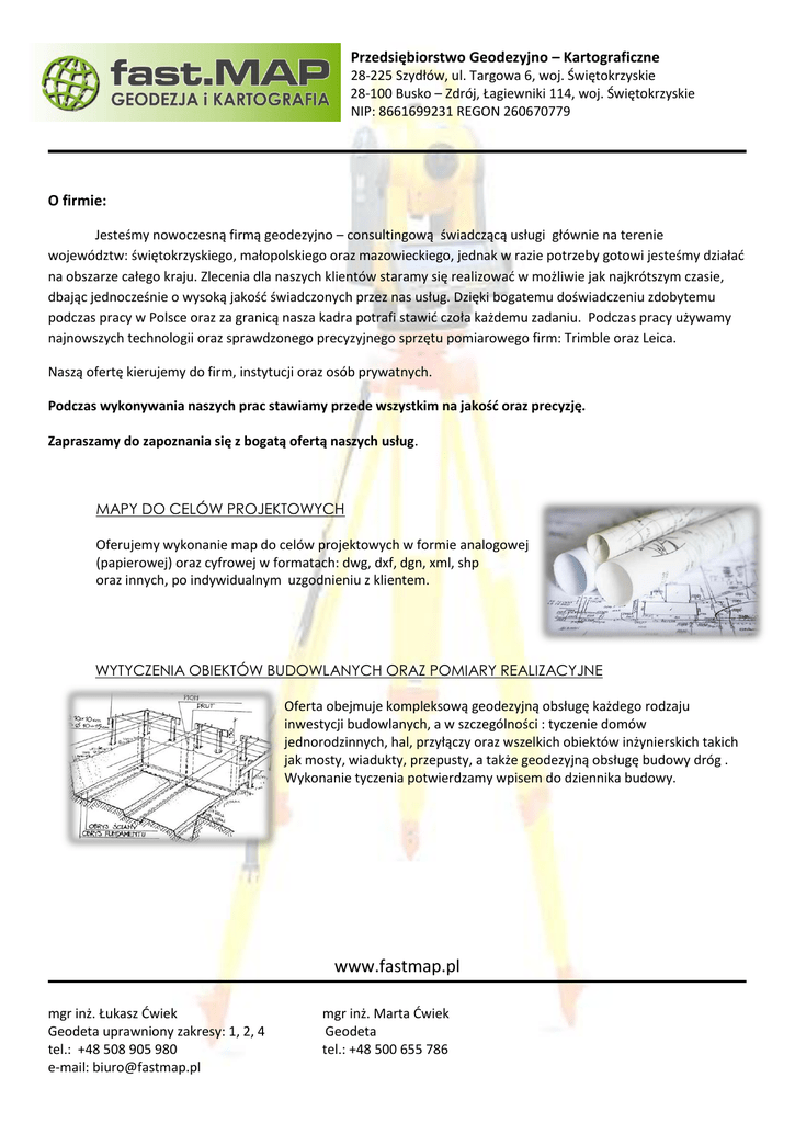 Przedsiębiorstwo Geodezyjno – Kartograficzne 28-225 Szydłów, ul. Targowa 6, woj. Świętokrzyskie 28-100 Busko – Zdrój, Łagiewniki 114, woj. Świętokrzyskie NIP: 8661699231 REGON 260670779 O firmie: Jesteśmy nowoczesną firmą geodezyjno – consultingową świadczącą usługi głównie na terenie województw: świętokrzyskiego, małopolskiego oraz mazowieckiego, jednak w razie potrzeby gotowi jesteśmy działać na obszarze całego kraju. Zlecenia dla naszych klientów staramy się realizować w możliwie jak najkrótszym czasie, dbając jednocześnie o wysoką jakość świadczonych przez nas usług. Dzięki bogatemu doświadczeniu zdobytemu podczas pracy w Polsce oraz za granicą nasza kadra potrafi stawić czoła każdemu zadaniu. Podczas pracy używamy najnowszych technologii oraz sprawdzonego precyzyjnego sprzętu pomiarowego firm: Trimble oraz Leica. Naszą ofertę kierujemy do firm, instytucji oraz osób prywatnych. Podczas wykonywania naszych prac stawiamy przede wszystkim na jakość oraz precyzję. Zapraszamy do zapoznania się z bogatą ofertą naszych usług. MAPY DO CELÓW PROJEKTOWYCH Oferujemy wykonanie map do celów projektowych w formie analogowej (papierowej) oraz cyfrowej w formatach: dwg, dxf, dgn, xml, shp oraz innych, po indywidualnym uzgodnieniu z klientem. WYTYCZENIA OBIEKTÓW BUDOWLANYCH ORAZ POMIARY REALIZACYJNE Oferta obejmuje kompleksową geodezyjną obsługę każdego rodzaju inwestycji budowlanych, a w szczególności : tyczenie domów jednorodzinnych, hal, przyłączy oraz wszelkich obiektów inżynierskich takich jak mosty, wiadukty, przepusty, a także geodezyjną obsługę budowy dróg . Wykonanie tyczenia potwierdzamy wpisem do dziennika budowy. www.fastmap.pl mgr inż. Łukasz Ćwiek Geodeta uprawniony zakresy: 1, 2, 4 tel.: +48 508 905 980 e-mail: [email protected] mgr inż. Marta Ćwiek Geodeta tel.: +48 500 655 786 Przedsiębiorstwo Geodezyjno – Kartograficzne 28-225 Szydłów, ul. Targowa 6, woj. Świętokrzyskie 28-100 Busko – Zdrój, Łagiewniki 114, woj. Świętokrzyskie NIP: 8661699231 REGON 260670779 INWENTARYZACJE POWYKONAWCZE Po zakończeniu budowy niezbędne jest sporządzenie geodezyjnej dokumentacji z inwentaryzacji obiektu budowlanego. Oferujemy wykonanie inwentaryzacji powykonawczych wszelkich obiektów budowlanych takich, jak: budynki mieszkalne, hale, obiekty inżynierskie, sieci uzbrojenia terenu, przyłącza. Mapy z geodezyjnej inwentaryzacji powykonawczej sporządzamy w sposób analogowy oraz cyfrowy w formacie uzgodnionym z klientem. WZNOWIENIA GRANIC NIERUCHOMOŚĆI Jeżeli istnieją odpowiednie dokumenty można dokonać wznowienia oraz stabilizacji znaków granicznych, które z biegiem lat uległy zniszczeniu. Oferujemy pełen zakres usług z tej dziedziny łącznie ze sporządzeniem wszelkich dokumentów. PODZIAŁY NIERUCHOMOŚCI Przepisy polskiego prawa dopuszczają podział nieruchomości na kilka działek ewidencyjnych. Niejednokrotnie bywa to też bardzo skomplikowany proces pod względem geodezyjno – prawnym. Oferujemy komplet usług z zakresu podziałów nieruchomości łącznie ze sporządzeniem wszelkich pism i wniosków tak, aby nasz klient nie musiał przechodzić samodzielnie przez skomplikowany proces podziału nieruchomości. ROZGRANICZENIA NIERUCHOMOŚCI Gdy nie istnieją dokumenty potwierdzające przebieg granicy w terenie, a istnieje jawny spór co do przebiegu linii granicznych, należy przeprowadzić rozgraniczenie nieruchomości. Nasza kadra gotowa jest podjąć się zadania rozgraniczenia każdego typu nieruchomości. www.fastmap.pl mgr inż. Łukasz Ćwiek Geodeta uprawniony zakresy: 1, 2, 4 tel.: +48 508 905 980 e-mail: [email protected] mgr inż. Marta Ćwiek Geodeta tel.: +48 500 655 786 Przedsiębiorstwo Geodezyjno – Kartograficzne 28-225 Szydłów, ul. Targowa 6, woj. Świętokrzyskie 28-100 Busko – Zdrój, Łagiewniki 114, woj. Świętokrzyskie NIP: 8661699231 REGON 260670779 NUMERYCZNE MODELE TERENU W oparciu o precyzyjne pomiary geodezyjne jesteśmy w stanie opracować model terenu każdej, nawet najbardziej skomplikowanej powierzchni. Format oraz szczegółowość modelu podlegają indywidualnym ustaleniom z naszym klientem MODELE DO MASZYN WYPOSAŻONYCH W SYSTEMY STEROWANIA 3D Kompleksowa obsługa maszyn wyposażonych w systemy sterowania 3D firm Trimble oraz Scanlaser. Spychacze, koparki, równiarki, rozściełacze mas bitumicznych. Zakres usług obejmuje: sporządzenie modeli do maszyn, sprawdzenie poprawności działania systemu oraz jego okresowa kalibracja, szkolenie operatorów SPECJALISTYCZNE POMIARY GEODEZYJNE Zakres usług obejmuje: pomiary pionowości obiektów wysmukłych takich, jak wieże telekomunikacyjne, kominy itp., pomiary w celu rektyfikacji suwnic, pomiary przemieszczeń i odkształceń, zakładanie i wyrównanie osnów geodezyjnych, pomiary objętości składowisk oraz wyrobisk. POMIARY ARCHITEKTONICZNE Pomiary elewacji budynków, przekroje przez budynki, dokładne plany pomieszczeń www.fastmap.pl mgr inż. Łukasz Ćwiek Geodeta uprawniony zakresy: 1, 2, 4 tel.: +48 508 905 980 e-mail: [email protected] mgr inż. Marta Ćwiek Geodeta tel.: +48 500 655 786 Przedsiębiorstwo Geodezyjno – Kartograficzne 28-225 Szydłów, ul. Targowa 6, woj. Świętokrzyskie 28-100 Busko – Zdrój, Łagiewniki 114, woj. Świętokrzyskie NIP: 8661699231 REGON 260670779 WSPARCIE TECHNOLOGICZNE PODCZAS PROWADZENIA KONTRAKTÓW Weryfikacja ilości przedmiarowych wykopu / nasypu, bieżące wsparcie w monitoringu wbudowanych ilości oraz sporządzenie odpowiednich raportów, kontrola spójności geometrycznej wszelkiego rodzaju projektów. KADRA Naszą kadrę stanowi zespół wysoko wykwalifikowanych specjalistów, absolwentów, Akademii Górniczo – Hutniczej im. Stanisława Staszica w Krakowie, którzy zdobywali doświadczenie zawodowe w kraju oraz poza jego granicami. Bogate międzynarodowe doświadczenie naszej kadry pozwala nam na szybką realizację powierzanych nam za