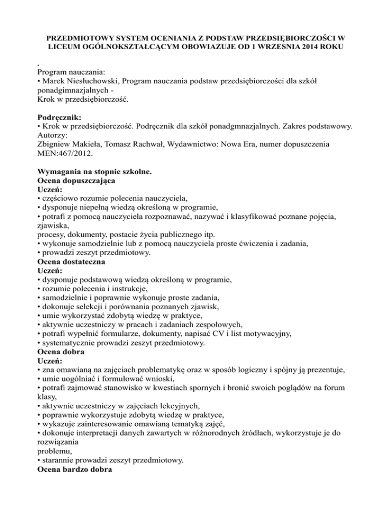 PRZEDMIOTOWY SYSTEM OCENIANIA Z PODSTAW PRZEDSIĘBIORCZOŚCI W LICEUM OGÓLNOKSZTAŁCĄCYM OBOWIAZUJE OD 1 WRZESNIA 2014 ROKU . Program nauczania: • Marek Niesłuchowski, Program nauczania podstaw przedsiębiorczości dla szkół ponadgimnazjalnych Krok w przedsiębiorczość. Podręcznik: • Krok w przedsiębiorczość. Podręcznik dla szkół ponadgmnazjalnych. Zakres podstawowy. Autorzy: Zbigniew Makieła, Tomasz Rachwał, Wydawnictwo: Nowa Era, numer dopuszczenia MEN:467/2012. Wymagania na stopnie szkolne. Ocena dopuszczająca Uczeń: • częściowo rozumie polecenia nauczyciela, • dysponuje niepełną wiedzą określoną w programie, • potrafi z pomocą nauczyciela rozpoznawać, nazywać i klasyfikować poznane pojęcia, zjawiska, procesy, dokumenty, postacie życia publicznego itp. • wykonuje samodzielnie lub z pomocą nauczyciela proste ćwiczenia i zadania, • prowadzi zeszyt przedmiotowy. Ocena dostateczna Uczeń: • dysponuje podstawową wiedzą określoną w programie, • rozumie polecenia i instrukcje, • samodzielnie i poprawnie wykonuje proste zadania, • dokonuje selekcji i porównania poznanych zjawisk, • umie wykorzystać zdobytą wiedzę w praktyce, • aktywnie uczestniczy w pracach i zadaniach zespołowych, • potrafi wypełnić formularze, dokumenty, napisać CV i list motywacyjny, • systematycznie prowadzi zeszyt przedmiotowy. Ocena dobra Uczeń: • zna omawianą na zajęciach problematykę oraz w sposób logiczny i spójny ją prezentuje, • umie uogólniać i formułować wnioski, • potrafi zajmować stanowisko w kwestiach spornych i bronić swoich poglądów na forum klasy, • aktywnie uczestniczy w zajęciach lekcyjnych, • poprawnie wykorzystuje zdobytą wiedzę w praktyce, • wykazuje zainteresowanie omawianą tematyką zajęć, • dokonuje interpretacji danych zawartych w różnorodnych źródłach, wykorzystuje je do rozwiązania problemu, • starannie prowadzi zeszyt przedmiotowy. Ocena bardzo dobra Uczeń: • dysponuje pełną wiedzą w zakresie programu szkolnego i potrafi wykorzystywać ją w różnych sytuacjach, • wykazuje zainteresowania przedmiotem oraz literaturą popularnonaukową dotyczącą omawianych treści, • rozwiązuje problemy w sposób twórczy, • samodzielnie poszukuje i selekcjonuje informacje z różnych źródeł, • właściwie interpretuje nowe sytuacje i zjawiska, • umie ocenić otaczającą rzeczywistość społeczno-polityczną zgodnie z przyjętymi kryteriami wartości, • potrafi kierować pracą zespołu, • wykonuje zadania indywidualne, systematycznie wykorzystując dodatkową literaturę, • uczestniczy w konkursach i olimpiadach przedmiotowych. Ocena celująca Uczeń: • dysponuje pełną wiedzą z zakresu programu szkolnego, • biegle posługuje się zdobytymi wiadomościami w rozwiązywaniu problemów teoretycznych i praktycznych, • wykazuje szczególne zainteresowanie przedmiotem oraz literaturą popularnonaukową i specjalistyczną zgodną z omawianą na zajęciach tematyką, • samodzielnie i twórczo rozwija własne uzdolnienia i zainteresowania, • chętnie podejmuje się zadań dodatkowych, • realizuje projekty edukacyjne. • osiąga sukcesy w konkursach i olimpiadach przedmiotowych. Ustala się następujące progi procentowe ocen: niedostateczny: 0 % - 39 % dopuszczający: 40 % - 50 % dostateczny: 51 % - 70 % dobry: 71 % - 90 % bardzo dobry: 91 % - 100 % celujący powyżej: 100 %. Narzędzia sprawdzania wiedzy i umiejętności. • odpowiedzi ustne, • sprawdziany sprawdzające znajomość treści programowych z działu (zawsze poprzedzone powtórzeniem i utrwaleniem wiadomości), • kartkówki z 2–3 ostatnich lekcji (zapowiadane lub nie), • aktywność na zajęciach dydaktycznych, • ocena prac domowych, • prace dodatkowe np. referaty, prezentacje, • udział w konkursach i olimpiadach przedmiotowych, • systematyczne prowadzenie zeszytu przedmiotowego, • udział w projektach edukacyjnych i przedsięwzięciach prospołecznych. Opracowała: Agnieszka Koza