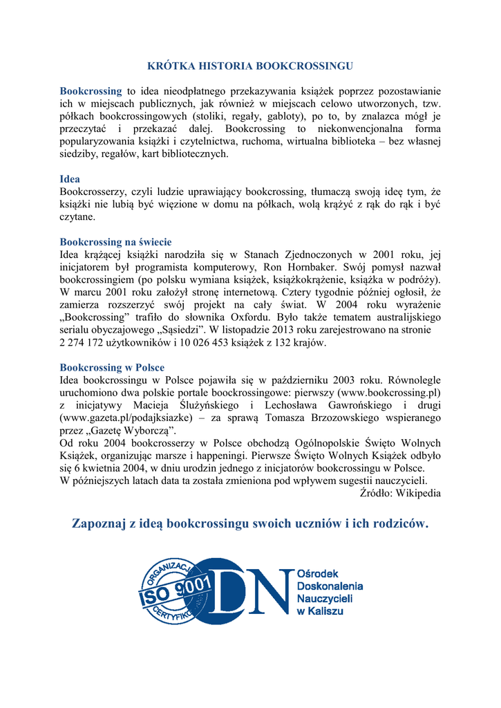 KRÓTKA HISTORIA BOOKCROSSINGU Bookcrossing to idea nieodpłatnego przekazywania książek poprzez pozostawianie ich w miejscach publicznych, jak również w miejscach celowo utworzonych, tzw. półkach bookcrossingowych (stoliki, regały, gabloty), po to, by znalazca mógł je przeczytać i przekazać dalej. Bookcrossing to niekonwencjonalna forma popularyzowania książki i czytelnictwa, ruchoma, wirtualna biblioteka – bez własnej siedziby, regałów, kart bibliotecznych. Idea Bookcrosserzy, czyli ludzie uprawiający bookcrossing, tłumaczą swoją ideę tym, że książki nie lubią być więzione w domu na półkach, wolą krążyć z rąk do rąk i być czytane. Bookcrossing na świecie Idea krążącej książki narodziła się w Stanach Zjednoczonych w 2001 roku, jej inicjatorem był programista komputerowy, Ron Hornbaker. Swój pomysł nazwał bookcrossingiem (po polsku wymiana książek, książkokrążenie, książka w podróży). W marcu 2001 roku założył stronę internetową. Cztery tygodnie później ogłosił, że zamierza rozszerzyć swój projekt na cały świat. W 2004 roku wyrażenie „Bookcrossing” trafiło do słownika Oxfordu. Było także tematem australijskiego serialu obyczajowego „Sąsiedzi”. W listopadzie 2013 roku zarejestrowano na stronie 2 274 172 użytkowników i 10 026 453 książek z 132 krajów. Bookcrossing w Polsce Idea bookcrossingu w Polsce pojawiła się w październiku 2003 roku. Równolegle uruchomiono dwa polskie portale boockrossingowe: pierwszy (www.bookcrossing.pl) z inicjatywy Macieja Ślużyńskiego i Lechosława Gawrońskiego i drugi (www.gazeta.pl/podajksiazke) – za sprawą Tomasza Brzozowskiego wspieranego przez „Gazetę Wyborczą”. Od roku 2004 bookcrosserzy w Polsce obchodzą Ogólnopolskie Święto Wolnych Książek, organizując marsze i happeningi. Pierwsze Święto Wolnych Książek odbyło się 6 kwietnia 2004, w dniu urodzin jednego z inicjatorów bookcrossingu w Polsce. W późniejszych latach data ta została zmieniona pod wpływem sugestii nauczycieli. Źródło: Wikipedia Zapoznaj z ideą bookcrossingu swoich uczniów i ich rodziców.