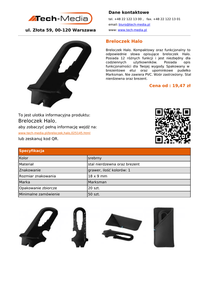 Dane kontaktowe tel. +48 22 122 13 00 , fax. +48 22 122 13 01 email: [email protected] ul. Złota 59, 00-120 Warszawa www: www.tech-media.pl Breloczek Halo Breloczek Halo. Kompaktowy oraz funkcjonalny to odpowiednie słowa opisujące breloczek Halo. Posiada 12 różnych funkcji i jest niezbędny dla codziennych użytkowników. Posiada opis funkcjonalności dla Twojej wygody. Spakowany w brezentowe etui oraz upominkowe pudełko Marksman. Nie zawiera PVC. Wzór zastrzeżony. Stal nierdzewna oraz brezent. Cena od : 19,47 zł To jest ulotka informacyjna produktu: Breloczek Halo , aby zobaczyć pełną informację wejdź na: www.tech-media.pl/breloczek,halo,025145.html lub zeskanuj kod QR. Specyfikacja Kolor srebrny Materiał stal nierdzewna oraz brezent Znakowanie grawer, ilość kolorów: 1 Rozmiar znakowania 18 x 9 mm Marka Marksman Opakowanie zbiorcze 20 szt. Minimalne zamówienie 50 szt.