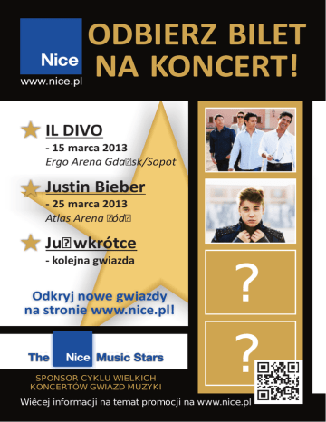 ODBIERZ BILET NA KONCERT! IL DIVO - 15 marca 2013 Ergo Arena Gdańsk/Sopot Justin Bieber - 25 marca 2013 Atlas Arena Łódź Już wkrótce - kolejna gwiazda Odkryj nowe gwiazdy na stronie www.nice.pl! SPONSOR CYKLU WIELKICH KONCERTÓW GWIAZD MUZYKI ? ? Wiêcej informacji na temat promocji na www.nice.pl ODBIERZ BILET NA KONCERT! Zestaw Nice Robus350 + zaproszenie na koncert Zestaw Nice Robus600 + zaproszenie na koncert Zestaw Nice Robus1000 + zaproszenie na koncert Zestaw Nice Toona4005 + zaproszenie na koncert Zestaw Nice Toona4006 + zaproszenie na koncert Zestaw Nice Toona5015 + zaproszenie na koncert Zestaw Nice Toona5016 + zaproszenie na koncert Zestaw Nice Moby4005 + zaproszenie na koncert Zestaw Nice Moby4006 + zaproszenie na koncert Zestaw Nice Moby5015 + zaproszenie na koncert Zestaw Nice Moby5016 + zaproszenie na koncert Zestaw Nice Pop + zaproszenie na koncert Zestaw Nice Spin21 + zaproszenie na koncert Zestaw Nice Spin22 + zaproszenie na koncert Bramy gara¿owe Nice + zaproszenie na koncert Wiêcej natemat temat promocji na www.nice.pl Wiêcej informacji informacji na promocji na www.nice.pl