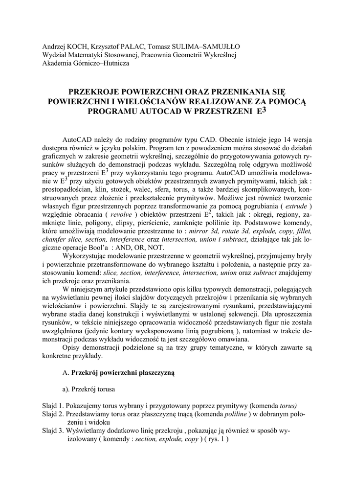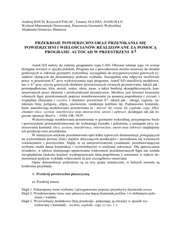 Andrzej KOCH, Krzysztof PAŁAC, Tomasz SULIMA–SAMUJŁŁO Wydział Matematyki Stosowanej, Pracownia Geometrii Wykreślnej Akademia Górniczo–Hutnicza PRZEKROJE POWIERZCHNI ORAZ PRZENIKANIA SIĘ POWIERZCHNI I WIELOŚCIANÓW REALIZOWANE ZA POMOCĄ PROGRAMU AUTOCAD W PRZESTRZENI E3 AutoCAD należy do rodziny programów typu CAD. Obecnie istnieje jego 14 wersja dostępna również w języku polskim. Program ten z powodzeniem można stosować do działań graficznych w zakresie geometrii wykreślnej, szczególnie do przygotowywania gotowych rysunków służących do demonstracji podczas wykładu. Szczególną rolę odgrywa możliwość pracy w przestrzeni E3 przy wykorzystaniu tego programu. AutoCAD umożliwia modelowanie w E3 przy użyciu gotowych obiektów przestrzennych zwanych prymitywami, takich jak : prostopadłościan, klin, stożek, walec, sfera, torus, a także bardziej skomplikowanych, konstruowanych przez złożenie i przekształcenie prymitywów. Możliwe jest również tworzenie własnych figur przestrzennych poprzez transformowanie za pomocą pogrubiania ( extrude ) względnie obracania ( revolve ) obiektów przestrzeni E2, takich jak : okręgi, regiony, zamknięte linie, poligony, elipsy, pierścienie, zamknięte polilinie itp. Podstawowe komendy, które umożliwiają modelowanie przestrzenne to : mirror 3d, rotate 3d, explode, copy, fillet, chamfer slice, section, interference oraz intersection, union i subtract, działające tak jak logiczne operacje Bool’a : AND, OR, NOT. Wykorzystując modelowanie przestrzenne w geometrii wykreślnej, przyjmujemy bryły i powierzchnie przetransformowane do wybranego kształtu i położenia, a następnie przy zastosowaniu komend: slice, section, interference, intersection, union oraz subtract znajdujemy ich przekroje oraz przenikania. W niniejszym artykule przedstawiono opis kilku typowych demonstracji, polegających na wyświetlaniu pewnej ilości slajdów dotyczących przekrojów i przenikania się wybranych wielościanów i powierzchni. Slajdy te są zarejestrowanymi rysunkami, przedstawiającymi wybrane stadia danej konstrukcji i wyświetlanymi w ustalonej sekwencji. Dla uproszczenia rysunków, w tekście niniejszego opracowania widoczność przedstawianych figur nie została uwzględniona (jedynie kontury wyeksponowano linią pogrubioną ), natomiast w trakcie demonstracji podczas wykładu widoczność ta jest szczegółowo omawiana. Opisy demonstracji podzielone są na trzy grupy tematyczne, w których zawarte są konkretne przykłady. A. Przekrój powierzchni płaszczyzną a). Przekrój torusa Slajd 1. Pokazujemy torus wybrany i przygotowany poprzez prymitywy (komenda torus) Slajd 2. Przedstawiamy torus oraz płaszczyznę tnącą (komenda poliline ) w dobranym położeniu i widoku Slajd 3. Wyświetlamy dodatkowo linię przekroju , pokazując ją również w sposób wyizolowany ( komendy : section, explode, copy ) ( rys. 1 ) rys.1. Przekrój torusa płaszczyzną b). Przekrój walca Slajd 1. Prezentujemy przygotowany do pokazu walec utworzony za pomocą komendy cylinder. Slajd 2. Wyświetlamy walec z płaszczyzną tnącą w ustalonym położeniu i widoku. Slajd 3. Przedstawiamy końcowy rysunek ( rys. 2 ), na którym przekrój w postaci regionu jest rozbity i skopiowany. Ustalono także widoczność. rys. 2. Przekrój walca płaszczyzną B. Przenikanie się dwu powierzchni a). Przenikanie się dwu stożków Slajd 1. Wyświetlamy dwa stożki utworzone przy użyciu komendy cone. Slajd 2. Stożki te przedstawiamy w położeniu w którym zachodzi przenikanie. Slajd 3. Pokazujemy rysunek końcowy ( rys. 3 ) na którym wyróżnione są linie przenikania z ustaloną widocznością. Pokazana jest także kopia samych linii przenikania. ( komendy: union, intersect, explode, copy ) rys. 3. Przenikanie się dwu stożków b). Przenikanie się stożka z walcem Slajd 1. Wyświetlamy stożek i walec utworzone przy użyciu komend : cone i cylinder. Slajd 2. Przedstawiamy te powierzchnie w położeniu, w którym zachodzi przenikanie. Slajd 3. Przedstawiamy rysunek końcowy ( rys. 4 ), na którym uwidocznione są linie przenikania z ustaloną widocznością oraz pokazana kopia samych tych linii. rys. 4. Przenikanie się stożka z walcem c). Przenikanie się dwu sfer Slajd 1. Pokazujemy dwie sfery utworzone przy użyciu komendy sphere. Slajd 2. Pokazujemy sfery w położeniu, w którym zachodzi przenikanie. Slajd 3. Wyświetlamy rysunek, na którym uwidocznione jest linia przenikania z ustaloną widocznością oraz pokazana kopia samej linii. Slajd 4. Wyświetlamy rysunek końcowy ( rys. 5 ) z wykonaną podwójną transformacją, dzięki której pokazany jest rzeczywisty kształt linii przenikania ( okrąg ). C. Przenikanie się powierzchni z wielościanem a). Przenikanie się stożka z graniastosłupem. Slajd 1. Przedstawiamy stożek utworzony przy użyciu komendy cone oraz skonstruowany graniastosłup prosty o podstawie pięciokątnej ( komendy poliline, extrude ). Slajd 2. Przedstawiamy stożek i graniastosłup w położeniu w którym zachodzi przenikanie. Slajd 3. Pokazujemy rysunek końcowy ( rys. 6 ), na którym wyróżniona jest linia przenikania z ustaloną widocznością. Pokazana jest również kopia samej linii przenikania. rys. 5. Przenikanie się dwu sfer oraz pokazanie za pomocą transformacji rzeczywistej wielkości linii przenikania rys. 6. Przenikanie się stożka z graniastosłupem b). Przenikanie się sfery z ostrosłupem. Slajd 1. Pokazujemy sferę utworzoną przy użyciu komendy sphere oraz ostrosłup prosty o podstawie pięciokątnej ( skonstruowany podobnie jak w poprzednim przykładzie graniastosłup ). Slajd 2. Pokazujemy sferę i ostrosłup w położeniu, w którym zachodzi przenikanie. Slajd 3. Pokazujemy rysunek końcowy ( rys. 7 ), na którym wyróżniona jest linia przenikania z ustaloną widocznością. Pokazana jest również kopia samej linii przenikania. Rys. 7. Przenikanie się sfery z ostrosłupem Przedstawione przy
