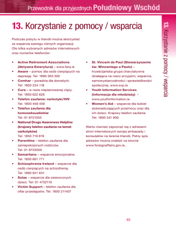 Przewodnik dla przyjezdnych Południowy Wschód Podczas pobytu w Irlandii można skorzystać ze wsparcia szeregu różnych organizacji. Oto kilka wybranych adresów internetowych oraz numerów telefonów: •Active Retirement Associations (Aktywna Emerytura) – www.fara.ie •Aware – pomoc dla osób cierpiących na depresję. Tel: 1890 303 302 •Comhar – poradnia dla dorosłych. Tel: 1800 234 118 • Cura – w razie nieplanowanej ciąży. Tel: 1850 622 626 • Telefon zaufania: narkotyki/HIV Tel: 1800 459 459 •Telefon zaufania dla homoseksualistów Tel: 01 8721055 •National Drugs Awareness Helpline (krajowy telefon zaufania na temat narkotyków) Tel: 1850 719 819 •Parentline – telefon zaufania dla zaniepokojonych rodziców. Tel: 01 8733500 • Samaritans – wsparcie emocjonalne. Tel: 1850 661 771 •Schizophrenia Ireland – wsparcie dla osób cierpiących na schizofrenię. Tel: 1890 621 631 •Solas – wsparcie dla osieroconych dzieci. Tel: 01 4732110 •Victim Support – telefon zaufania dla ofiar przestępstw. Tel: 1850 211407 •St. Vincent de Paul (Stowarzyszenie św. Wincentego a Paulo) – hrześcijańska grupa charytatywna działająca na rzecz przyjaźni, wsparcia, samowystarczalności i sprawiedliwości społecznej. www.svp.ie •Youth Information Services (informacja dla młodzieży) – www.youthinformation.ie •Women’s Aid – wsparcie dla kobiet doświadczających przemocy oraz dla ich dzieci. Krajowy telefon zaufania Tel: 1800 341 900 Warto również zapoznać się z adresami stron internetowych swojej ambasady i konsulatów na terenie Irlandii. Pełny spis adresów można znaleźć na stronie www.foreignaffairs.gov.ie.. 63 13. Korzystanie z pomocy / wsparcia 13. Korzystanie z pomocy / wsparcia Słowniczek • • • • • • • • • • • An Garda Síochána – policja irlandzka. CIC – ośrodek informacji obywatelskiej. Źródło darmowych, niezależnych i poufnych informacji, a także usług dostępnych dla każdego. Comhairle /Urząd informacji obywatelskiej – państwowy urząd udostępniający informacje oraz świadczący usługi doradcze dot. opieki społecznej. CWO – urzędnik opieki społecznej. Przyznaje świadczenia opieki społecznej w imieniu zarządu HSE. EOG – Europejski Obszar Gospodarczy: 25 krajów członkowskich UE plus Norwegia, Liechtenstein i Islandia. FÁS – narodowy urząd ds. szkoleń i zatrudnienia. Golden Pages – książka telefoniczna zawierająca spis firm i instytucji uszeregowanych według kategorii ogólnych, np. „hydraulicy”. GAA – Gaelic Athletic Association (Celtyckie Towarzystwo Sportowe). GP – General Practitioner (lekarz rodzinny / lek. pierwszego kontaktu). Lekarz przyjmujący w lokalnej przychodni, do którego – poza sytuacjami awaryjnymi – należy się zwrócić w pierwszej kolejności w przypadku potrzeby skorzystania z usług służby zdrowia. Habitual Residence (pobyt stały) – udokumentowanie ścisłego związku z Irlandią lub innym krajem wspólnego obszaru podróży - Common Travel Area, na przykład na podstawie długości i ciągłości pobytu.. HSE – służba zdrowia. Zapewnia opiekę zdrowotną oraz zarządza usługami opieki społecznej. 64 • • • • • • • • Władze lokalne – rada hrabstwa, miasta lub gminy. MABS – biuro ds. doradztwa budżetowego. Organizacja oferująca porady i wsparcie dla osób przeżywających trudności finansowe. NCT – National Car Test (państwowy przegląd stanu technicznego pojazdu). Przegląd obowiązujący pojazdy mające więcej niż 4 lata, w celu sprawdzenia czy są one bezpieczne. Numer PPS – Personal Public Service Number, numer ubezpieczenia społecznego. Niepowtarzalny numer identyfikacyjny umożliwiający korzystanie ze świadczeń socjalnych, usług publicznych oraz informacji. Składki na ubezpieczenie społeczne zależne od dochodu (składki PRSI) Składki płacone przez pracowników, pracodawców oraz osoby prowadzące działalność gospodarczą na Fundusz Ubezpieczeń Społecznych. Rodzaj i wysokość stawki zależy od charakteru wykonywanej pracy. SWA – Supplementary Welfare Allowance (dodatkowe świadczenie socjalne). Wypłacane przez zarząd HSE osobom, których dochody nie wystarczają na zaspokojenie wszystkich potrzeb. VEC – Vocational Education Committee (Komisja Edukacji Zawodowej). Lokalna instytucja edukacyjna oferująca dostęp do edukacji dla dorosłych, kursów szkoleniowych oraz usług wsparcia w zakresie edukacji.. VRT – Vehicle Registration Tax (podatek rejestracyjny). Podatek płatny do urzędu skarbowego w momencie rejestracji pojazdu nowego bądź wwiezionego do Irlandii. Funded & Supported by: Belfast Dublin Limerick South East Cork www.designassociates.ie Ireland Galway