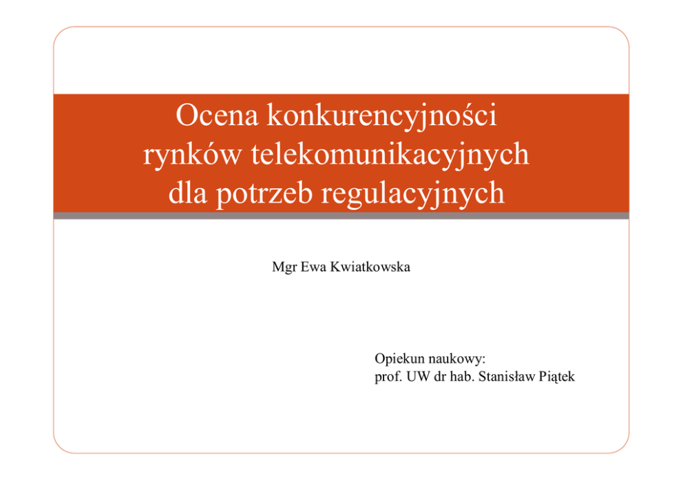 Ocena konkurencyjności rynków telekomunikacyjnych dla potrzeb regulacyjnych Mgr Ewa Kwiatkowska Opiekun naukowy: prof. UW dr hab. Stanisław Piątek Wprowadzenie Specyfika sektora telekomunikacyjnego ewoluującego od form gospodarki państwowej i stanu monopolu w kierunku gospodarki rynkowej opartej na własności prywatnej Operator zasiedziały Potrzeby regulacyjne Mandat regulacyjny Regulatorzy ds. ochrony konkurencji – KE, Prezes UOKiK Krajowy regulator sektorowy – Prezes UKE Regulacja Wyprzedzająca – sektorowa i kontrola koncentracji Następcza – praktyki ograniczające konkurencję (porozumienia ograniczające konkurencję i nadużywanie pozycji dominującej) Wspólny etap postępowań– ocena konkurencyjności rynku Cel rozprawy Ustalenie i optymalizacja metod dokonywania ocen konkurencyjności rynków telekomunikacyjnych, z uwzględnieniem charakterystyki ekonomicznej i technicznej działalności gospodarczej prowadzonej na tych rynkach oraz specyfiki poszczególnych zadań regulacyjnych. Ustalenie jakie kryteria i metody ich stosowania wykorzystywane są przy ocenie konkurencyjności rynków telekomunikacyjnych dla potrzeb poszczególnych zadań regulacyjnych Ustalenie w jaki sposób specyfika ekonomiczna, techniczna i instytucjonalna rynków telekomunikacyjnych wpływa na sposób dokonywania ocen konkurencyjności tych rynków Powiązanie ekonomicznych metod oceny konkurencyjności rynków z charakterystyką poszczególnych zadań regulacyjnych Zidentyfikowanie obszaru uniwersalnych i swoistych kryteriów oceny konkurencyjności stosowanych w poszczególnych postępowaniach Próba stworzenia uniwersalnego zestawu kryteriów umożliwiającego regulatorom spójną ocenę konkurencyjności rynków telekomunikacyjnych Etapy funkcjonowania regulacji Zadanie regulacyjne (mandat regulacyjny) Określenie rynku właściwego Analiza konkurencyjności rynku Teza główna Rynki telekomunikacyjne ze względu na swoją charakterystykę ekonomiczną, techniczną i strukturę instytucjonalną podlegają regulacji wyprzedzającej i następczej, która w każdym przypadku obejmuje etap oceny konkurencyjności rynku. Kryteria oceny konkurencyjności rynków stosowane w praktyce regulacyjnej koncentrują się wokół: struktury rynków odzwierciedlonej w udziałach rynkowych przedsiębiorców (b) charakterystyki samego rynku związanej głównie z warunkami wejścia i wyjścia z rynku (c) funkcjonalnych przewag przedsiębiorcy w stosunku do pozostałych uczestników rynku wyrażających się w sferze kluczowych zasobów, poziomie techniki, siły finansowej i zdolności operacyjnych. (a) Kryteria oceny konkurencyjności rynków prowadzonej za pomocą narzędzi ekonomicznych są zróżnicowane ze względu na rodzaj mandatu regulacyjnego i sposób określenia rynku właściwego w każdym z jego wymiarów. Tezy cząstkowe 1. Rodzaj wykorzystywanych kryteriów oceny konkurencyjności rynku jest zdeterminowany głównie mandatem regulacyjnym. Metoda stosowania wymaganych kryteriów jest kwestią praktyki regulacyjnej. Sposób określenia zadań regulacyjnych organu antymonopolowego zapewnia mu większy zakres uznania w ocenie konkurencyjności rynku niż w przypadku mandatu regulatora sektorowego. 2. W sektorze telekomunikacyjnym praktyka określania rynków pod względem asortymentowym (zjawisko konwergencji, jednokierunkowej substytucyjności, rynki zakańczania połączeń w danej sieci, nowe generacje infrastruktur i usług) oraz geograficznym (dawne obszary koncesyjne, obszary sieciowe, centralowe, zurbanizowane) wywiera szczególny wpływ na dobór kryteriów i metod ich stosowania przy ocenie konkurencyjności. 3. Organy regulacyjne, zgodnie z zasadą oportunizmu mają skłonność do minimalizowania zakresu analizy konkurencyjności rynku do zasadniczego kryterium ilościowego (wielkość udziałów rynkowych). Poszerzanie zakresu wykorzystywanych kryteriów oceny konkurencyjności, choć podnosi koszty działań regulacyjnych, sprzyja spójności i efektywności prokonkurencyjnego oddziaływania regulacji na rynki telekomunikacyjne. 4. Wzrost konkurencyjności rynków telekomunikacyjnych wskazuje na celowość ograniczenia zakresu regulacji sektorowej na rzecz horyzontalnej ochrony antymonopolowej. Przedmiot i metody badawcze Przedmiot badań – interwencje władzy publicznej na rynkach telekomunikacyjnych Analiza decyzji i postanowień organów regulacyjnych wydanych w stosunku do przedsiębiorców prowadzących działalność na rynkach telekomunikacyjnych (w części dotyczącej określenia rynku właściwego i oceny jego konkurencyjności) Dokumenty ukazujące zakres i warunki gromadzenia danych o sytuacji konkurencyjnej na rynkach telekomunikacyjnych Analiza literatury z zakresu ekonomii, prawa i zarządzania Metody wyznaczania rynków właściwych Analiza kryteriów ilościowych i jakościowych oceny konkurencyjności Struktura rozstrzygnięć regulacyjnych podlegających analizie Organ ∑ Krajowy Unii Europejskiej Horyzontalna UOKiK KE Kontrola koncentracji 55 81 136 Praktyki ograniczające konkurencję w tym: 79 11 90 Nadużywanie pozycji dominującej 64 5 69 Porozumienia ograniczające konkurencję 15 6 21 Sektorowa UKE Regulacja 26 ∑ 160 26 92 252 Struktura rozprawy Wprowadzenie – pojęcia, cel, tezy, metoda badawcza Mandat regulacyjny Definiowanie rynku właściwego Przedstawienie instrumentów stosowanych przez regulatora przy ocenie konkurencyjności rynków telekomunikacyjnych, systematyka kryteriów oceny konkurencyjności Ilościowe metody oceny konkurencyjności rynków Jakościowe metody oceny konkurencyjności rynków Podsumowanie Przesłanki oceny konkurencyjności rynków ilościowe jakościowe udział bezwzględny dotyczące przedsiębiorcy względny wielkość możliwość zwiększenia produkcji kontrola infrastruktury przewaga technologiczna rozwój sieci dystrybucji dostęp do rynków kapitałowych wielopłaszczyznowość działania ekonomia skali ekono