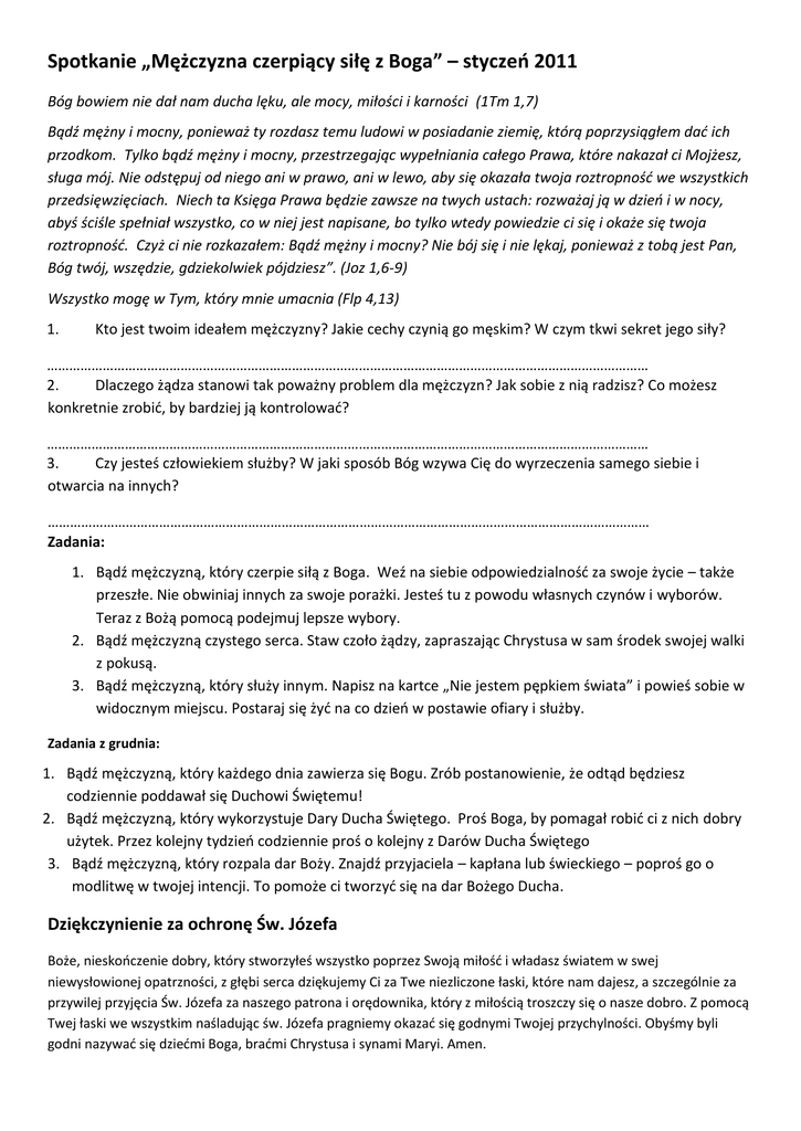 Spotkanie „Mężczyzna czerpiący siłę z Boga” – styczeń 2011 Bóg bowiem nie dał nam ducha lęku, ale mocy, miłości i karności (1Tm 1,7) Bądź mężny i mocny, ponieważ ty rozdasz temu ludowi w posiadanie ziemię, którą poprzysiągłem dad ich przodkom. Tylko bądź mężny i mocny, przestrzegając wypełniania całego Prawa, które nakazał ci Mojżesz, sługa mój. Nie odstępuj od niego ani w prawo, ani w lewo, aby się okazała twoja roztropnośd we wszystkich przedsięwzięciach. Niech ta Księga Prawa będzie zawsze na twych ustach: rozważaj ją w dzieo i w nocy, abyś ściśle spełniał wszystko, co w niej jest napisane, bo tylko wtedy powiedzie ci się i okaże się twoja roztropnośd. Czyż ci nie rozkazałem: Bądź mężny i mocny? Nie bój się i nie lękaj, ponieważ z tobą jest Pan, Bóg twój, wszędzie, gdziekolwiek pójdziesz”. (Joz 1,6-9) Wszystko mogę w Tym, który mnie umacnia (Flp 4,13) 1. Kto jest twoim ideałem mężczyzny? Jakie cechy czynią go męskim? W czym tkwi sekret jego siły? ……………………………………………………………………………………………………………………………………………… 2. Dlaczego żądza stanowi tak poważny problem dla mężczyzn? Jak sobie z nią radzisz? Co możesz konkretnie zrobid, by bardziej ją kontrolowad? ……………………………………………………………………………………………………………………………………………… 3. Czy jesteś człowiekiem służby? W jaki sposób Bóg wzywa Cię do wyrzeczenia samego siebie i otwarcia na innych? ……………………………………………………………………………………………………………………………………………… Zadania: 1. Bądź mężczyzną, który czerpie siłą z Boga. Weź na siebie odpowiedzialnośd za swoje życie – także przeszłe. Nie obwiniaj innych za swoje porażki. Jesteś tu z powodu własnych czynów i wyborów. Teraz z Bożą pomocą podejmuj lepsze wybory. 2. Bądź mężczyzną czystego serca. Staw czoło żądzy, zapraszając Chrystusa w sam środek swojej walki z pokusą. 3. Bądź mężczyzną, który służy innym. Napisz na kartce „Nie jestem pępkiem świata” i powieś sobie w widocznym miejscu. Postaraj się żyd na co dzieo w postawie ofiary i służby. Zadania z grudnia: 1. Bądź mężczyzną, który każdego dnia zawierza się Bogu. Zrób postanowienie, że odtąd będziesz codziennie poddawał się Duchowi Świętemu! 2. Bądź mężczyzną, który wykorzystuje Dary Ducha Świętego. Proś Boga, by pomagał robid ci z nich dobry użytek. Przez kolejny tydzieo codziennie proś o kolejny z Darów Ducha Świętego 3. Bądź mężczyzną, który rozpala dar Boży. Znajdź przyjaciela – kapłana lub świeckiego – poproś go o modlitwę w twojej intencji. To pomoże ci tworzyd się na dar Bożego Ducha. Dziękczynienie za ochronę Św. Józefa Boże, nieskooczenie dobry, który stworzyłeś wszystko poprzez Swoją miłośd i władasz światem w swej niewysłowionej opatrzności, z głębi serca dziękujemy Ci za Twe niezliczone łaski, które nam dajesz, a szczególnie za przywilej przyjęcia Św. Józefa za naszego patrona i orędownika, który z miłością troszczy się o nasze dobro. Z pomocą Twej łaski we wszystkim naśladując św. Józefa pragniemy okazad się godnymi Twojej przychylności. Obyśmy byli godni nazywad się dziedmi Boga, bradmi Chrystusa i synami Maryi. Amen.