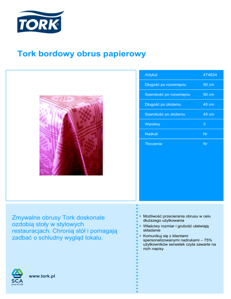 Tork bordowy obrus papierowy Zmywalne obrusy Tork doskonale ozdobią stoły w stylowych restauracjach. Chronią stół i pomagają zadbać o schludny wygląd lokalu. www.tork.pl Artykuł 474624 Długość po rozwinięciu 90 cm Szerokość po rozwinięciu 90 cm Długość po złożeniu 45 cm Szerokość po złożeniu 45 cm Warstwy 3 Nadruk Nr Tłoczenie Nr • Możliwość przecierania obrusu w celu dłuższego użytkowania • Właściwy rozmiar i grubość ułatwiają składanie • Komunikuj się z klientami spersonalizowanymi nadrukami – 75% użytkowników serwetek czyta zawarte na nich napisy Informacje o opakowaniu Opakowanie pojedyncze Opakowanie transportowe Paleta EAN 5010195401211 5010195451216 5010195003286 Sztuki 100 100 7700 Opakowania pojedyncze - 1 77 Wysokość 110 mm 110 mm 1373 mm Szerokość 320 mm 320 mm 1000 mm Długość 470 mm 470 mm 1200 mm Objętość 16.5 dm3 16.5 dm3 1.3 m3 Waga netto 4212 g 4.2 kg 324.32 kg Waga brutto 4232 g 4.5 kg 347.73 kg Rodzaj opakowania - Carton - Dopasowane serwetki i produkty do nakrycia stołu 478789 18139 Alternatywne produkty Kontakt SCA Hygiene Sp. z o.o. ul. Puławska 435A 02-801 Warszawa, Polska Tel.: +48 22 543 75 00 Faks: +48 22 543 75 01 Tork jest marką grupy SCA, Svenska Cellulosa Aktiebolaget. Grupa SCA oferuje artykuły higieniczne oraz produkty pochodzenia drzewnego w ponad 100 krajach. Więcej informacji można znaleźć pod adresem www.sca.com www.tork.pl 18592