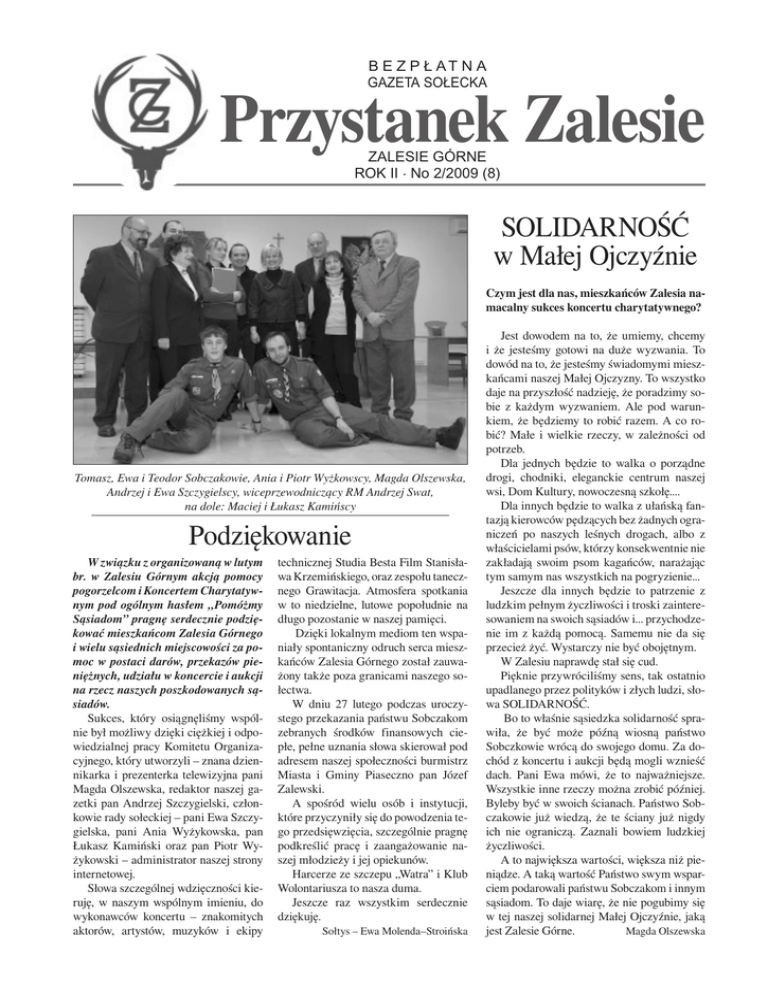 B E Z P Ł AT N A GAZETA SOŁECKA Przystanek Zalesie ZALESIE GÓRNE ROK II . No 2/2009 (8) SOLIDARNOŚĆ w Małej Ojczyźnie Czym jest dla nas, mieszkańców Zalesia namacalny sukces koncertu charytatywnego? Tomasz, Ewa i Teodor Sobczakowie, Ania i Piotr Wyżkowscy, Magda Olszewska, Andrzej i Ewa Szczygielscy, wiceprzewodniczący RM Andrzej Swat, na dole: Maciej i Łukasz Kamińscy Podziękowanie W związku z organizowaną w lutym br. w Zalesiu Górnym akcją pomocy pogorzelcom i Koncertem Charytatywnym pod ogólnym hasłem „Pomóżmy Sąsiadom” pragnę serdecznie podziękować mieszkańcom Zalesia Górnego i wielu sąsiednich miejscowości za pomoc w postaci darów, przekazów pieniężnych, udziału w koncercie i aukcji na rzecz naszych poszkodowanych sąsiadów. Sukces, który osiągnęliśmy wspólnie był możliwy dzięki ciężkiej i odpowiedzialnej pracy Komitetu Organizacyjnego, który utworzyli – znana dziennikarka i prezenterka telewizyjna pani Magda Olszewska, redaktor naszej gazetki pan Andrzej Szczygielski, członkowie rady sołeckiej – pani Ewa Szczygielska, pani Ania Wyżykowska, pan Łukasz Kamiński oraz pan Piotr Wyżykowski – administrator naszej strony internetowej. Słowa szczególnej wdzięczności kieruję, w naszym wspólnym imieniu, do wykonawców koncertu – znakomitych aktorów, artystów, muzyków i ekipy technicznej Studia Besta Film Stanisława Krzemińskiego, oraz zespołu tanecznego Grawitacja. Atmosfera spotkania w to niedzielne, lutowe popołudnie na długo pozostanie w naszej pamięci. Dzięki lokalnym mediom ten wspaniały spontaniczny odruch serca mieszkańców Zalesia Górnego został zauważony także poza granicami naszego sołectwa. W dniu 27 lutego podczas uroczystego przekazania państwu Sobczakom zebranych środków finansowych ciepłe, pełne uznania słowa skierował pod adresem naszej społeczności burmistrz Miasta i Gminy Piaseczno pan Józef Zalewski. A spośród wielu osób i instytucji, które przyczyniły się do powodzenia tego przedsięwzięcia, szczególnie pragnę podkreślić pracę i zaangażowanie naszej młodzieży i jej opiekunów. Harcerze ze szczepu „Watra” i Klub Wolontariusza to nasza duma. Jeszcze raz wszystkim serdecznie dziękuję. Sołtys – Ewa Molenda–Stroińska Jest dowodem na to, że umiemy, chcemy i że jesteśmy gotowi na duże wyzwania. To dowód na to, że jesteśmy świadomymi mieszkańcami naszej Małej Ojczyzny. To wszystko daje na przyszłość nadzieję, że poradzimy sobie z każdym wyzwaniem. Ale pod warunkiem, że będziemy to robić razem. A co robić? Małe i wielkie rzeczy, w zależności od potrzeb. Dla jednych będzie to walka o porządne drogi, chodniki, eleganckie centrum naszej wsi, Dom Kultury, nowoczesną szkołę.... Dla innych będzie to walka z ułańską fantazją kierowców pędzących bez żadnych ograniczeń po naszych leśnych drogach, albo z właścicielami psów, którzy konsekwentnie nie zakładają swoim psom kagańców, narażając tym samym nas wszystkich na pogryzienie... Jeszcze dla innych będzie to patrzenie z ludzkim pełnym życzliwości i troski zainteresowaniem na swoich sąsiadów i... przychodzenie im z każdą pomocą. Samemu nie da się przecież żyć. Wystarczy nie być obojętnym. W Zalesiu naprawdę stał się cud. Pięknie przywróciliśmy sens, tak ostatnio upadlanego przez polityków i złych ludzi, słowa SOLIDARNOŚĆ. Bo to właśnie sąsiedzka solidarność sprawiła, że być może późną wiosną państwo Sobczkowie wrócą do swojego domu. Za dochód z koncertu i aukcji będą mogli wznieść dach. Pani Ewa mówi, że to najważniejsze. Wszystkie inne rzeczy można zrobić później. Byleby być w swoich ścianach. Państwo Sobczakowie już wiedzą, że te ściany już nigdy ich nie ograniczą. Zaznali bowiem ludzkiej życzliwości. A to największa wartości, większa niż pieniądze. A taką wartość Państwo swym wsparciem podarowali państwu Sobczakom i innym sąsiadom. To daje wiarę, że nie pogubimy się w tej naszej solidarnej Małej Ojczyźnie, jaką jest Zalesie Górne. Magda Olszewska Ważne słowo SĄSIAD Zakończył się pierwszy, jak sadzę najważniejszy etap naszej wspólnej akcji „Pomóżmy sąsiadom”. ków moich rozmów z Furią, namówiła do współpracy studio z Gołkowa „Przyjaciele druku”. No więc plakatów mieliśmy tyle co trzeba i to porządnych. Zbiórka darów, koncert i aukcja za Potem wynikła sprawa dekoracji hali nami. Zebraliśmy mnóstwo dobrych dogimnastycznej i jej wygłuszenie. Bez tego świadczeń. I chociaż piszę te słowa jako ani rusz! Dzięki uprzejmości Pani Dyrektor jeden z członków Komitetu OrganizacyjHanny Sierant na halę mogliśmy wejść już nego, mam w sobie takie przekonanie, że w piątkowy wieczór. Pomagała nam tu od być może wyrażam więcej niż tylko włapoczątku p. Grażyna Doba–Wolska, która sne poglądy. Wynika to z wielu rozmów z nie tylko opracowała koncepcję scenogranaszymi Czytelnikami, mieszkańcami Zaficzną, ale była jej wykonawcą. W pewlesia, naszymi Sąsiadami, nym momencie zabrakło które mogliśmy odbyć podnam materiałów, ścianek, czas przygotowań do koni paru innych rzeczy. Pocertu. Czuję się w obojechaliśmy więc z Łukawiązku podzielić z Pańszem Kamińskim do sąstwem, swoimi odczuciasiada z Czarnowa. Cezary mi i doświadczeniami z naŻegliński nie odmówił szej wspólnej, trudnej ale pomocy, zapakowaliśmy niezwykle satysfakcjonujązdobycz do samochodu i cej akcji pomocowej. do Zalesia. Czarek nie tylJej ostateczny efekt spoko dał nam materiały – łeczny i finansowy przesam przyjechał pomagać rósł nasze oczekiwania. Po przy budowie sporej przepierwsze: spotkaliśmy się cież dekoracji i sceny. z ogromnym, serdecznym Estradę wypożyczyliodzewem mieszkańców Zaśmy z Ośrodka Kultury w lesia i wielu okolicznych Piasecznie, transport dał miejscowości. Na nasz apel nam Aqarius, z powroodpowiedzieli m.in. ludzie 