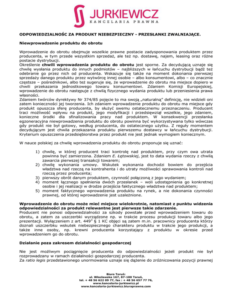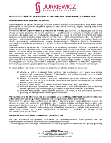 ODPOWIEDZIALNOŚC ZA PRODUKT NIEBEZPIECZNY - PRZESŁANKI ZWALNIAJĄCE. Niewprowadzenie produktu do obrotu Wprowadzenie do obrotu obejmuje wszelkie prawne postacie zadysponowania produktem przez producenta, w tym przede wszystkim sprzedaż, ale też np. dostawę, najem, leasing oraz różne postacie dystrybucji. Określenie chwili wprowadzenia produktu do obrotu jest sporne. Za decydującą uznaje się chwilę wysłania produktu do innych podmiotów – najbliższych w łańcuchu dystrybucji bądź też odebranie go przez nich od producenta. Wskazuje się także na moment dokonania pierwszej sprzedaży danego produktu przez wytwórcę innej osobie – albo konsumentowi, albo – co znacznie częstsze – pośrednikowi, albo też sugeruje się, że wprowadzenie do obrotu ma miejsce dopiero w chwili przekazania jednostkowego towaru konsumentowi. Zdaniem Komisji Europejskiej, wprowadzenie do obrotu następuje z chwilą fizycznego wydania produktu lub przeniesienia prawa własności. Zdaniem twórców dyrektywy Nr 374/85 pojęcie to ma swoją „naturalną” definicję, nie widzieli oni zatem konieczności jej tworzenia. Ich zdaniem wprowadzenie produktu do obrotu ma miejsce gdy produkt opuszcza sferę producenta, by służyć swemu ostatecznemu przeznaczeniu. Producent traci możliwość wpływu na produkt, jego modyfikacji i przedsięwziął wszelkie, jego zdaniem, konieczne środki dla sfinalizowania pracy nad produktem. W konsekwencji przesłanka egzoneracyjna niewprowadzenia produktu do obrotu powinna być wykorzystywana tylko wówczas gdy produkt nie był gotowy, według producenta, do ostatecznego użytku. Z reguły momentem decydującym jest chwila przekazania produktu pierwszemu dostawcy w łańcuchu dystrybucji. Kryterium opuszczenia przedsiębiorstwa przez produkt nie jest jednak wymogiem koniecznym. W nauce polskiej za chwilę wprowadzenia produktu do obrotu proponuje się uznać: 1) chwilę, w której producent traci kontrolę nad produktem, przy czym owa utrata powinna być zamierzona. Zdaniem E. Łętowskiej, jest to data wydania rzeczy z chwilą zawarcia pierwszej transakcji towarem; 2) chwilę wykonania umowy. Wskutek wykonania dochodzi bowiem do przejścia władztwa nad rzeczą na kontrahenta i do utraty możliwości sprawowania kontroli nad rzeczą przez producenta; 3) pierwszy obrót danym produktem, czynność połączoną z jego wydaniem; 4) moment łącznego spełnienia dwóch przesłanek – woli udostępnienia go konkretnej osobie i jej realizacji w drodze przejścia faktycznego władztwa nad produktem; 5) moment faktycznego wprowadzenia produktu na rynek, a nie dokonania czynności prawnej, od której wprowadzenie jest uzależnione. Wprowadzenie do obrotu może mieć miejsce wielokrotnie, natomiast z punktu widzenia odpowiedzialności za produkt relewantne jest pierwsze takie zdarzenie. Producent nie ponosi odpowiedzialności za szkody powstałe przed wprowadzeniem towaru do obrotu, a zatem za uszczerbki wyrządzone np. w trakcie procesu produkcji towaru albo jego prezentacji. Wyłączeniem z art. 4493 § 1 KC objęci są zatem m.in. pracownicy producenta którzy doznali uszczerbku wskutek niebezpiecznego charakteru produktu w trakcie jego produkcji, a także inne osoby, np. krewni producenta korzystający z produktu w okresie przed wprowadzeniem go do obrotu. Działanie poza zakresem działalności gospodarczej Nie jest możliwym pociągnięcie producenta do odpowiedzialności jeżeli produkt nie był rozprowadzany w ramach działalności gospodarczej producenta. Za ratio legis przedstawionego unormowania uznaje się dążenie do zróżnicowania pozycji prawnej Biuro Toruń: ul. Włocławska 167, 87-100 Toruń, tel. + 48 56 622 09 77, fax : + 48 56 657 77 76, www.kancelaria-jurkiewicz.pl www.kancelaria-jurkiewicz.biuraprawne.com dostawców podmiotów gospodarczych od tych, którzy nie wytwarzają lub rozpowszechniają wyrobów w celach komercyjnych, jakkolwiek nie sposób wykluczyć powstawania spornych sytuacji granicznych. Prawo powołania na tę okoliczność zwalniającą przysługuje osobie wytwarzającej produkty „domowej roboty”, o ile nie stanowi to jej działalności gospodarczej, a także osobie prywatnej odsprzedającej dany produkt innemu podmiotowi. Nie przysługuje natomiast przedsiębiorcy – producentowi, którego działalność gospodarcza polega na powierzaniu wykonania produktów w domach (pracy chałupniczej). Dotyczy to także producentów w stosunku do oferowanych przez nich próbek czy „reklamówek” towaru, a także produktów ofiarowanych na cele dobroczynne, a to głównie z uwagi na reklamowy charakter takiej działalności. Okoliczność, iż użytkownik (osoba poszkodowana) nie poniósł odpłatności za produkt niebezpieczny (np. otrzymany w ramach bezpłatnej opieki zdrowotnej), nie stanowi podstawy uzasadniającej zastosowanie omawianej przesłanki egzoneracyjnej, jeżeli producent wytworzył (wprowadził do obrotu) towar w celach ekonomicznych lub zawodowo i powinien otrzymać za niego zapłatę. Brak niebezpiecznych właściwości Producent jest zwolniony od odpowiedzialności, jeżeli niebezpieczne właściwości produktu nie istniały w momencie wprowadzenia przez niego towaru do obrotu, ale powstały w późniejszym czasie. Chodzi przede wszystkim o sytuacje, w których niebezpieczny charakter produktu jest efektem nieprawidłowego korzystania lub obchodzenia się z rzeczą przez poszkodowanego. Należy odgraniczyć te zdarzenia od sytuacji nieprawidłowego „normalnego” użycia towaru. Producent może zwolnić się od odpowiedzialności jeżeli produkt stał się niebezpieczny już w łańcuchu dystrybucji, poprzez np. nieumieszczenie ostrzeżeń czy informacji zaleconych przez wytwórcę, niedochowanie wymogów bezpieczeństwa, transport czy wadliwą instalację. Ryzyko rozwoju Ryzyko rozwoju dotyczy sytuacji, gdy towar uznawany w chwili jego produkowania czy też wprowadzania do obrotu za odpowiadający obowiązuj