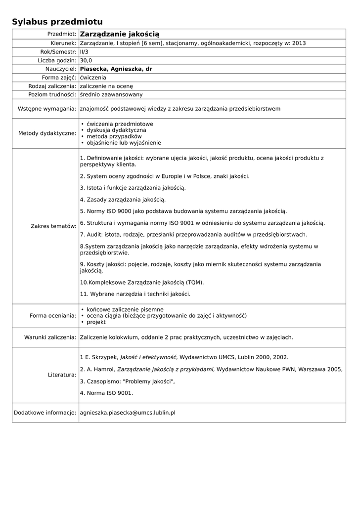 Sylabus przedmiotu Przedmiot: Zarządzanie jakością Kierunek: Zarządzanie, I stopień [6 sem], stacjonarny, ogólnoakademicki, rozpoczęty w: 2013 Rok/Semestr: II/3 Liczba godzin: 30,0 Nauczyciel: Piasecka, Agnieszka, dr Forma zajęć: ćwiczenia Rodzaj zaliczenia: zaliczenie na ocenę Poziom trudności: średnio zaawansowany Wstępne wymagania: znajomość podstawowej wiedzy z zakresu zarządzania przedsiebiorstwem • • Metody dydaktyczne: • • ćwiczenia przedmiotowe dyskusja dydaktyczna metoda przypadków objaśnienie lub wyjaśnienie 1. Definiowanie jakości: wybrane ujęcia jakości, jakość produktu, ocena jakości produktu z perspektywy klienta. 2. System oceny zgodności w Europie i w Polsce, znaki jakości. 3. Istota i funkcje zarządzania jakością. 4. Zasady zarządzania jakością. 5. Normy ISO 9000 jako podstawa budowania systemu zarządzania jakością. Zakres tematów: 6. Struktura i wymagania normy ISO 9001 w odniesieniu do systemu zarządzania jakością. 7. Audit: istota, rodzaje, przesłanki przeprowadzania auditów w przedsiębiorstwach. 8.System zarządzania jakością jako narzędzie zarządzania, efekty wdrożenia systemu w przedsiębiorstwie. 9. Koszty jakości: pojęcie, rodzaje, koszty jako miernik skuteczności systemu zarządzania jakością. 10.Kompleksowe Zarządzanie Jakością (TQM). 11. Wybrane narzędzia i techniki jakości. • końcowe zaliczenie pisemne Forma oceniania: • ocena ciągła (bieżące przygotowanie do zajęć i aktywność) • projekt Warunki zaliczenia: Zaliczenie kolokwium, oddanie 2 prac praktycznych, uczestnictwo w zajęciach. 1 E. Skrzypek, Jakość i efektywność, Wydawnictwo UMCS, Lublin 2000, 2002. Literatura: 2. A. Hamrol, Zarządzanie jakością z przykładami, Wydawnictow Naukowe PWN, Warszawa 2005, 3. Czasopismo: "Problemy Jakości", 4. Norma ISO 9001. Dodatkowe informacje: [email protected]