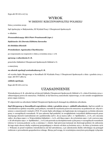 Sygn.akt III AUa 107/15 WYROK W IMIENIU RZECZYPOSPOLITEJ POLSKIEJ Dnia 3 września 2015r. Sąd Apelacyjny w Białymstoku, III Wydział Pracy i Ubezpieczeń Społecznych w składzie: Przewodniczący: SSA Piotr Prusinowski (spr.) Sędziowie: SA Dorota Elżbieta Zarzecka SA Bohdan Bieniek Protokolant: Agnieszka Charkiewicz po rozpoznaniu na rozprawie w dniu 3 września 2015 r. w B. sprawy z odwołania S. R. przeciwko Zakładowi Ubezpieczeń Społecznych Oddział w O. o emeryturę na skutek apelacji wnioskodawcy S. R. od wyroku Sądu Okręgowego w Suwałkach III Wydziału Pracy i Ubezpieczeń Społecznych z dnia 1 grudnia 2014 r. sygn. akt III U 382/14 oddala apelację. Sygn akt III AUa 107/15 UZASADNIENIE Wnioskodawca S. R. odwołał się od decyzji Zakładu Ubezpieczeń Społecznych Oddział w O. z dnia 8 kwietnia 2014 r. odmawiającej prawa do emerytury. Podniósł, że był kierowcą samochodu ciężarowego, co nie zostało uwzględnione przez organ rentowy. W odpowiedzi na odwołanie Zakład Ubezpieczeń Społecznych domagał się oddalenia odwołania. Sąd Okręgowy w Suwałkach wyrokiem z dnia 1 grudnia 2014 r. oddalił odwołanie. Sąd ten ustalił, że wnioskodawca spełnia wszystkie, poza jednym, warunki do uzyskania prawa do emerytury na podstawie art. 184 ust 1 ustawy o emeryturach i rentach z FUS. W ocenie Sądu odwołujący nie legitymuje się wymaganym 15 letnim okresem pracy w szczególnych warunkach. W tym zakresie Sąd podniósł, że uwzględnienie wszystkich deklarowanych przez skarżącego okresów (zatrudnienie od 1 października 1976 r. do 31 marca 1981 r. w Spółdzielni (...) w S., od 1 stycznia 1985 r. do 5 lipca 1990 r. w Wojewódzkim Zakładzie (...) w S., od 6 lipca 1990 r. do 12 kwietnia 1991 r. i od 1 czerwca 1991 r. do 28 sierpnia 1991 r. w Spółdzielni (...) w S.) nie pozwala na skompletowanie 15 lat pracy w szczególnych warunkach (okresy te wynoszą jedynie 14 lat, 5 miesięcy i 1 dzień). Sąd pierwszej instancji nie dostrzegł podstaw do zaliczenia do tego stażu okresu służby wojskowej przypadającej w okresie od dnia 24 kwietnia 1974 r. do dnia 13 kwietnia 1976 r. Wskazał, że przed wojskiem wnioskodawca nie był zatrudniony, a po zakończeniu służby odwołujący się pomagał rodzicom w prowadzeniu gospodarstwa rolnego. Biorąc pod uwagę, że wcześniejsza emerytura przysługuje wyłącznie pracownikom, Sąd pierwszej instancji nie znalazł podstaw do uwzględnienia do stażu pracy w szczególnych warunkach okresu służby wojskowej. Apelacje złożył S. R. Nie formułując zarzutów i wniosków apelacyjnych stwierdził, że okres służby wojskowej powinien zostać uwzględniony do stażu warunkującego prawo do emerytury. Podkreślił, że w wojsku był kierowca samochodu ciężarowego. Z całokształtu apelacji można wnosić, że skarżący domaga się zmiany wyroku i przyznania prawa do emerytury. Sąd Apelacyjny zważył: Apelacja nie jest zasadna. Sąd odwoławczy akceptuje ustalenia faktyczne i ocenę prawną dokonaną przez Sąd Okręgowy w Suwałkach, co zwalnia od prowadzenia ponownych rozważań. Dopuszczalność uwzględnienia okresu służby wojskowej była już przedmiotem wypowiedzi orzeczniczych. Ostatnio dotychczasowy dorobek jurysdykcyjny został przedstawiony w uchwale Sądu Najwyższego z dnia 2 lipca 2015 r., III UZP 4/15 (nie publ.). Rozważania zawarte w tym orzeczeniu są pomocne w przedmiotowej sprawie. Sąd Najwyższy zwrócił uwagę na uchwałę składu siedmiu sędziów Sądu Najwyższego z dnia 16 października 2013 r., II UZP 6/13 OSNP 2014, nr 3, poz. 42, w której przyjęto, że czas zasadniczej służby wojskowej odbytej w okresie obowiązywania art. 108 ust. 1 ustawy o powszechnym obowiązku obrony Polskiej Rzeczypospolitej Ludowej (w brzmieniu obowiązującym do dnia 31 grudnia 1974 r.) zalicza się -na warunkach wynikających z tego przepisu -do okresu pracy wymaganego do nabycia prawa do emerytury w niższym wieku emerytalnym stosownie do art. 184 w związku z art. 32 ust. 1 ustawy o emeryturach i rentach z FUS. W uzasadnieniu tej uchwały powiększony skład Sądu Najwyższego stwierdził, że rozstrzygany problem nie dotyczy ujmowania zasadniczej służby wojskowej jako okresu składkowego (albo zaliczanego w rozumieniu poprzednich regulacji emerytalnych), lecz sprowadza się do określenia, czy ta służba jest równoznaczna z okresem pracy w szczególnych warunkach, wymaganym do nabycia wcześniejszej emerytury. Sąd Najwyższy wyraźnie zaznaczył, że na gruncie przepisów ubezpieczeniowych okres zasadniczej służby wojskowej nie jest obecnie i nigdy nie był okresem zatrudnienia (pozostawania w stosunku pracy), a to oznacza, że w okresie odbywania zasadniczej służby wojskowej żołnierz nie był pracownikiem zatrudnionym w szczególnych warunkach. Uwzględnienie okresu tej służby w stażu ubezpieczeniowym (jako okresu zaliczanego, albo równorzędnego), było możliwe -co najwyżej -tylko na podstawie odrębnego przepisu. Zgodnie z obowiązującym przed dniem 1 stycznia 1975 r. brzmieniem art. 108 ust. 1 ustawy o powszechnym obowiązku obrony PRL, okres odbytej zasadniczej lub okresowej służby wojskowej zaliczał się do okresu zatrudnienia, w zakresie wszelkich uprawnień związanych z zatrudnieniem, pracownikom, którzy po odbyciu tej służby podjęli zatrudnienie w tym samym zakładzie pracy, w którym byli zatrudnieni przed powołaniem do służby albo w tej samej gałęzi pracy. Dodatkowo art. 106 ust. 1 tej ustawy nakazywał pracodawcy, który zatrudniał pracownika w dniu powołania do zasadniczej służby wojskowej, do jego zatrudnienia na poprzednio zajmowanym stanowisku lub na stanowisku równorzędnym pod względem rodzaju pracy oraz zaszeregowania osobistego, jeżeli w ciągu 30 dni od dnia zwolnienia z tej służby pracownik zgłosił swój powrót do zakładu pracy w celu podjęcia zatrudnienia. Z kolei szczegółowe zasady zaliczenia zasadniczej służby wojskowej do okresu z