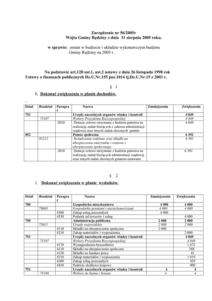 Zarządzenie nr 56/2005r Wójta Gminy Rędziny z dnia 31 sierpnia 2005 roku. w sprawie: zmian w budżecie i układzie wykonawczym budżetu Gminy Rędziny na 2005 r . Na podstawie art.128 ust.1, ust.2 ustawy z dnia 26 listopada 1998 rok Ustawy o finansach publicznych Dz.U.Nr.155 poz.1014 tj.Dz.U.Nr.15 z 2003 r. § 1 1. Dokonać zwiększenia w planie dochodów. Dział Rozdział Paragra f 751 75107 2010 852 85212 2010 Nazwa Zmniejszenia Urzędy naczelnych organów władzy i kontroli Wybory Prezydenta Rzeczypospolitej Dotacje celowe otrzymane z budżetu państwa na realizację zadań bieżących z zakresu administracji rządowej oraz innych zadań zleconych gminie Pomoc społeczna Świadczenia rodzinne oraz składki na ubezpieczenia emerytalne i rentowe z ubezpieczenia społecznego Dotacje celowe otrzymane z budżetu państwa na realizację zadań bieżących administracji rządowej oraz innych zadań zleconych gminom ustawami § Zwiększenia 4 849 4 849 4 849 6 392 6 392 6 392 2 1. Dokonać zwiększenia w planie wydatków. Dział Rozdział Paragra f 700 70005 4300 4530 750 75011 4110 4210 751 75107 4170 4110 4120 4210 4300 4410 751 75108 Nazwa Gospodarka mieszkaniowa Gospodarka gruntami i nieruchomościami Zakup usług pozostałych Podatek od towarów i usług Administracja publiczna Urzędy wojewódzkie Składki na ubezpieczenie społeczne Zakup materiałów i wyposażenia Urzędy naczelnych organów władzy i kontroli Wybory Prezydenta Rzeczypospolitej Wynagrodzenia bezosobowe Składki na ubezpieczenie społeczne Składki na fundusz pracy Zakup materiałów i wyposażenia Zakup usług pozostałych Podróże służbowe krajowe Urzędy naczelnych organów władzy i kontroli Wybory do Sejmu i Senatu Zmniejszenia 4 000 4 000 4 000 2 000 2 000 2 000 4 4 Zwiększenia 4 000 4 000 4 000 2 000 2 000 2 000 4 849 4 849 1 672 288 41 1 019 929 900 4 4 4300 4210 Zakup usług pozostałych Zakup materiałów i wyposażenia Pomoc społeczna Świadczenia rodzinne oraz składki na ubezpieczenia emerytalne i rentowe z ubezpieczenia społecznego Świadczenia społeczne 852 85212 3110 4 4 6 392 6 392 6 392 Zmiany w budżecie i w układzie wykonawczym budżetu gminy na 2005 r polegających na zwiększeniu w planie dochodów i wydatków dokonano w związku z otrzymaną decyzją Wojewody Śląskiego Nr.FB.I.3011-356/05 z dn.22.08.2005 r na zwiększenie dotacji ,decyzji Ministra Finansów z dn.02 sierpnia 2005 r znak FS3-11-17/2005 art.88 ustawy z dn.27.09.1990 r o wyborze Prezydenta Rzeczypospolitej Polskiej oraz inne zmiany w planie wydatków. Plan po zmianach: - dochody - wydatki - przychody - rozchody - 17.690.091,00 21.779.363,00 4.284.167,00 194.895,00 § 3 Wykonanie Zarządzenia powierza się Skarbnikowi Gminy w zakresie dokonania zmiany w planie dochodów i wydatków budżetu Gminy Rędziny na 2005rok . § 4 Zarządzenie wchodzi w życie z dniem jego podjęcia .