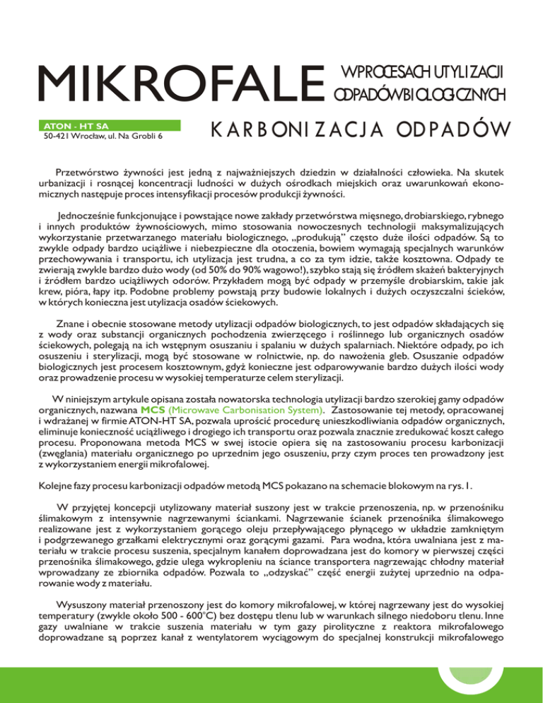 MIKROFALE ATON - HT SA 50-421 Wrocław, ul. Na Grobli 6 W PROCESACH UTYLIZACJI ODPADÓW BIOLOGICZNYCH K A R B O N I Z A C J A O D PA D Ó W Przetwórstwo żywności jest jedną z najważniejszych dziedzin w działalności człowieka. Na skutek urbanizacji i rosnącej koncentracji ludności w dużych ośrodkach miejskich oraz uwarunkowań ekonomicznych następuje proces intensyfikacji procesów produkcji żywności. Jednocześnie funkcjonujące i powstające nowe zakłady przetwórstwa mięsnego, drobiarskiego, rybnego i innych produktów żywnościowych, mimo stosowania nowoczesnych technologii maksymalizujących wykorzystanie przetwarzanego materiału biologicznego, „produkują” często duże ilości odpadów. Są to zwykle odpady bardzo uciążliwe i niebezpieczne dla otoczenia, bowiem wymagają specjalnych warunków przechowywania i transportu, ich utylizacja jest trudna, a co za tym idzie, także kosztowna. Odpady te zwierają zwykle bardzo dużo wody (od 50% do 90% wagowo!), szybko stają się źródłem skażeń bakteryjnych i źródłem bardzo uciążliwych odorów. Przykładem mogą być odpady w przemyśle drobiarskim, takie jak krew, pióra, łapy itp. Podobne problemy powstają przy budowie lokalnych i dużych oczyszczalni ścieków, w których konieczna jest utylizacja osadów ściekowych. Znane i obecnie stosowane metody utylizacji odpadów biologicznych, to jest odpadów składających się z wody oraz substancji organicznych pochodzenia zwierzęcego i roślinnego lub organicznych osadów ściekowych, polegają na ich wstępnym osuszaniu i spalaniu w dużych spalarniach. Niektóre odpady, po ich osuszeniu i sterylizacji, mogą być stosowane w rolnictwie, np. do nawożenia gleb. Osuszanie odpadów biologicznych jest procesem kosztownym, gdyż konieczne jest odparowywanie bardzo dużych ilości wody oraz prowadzenie procesu w wysokiej temperaturze celem sterylizacji. W niniejszym artykule opisana została nowatorska technologia utylizacji bardzo szerokiej gamy odpadów organicznych, nazwana MCS (Microwave Carbonisation System). Zastosowanie tej metody, opracowanej i wdrażanej w firmie ATON-HT SA, pozwala uprościć procedurę unieszkodliwiania odpadów organicznych, eliminuje konieczność uciążliwego i drogiego ich transportu oraz pozwala znacznie zredukować koszt całego procesu. Proponowana metoda MCS w swej istocie opiera się na zastosowaniu procesu karbonizacji (zwęglania) materiału organicznego po uprzednim jego osuszeniu, przy czym proces ten prowadzony jest z wykorzystaniem energii mikrofalowej. Kolejne fazy procesu karbonizacji odpadów metodą MCS pokazano na schemacie blokowym na rys. 1. W przyjętej koncepcji utylizowany materiał suszony jest w trakcie przenoszenia, np. w przenośniku ślimakowym z intensywnie nagrzewanymi ściankami. Nagrzewanie ścianek przenośnika ślimakowego realizowane jest z wykorzystaniem gorącego oleju przepływającego płynącego w układzie zamkniętym i podgrzewanego grzałkami elektrycznymi oraz gorącymi gazami. Para wodna, która uwalniana jest z materiału w trakcie procesu suszenia, specjalnym kanałem doprowadzana jest do komory w pierwszej części przenośnika ślimakowego, gdzie ulega wykropleniu na ściance transportera nagrzewając chłodny materiał wprowadzany ze zbiornika odpadów. Pozwala to „odzyskać” część energii zużytej uprzednio na odparowanie wody z materiału. Wysuszony materiał przenoszony jest do komory mikrofalowej, w której nagrzewany jest do wysokiej temperatury (zwykle około 500 - 600oC) bez dostępu tlenu lub w warunkach silnego niedoboru tlenu. Inne gazy uwalniane w trakcie suszenia materiału w tym gazy pirolityczne z reaktora mikrofalowego doprowadzane są poprzez kanał z wentylatorem wyciągowym do specjalnej konstrukcji mikrofalowego oczyszczacza gazu, w którym dopalane są w strefie o wysokiej temperaturze z dodatkowo wprowadzonym powietrzem. Proces ten prowadzony jest w opracowanym w firmie ATON-HT urządzeniu o nazwie MOS (Microwave Oxidation System), w którym znajduje się złoże nagrzanych mikrofalami specjalnych cerao o micznych kulek. Gazy przetłaczane przez takie złoże nagrzewają się do temperatury około 800 C - 1000 C i zawarte w nich składniki organiczne ulegają pełnemu utlenieniu (są skutecznie dopalane). Gorące gazy opuszczające mikrofalowy oczyszczacz gazów (MOS) wykorzystywane są z kolei do dogrzewania oleju zastosowanego do nagrzewania materiału w strefie suszenia materiału w przenośniku ślimakowym. System taki pozwala zminimalizować zużycie energii niezbędnej do odparowania dużej ilości wody z materiału. „odciąganie” pary wodnej z komory suszarki Zbiornik odpadów biologicznych Suszenie odpadów Zbiornik gorącego oleju z podgrzewaczem powietrze Mikrofalowy dopalacz zanieczyszczeń (MOS) Karbonizacja (nagrzewanie w reaktorze mikrofalowym bez dostępu tlenu) Generatory mikrofalowe Pojemnik na karbonizat (węgiel) Rys. 1. Schemat instalacji do unieszkodliwiania odpadów metodą karbonizacji (technologia MCS). Opisana pokrótce technologia termicznego przetwarzania odpadów (MCS) może być stosowana w różny sposób, zależnie od rodzaju przetwarzanych odpadów, ich składu i przewidywanego sposobu „zagospodarowania” produktów procesu. W wielu przypadkach celem procesu unieszkodliwiania np. osadów ściekowych może być jedynie ich osuszenie i sterylizacja (skuteczne zniszczenie niebezpiecznej flory bakteryjnej). Instalacja do prowadzenia takiego procesu nie będzie wyposażona w reaktor mikrofalowy do prowadzenia karbonizacji, a jedynie w pojemnik do szybkiego wychładzania wysuszonych osadów. Inną wersją instalacji opartej na opisanej technologii jest linia do unieszkodliwiania odpadów organicznych w zakładach drobiarskich. Odpady takie składać się mogą z krwi, łap kurzych i innych nieużytecznych w procesie produkcyjnym odpadów. Podobnie jest w przypadku unieszkodliwiania odpadów weterynaryjnych, np. powsta