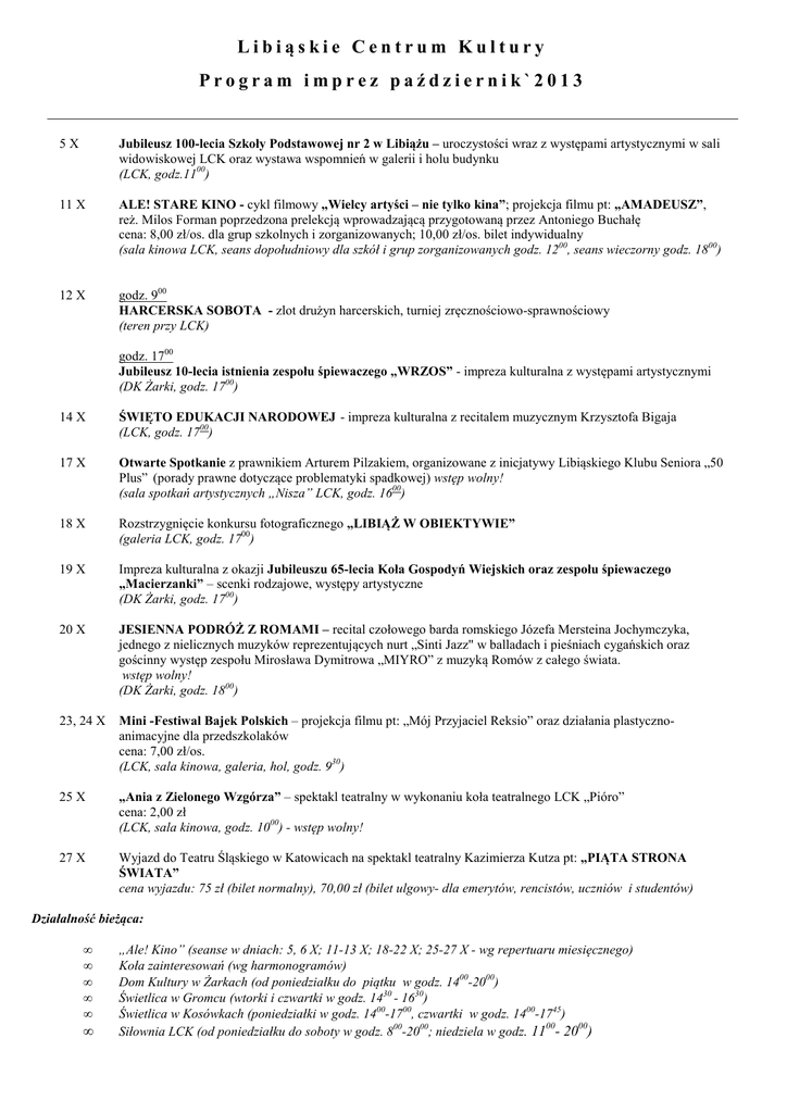 Libiąskie Centrum Kultury Program imprez październik`2013 5X Jubileusz 100-lecia Szkoły Podstawowej nr 2 w Libiążu – uroczystości wraz z występami artystycznymi w sali widowiskowej LCK oraz wystawa wspomnień w galerii i holu budynku (LCK, godz.1100) 11 X ALE! STARE KINO - cykl filmowy „Wielcy artyści – nie tylko kina”; projekcja filmu pt: „AMADEUSZ”, reż. Milos Forman poprzedzona prelekcją wprowadzającą przygotowaną przez Antoniego Buchałę cena: 8,00 zł/os. dla grup szkolnych i zorganizowanych; 10,00 zł/os. bilet indywidualny (sala kinowa LCK, seans dopołudniowy dla szkół i grup zorganizowanych godz. 1200, seans wieczorny godz. 1800) 12 X godz. 900 HARCERSKA SOBOTA - zlot drużyn harcerskich, turniej zręcznościowo-sprawnościowy (teren przy LCK) godz. 1700 Jubileusz 10-lecia istnienia zespołu śpiewaczego „WRZOS” - impreza kulturalna z występami artystycznymi (DK Żarki, godz. 1700) 14 X ŚWIĘTO EDUKACJI NARODOWEJ - impreza kulturalna z recitalem muzycznym Krzysztofa Bigaja (LCK, godz. 1700) 17 X Otwarte Spotkanie z prawnikiem Arturem Pilzakiem, organizowane z inicjatywy Libiąskiego Klubu Seniora „50 Plus” (porady prawne dotyczące problematyki spadkowej) wstęp wolny! (sala spotkań artystycznych „Nisza” LCK, godz. 1600) 18 X Rozstrzygnięcie konkursu fotograficznego „LIBIĄŻ W OBIEKTYWIE” (galeria LCK, godz. 1700) 19 X Impreza kulturalna z okazji Jubileuszu 65-lecia Koła Gospodyń Wiejskich oraz zespołu śpiewaczego „Macierzanki” – scenki rodzajowe, występy artystyczne (DK Żarki, godz. 1700) 20 X JESIENNA PODRÓŻ Z ROMAMI – recital czołowego barda romskiego Józefa Mersteina Jochymczyka, jednego z nielicznych muzyków reprezentujących nurt „Sinti Jazz" w balladach i pieśniach cygańskich oraz gościnny występ zespołu Mirosława Dymitrowa „MIYRO” z muzyką Romów z całego świata. wstęp wolny! (DK Żarki, godz. 1800) 23, 24 X Mini -Festiwal Bajek Polskich – projekcja filmu pt: „Mój Przyjaciel Reksio” oraz działania plastycznoanimacyjne dla przedszkolaków cena: 7,00 zł/os. (LCK, sala kinowa, galeria, hol, godz. 930) 25 X „Ania z Zielonego Wzgórza” – spektakl teatralny w wykonaniu koła teatralnego LCK „Pióro” cena: 2,00 zł (LCK, sala kinowa, godz. 1000) - wstęp wolny! 27 X Wyjazd do Teatru Śląskiego w Katowicach na spektakl teatralny Kazimierza Kutza pt: „PIĄTA STRONA ŚWIATA” cena wyjazdu: 75 zł (bilet normalny), 70,00 zł (bilet ulgowy- dla emerytów, rencistów, uczniów i studentów) Działalność bieżąca: • • • • • • „Ale! Kino” (seanse w dniach: 5, 6 X; 11-13 X; 18-22 X; 25-27 X - wg repertuaru miesięcznego) Koła zainteresowań (wg harmonogramów) Dom Kultury w Żarkach (od poniedziałku do piątku w godz. 1400-2000) Świetlica w Gromcu (wtorki i czwartki w godz. 1430 - 1630) Świetlica w Kosówkach (poniedziałki w godz. 1400-1700, czwartki w godz. 1400-1745) 00 00 Siłownia LCK (od poniedziałku do soboty w godz. 800-2000; niedziela w godz. 11 - 20 )