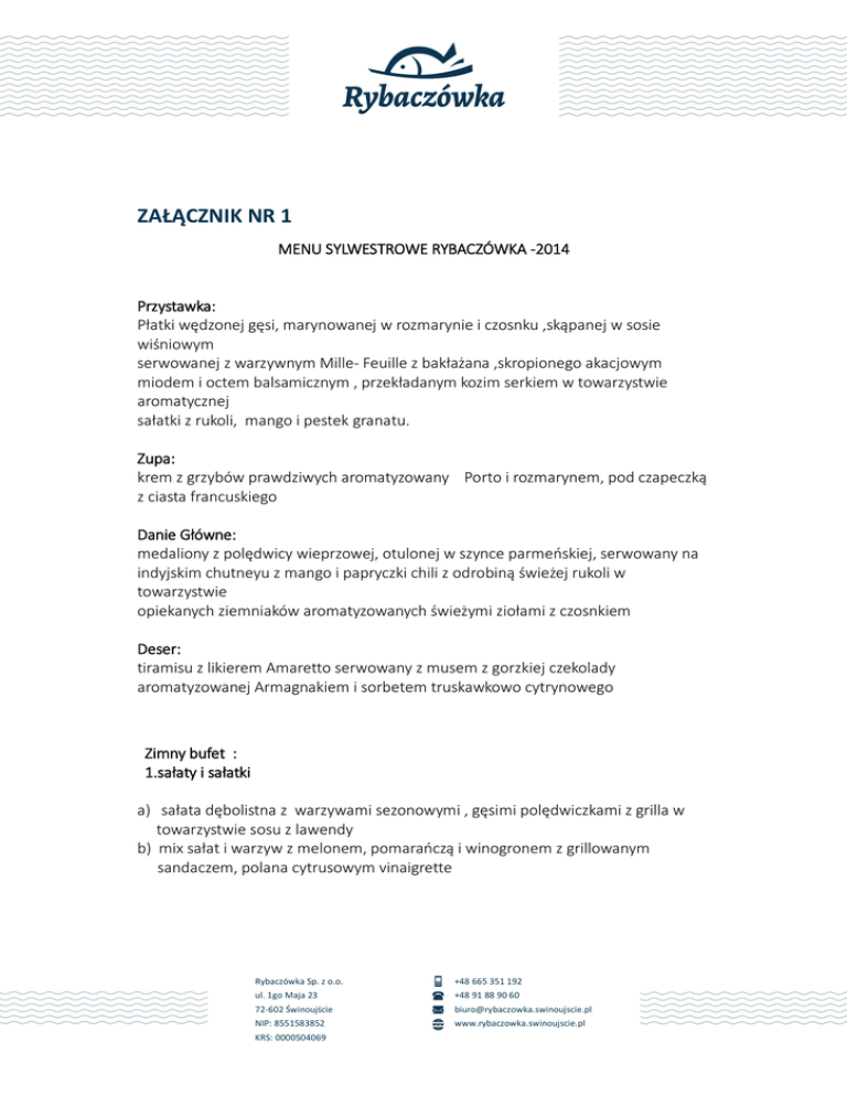 ZAŁĄCZNIK NR 1 MENU SYLWESTROWE RYBACZÓWKA -2014 Przystawka: Płatki wędzonej gęsi, marynowanej w rozmarynie i czosnku ,skąpanej w sosie wiśniowym serwowanej z warzywnym Mille- Feuille z bakłażana ,skropionego akacjowym miodem i octem balsamicznym , przekładanym kozim serkiem w towarzystwie aromatycznej sałatki z rukoli, mango i pestek granatu. Zupa: krem z grzybów prawdziwych aromatyzowany Porto i rozmarynem, pod czapeczką z ciasta francuskiego Danie Główne: medaliony z polędwicy wieprzowej, otulonej w szynce parmeńskiej, serwowany na indyjskim chutneyu z mango i papryczki chili z odrobiną świeżej rukoli w towarzystwie opiekanych ziemniaków aromatyzowanych świeżymi ziołami z czosnkiem Deser: tiramisu z likierem Amaretto serwowany z musem z gorzkiej czekolady aromatyzowanej Armagnakiem i sorbetem truskawkowo cytrynowego Zimny bufet : 1.sałaty i sałatki a) sałata dębolistna z warzywami sezonowymi , gęsimi polędwiczkami z grilla w towarzystwie sosu z lawendy b) mix sałat i warzyw z melonem, pomarańczą i winogronem z grillowanym sandaczem, polana cytrusowym vinaigrette Rybaczówka Sp. z o.o. +48 665 351 192 ul. 1go Maja 23 +48 91 88 90 60 72-602 Świnoujście [email protected] NIP: 8551583852 www.rybaczowka.swinoujscie.pl KRS: 0000504069 c) sałatka „VERDURA MISTA”(marynowane i grillowane warzywa w asyście ziół i czosnku , skąpane w oliwie z oliwek z dodatkiem białego octu balsamico) a) b) c) d) e) 2.zimne przekąski pescaccio z kiszonego łososia polane oliwa truflowa z piórkami kopru włoskiego z płatkami sera Bursztyn tatar ze śledzia matjas z pomarańczą ,na łódeczce z jabłek krewetki Black Tiger na salsie z papryki i mango podane w foremkach z ciasta kruchego deska mięs pieczystych , rolad i pasztetów własnego wyrobu z zimnymi sosami ryby wędzone : leszcz, lin, karp, miętus 3.dania gorące a) rolada z indyka nadziewana brokułami serwowana na sosie winnym Borgo Dei Vassali z kawałkami brzoskwiń b) warzywa parowane w maśle cytrynowo czosnkowym z prażonymi migdałami c) pikantny ryż w rytmie flamenco PO 24:00 a) Dzik w sosie z wędzonych śliwek , zapiekane z tymiankiem i czosnkiem ziemniaczki b) Dla wegan: kaszotto z kaszy pęczak z grzybem prawdziwym i rozmarynem – aby otrzymać propozycję wegańską należy wcześniej ją zamówić . Ponadto wybór ciast, ciasteczek, świeżych owoców: o sernik o szarlotka o tartaletki z owocami i galaretką o ciasto z makiem o ciastka kruche o patery świeżych owoców Rybaczówka Sp. z o.o. +48 665 351 192 ul. 1go Maja 23 +48 91 88 90 60 72-602 Świnoujście [email protected] NIP: 8551583852 www.rybaczowka.swinoujscie.pl KRS: 0000504069