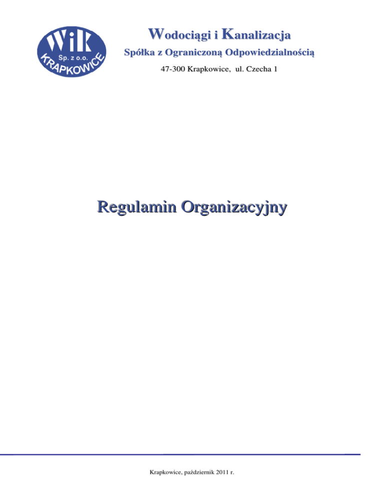 Wodociągi i Kanalizacja Spółka z Ograniczoną Odpowiedzialnością 4 7 - 3 0 0 K r a p k o w i c e , ul . C z e c h a 1 Regulamin Organizacyjny Krapkowice, październik 2011 r. SPIS TREŚCI Regulamin Organizacyjny ................................................................................................................................. 1 Rozdział I........................................................................................................................................................... 3 Dane podstawowe.............................................................................................................................................. 3 1. Postanowienia ogólne ............................................................................................................................ 3 2. Nazwa i status prawny Spółki ............................................................................................................... 3 3. Przedmiot działania Spółki .................................................................................................................... 3 4. Organy Spółki ........................................................................................................................................ 4 5. Sposób realizowania zadań statutowych Spółki .................................................................................... 5 6. Piony organizacyjne .............................................................................................................................. 5 7. Komórki organizacyjne ......................................................................................................................... 5 8. Stanowiska pracy ................................................................................................................................... 6 9. Służby pomocnicze ................................................................................................................................ 6 Rozdział II ......................................................................................................................................................... 6 Struktura organizacyjna ..................................................................................................................................... 6 1. Wykaz komórek organizacyjnych, stanowisk pracy i ich podległość służbowa. .................................. 6 1.1. Komórki podlegające Prezesowi ....................................................................................................... 6 1.2. Komórki podlegające Głównemu Księgowemu ................................................................................ 7 2. Oznaczenia symboliczne komórek organizacyjnych ............................................................................. 7 3. Zadania komórek organizacyjnych ........................................................................................................ 7 3.1. Pion Techniczny ................................................................................................................................ 7 3.2. Pion Ekonomiczny............................................................................................................................. 8 3.3. Specjalista ds. przetwarzania dokumentacji elektronicznej............................................................... 9 3.4. Informatyk operator map cyfrowych. ................................................................................................ 9 3.5. Usługi BHP i p.poż. ......................................................................................................................... 10 4. Podział stanowisk pracy. ..................................................................................................................... 11 5. Zadania, obowiązki, uprawnienia i odpowiedzialność pracowników. ................................................ 11 6. Zawartość merytoryczna zakresu zadań, obowiązków, uprawnień i odpowiedzialności pracownika 12 Rozdział III ...................................................................................................................................................... 13 Postanowienia końcowe .................................................................................................................................. 13 Krapkowice, październik 2011 r. Strona 2 z 13 Rozdział I Dane podstawowe 1. Postanowienia ogólne Niniejszy Regulamin organizacyjny określa strukturę organizacyjną Spółki z ograniczoną odpowiedzialnością pod firmą „Wodociągi i Kanalizacja” działającej w Krapkowicach, zwaną w dalszej treści Regulaminu organizacyjnego „Spółką”. Regulamin reguluje również zakres i zasady działania pionów i komórek organizacyjnych oraz normuje podstawowe zadania, obowiązki, uprawnienia i odpowiedzialność wszystkich pracowników Spółki. 2. Nazwa i status prawny Spółki Spółka jest podmiotem prawa handlowego działającym jako spółka z ograniczoną odpowiedzialnością. Siedziba Spółki mieści się pod adresem: 47-300 Krapkowice, ul. Czecha 1. Spółka działa w oparciu o Umowę Spółki z dnia 16.07.1992 r. zawartą w akcie notarialnym – repetytorium A nr 4737/1992 z późniejszymi zmianami (Rep. A nr 1169/1996 z dnia 29.03.1996r., Rep. A nr 2328/1997 z dn. 14.04.1997 r. Rep. A ), Kodeks spółek handlowych, ogólnie obowiązujące przepisy prawa dotyczącego wszystkich obszarów działania firmy oraz niniejszy regulamin. 3. Przedmiot działania Spółki Przedmiotem przedsiębiorstwa Spółki jest: Pozyskiwanie i dostarczanie wody dla celów bytowych i gospodarczych, - 36.00.Z - pobór, uzdatnianie i dostarczanie wody. - Świadczenie usług w zakresie odbioru i oczyszczania ścieków, - 37.00.Z - odprowadzanie i oczyszczanie ścieków, - 38.11.Z - zbieranie odpadów innych niż niebezpieczne. 