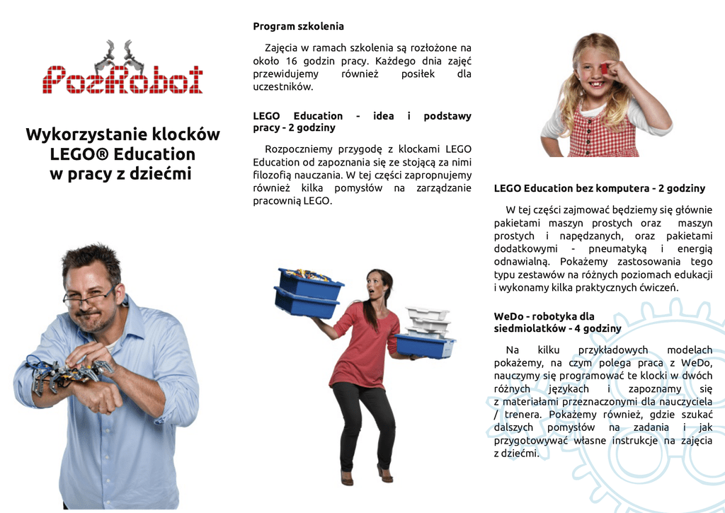 Program szkolenia Zajęcia w ramach szkolenia są rozłożone na około 1 6 godzin pracy. Każdego dnia zajęć przewidujemy również posiłek dla uczestników. Wykorzystanie klocków LEGO® Education w pracy z dziećmi LEGO Education - idea i podstawy pracy - 2 godziny Rozpoczniemy przygodę z klockami LEGO Education od zapoznania się ze stojącą za nimi filozofią nauczania. W tej części zapropnujemy również kilka pomysłów na zarządzanie pracownią LEGO. LEGO Education bez komputera - 2 godziny W tej części zajmować będziemy się głównie pakietami maszyn prostych oraz maszyn prostych i napędzanych, oraz pakietami dodatkowymi - pneumatyką i energią odnawialną. Pokażemy zastosowania tego typu zestawów na różnych poziomach edukacji i wykonamy kilka praktycznych ćwiczeń. WeDo - robotyka dla siedmiolatków - 4 godziny Na kilku przykładowych modelach pokażemy, na czym polega praca z WeDo, nauczymy się programować te klocki w dwóch różnych językach i zapoznamy się z materiałami przeznaczonymi dla nauczyciela / trenera. Pokażemy również, gdzie szukać dalszych pomysłów na zadania i jak przygotowywać własne instrukcje na zajęcia z dziećmi. Informacje szczegółowe Dokładne terminy oraz miejsce szkolenia można odszukać na naszej stronie internetowej (http://pozrobot.pl/). O fundacji LEGO Mindstorms NXT - 8 godzin Rozpoczniemy od zbudowania klasycznego robota szkoleniowego, na którego przykładzie zapoznamy się z językiem programowania NXT-G. Rozpoczniemy od prostych zadań z pomocą prowadzącego a zakończymy na samodzielnie rozwiązywanym zadaniu problemowym, wymagającym przebudowy robota i napisania odpowiedniego programu sterującego. Oprócz tego zapoznamy się z różnymi aplikacjami pomagającymi w pracy z NXT, pokażemy też alternatywne języki programowania i - podobnie jak w przypadku WeDo - zapoznamy się niektórymi materiałami dla nauczyciela / trenera oraz wskażemy miejsca poszukiwania inspiracji w tworzeniu własnych zajęć. Fundacja PozRobot jest partnerem szkoleniowym firmy AKCES edukacja wyłącznego dystrybutora produktów edukacyjnych firmy LEGO Education. Oprócz działalności szkoleniowej fundacja zajmuje się również organizacją Wielkopolskiej Ligi Robotyki oraz ogólnopolskiego konkursu robotyki PozRobot, który od 201 2 roku jest częścią Światowej Olimpiady Robotyki (WRO). Fundacja PozRobot, zgodnie z zaświadczeniem nr 7/201 1 Starosty Poznańskiego z dnia 20.09.201 1 jest wpisana do Rejestru Szkół i Placówek Niepublicznych pod numerem kancelaryjnym RASiPN-01 09 jako Centrum Kształcenia Ustawicznego PozRobot. Dane kontaktowe Adres: ul. Graniczna 7, 62-081 Baranowo regon: 301 743722 NIP: 781 1 866056 http://pozrobot.pl/ [email protected] +48 609571 434
