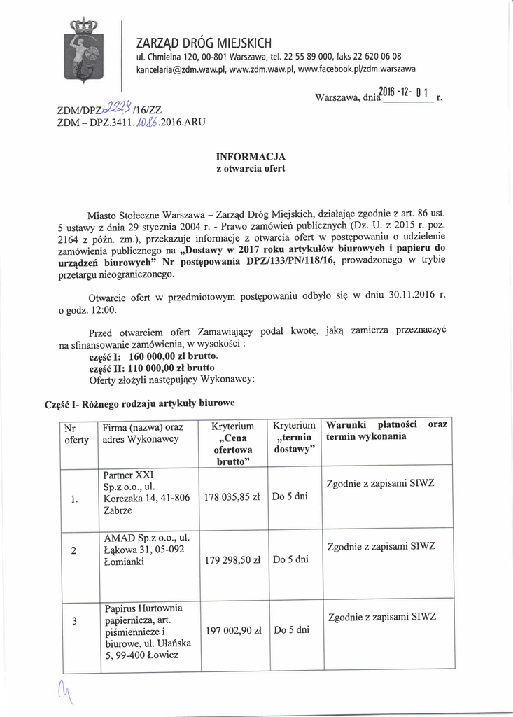 ZARZAD DROG MIEJSKICH ul.⊂ hmielna 1 20,00-801 Warszawal tel,22 55 89 000ffaks 22 620 06 08 kanceladac〉 Zdm.Waw,pl,www.zdmowaw.pl,www.facebook`pVzdm.Warszawa warszawa, dnia2ol6 -12- [l 1 r. zDMnPZPllt n6/zz zDlil - DP 2.3 4r | . 1,0 ll. 20 1 6.ARU INFORMACJA z otwarcla ofert Miasto Stoleczne Warszawa - Zaruqd Dr6g Miejskich, dzialajqc zgodnie z art. 86 ust' 5 ustawy z dnia 29 stycznia 2004 r. - Prawo zam6wieri publicznych (Dz. U. z 2015 t. poz. 2164 z p6Ln. zm.), przekazuje informacje z otwarcia ofert w postqpowaniu o udzielenie zam6wienia publicznlgo na ,,Dostawy w 2017 roku artykukiw biurowych i papieru do urzqdzeft biurorvychi N. postppowania DPZ1L33/PN/118/16, prowadzonego w trybie przetargu nieograniczonego. Otwarcie ofert w przedmiotowym postqpowaniu odbylo sig w dniu 30.11.2016 r. o godz. 12:00. przed otwarciem ofert Zanawiajqcy podal kwotg, iakq zanietza przeznaczyO na sfinansowanie zam6wienia, w wysokoSci : czpsd I: 160 000'00 zl brutto. czg56 II: 110 000'00 zl brutto Oferty zlozyli nastqpuj 4cy Wykonawcy: Czp56I- R62nego rodzaju artykuty biurowe Nr oferty Firma (nazwa) otaz adres Wykonawcy Kryterium ,rCena ofertowa Kryterium ,rtermin dostawyt' Warunki platno5ci oraz termin wykonania brutto" Partner )O(I Sp.z o.o., ul. Korczaka 14,41-806 Zabrze 1 Zgodnie zzapisani SIWZ 178035,85 zl Do5 d面 AⅣ lAD Sp.zo.o,,ul. 2 Lttowa 31,05-092 Lomianki つ0 Papirus Hurtownia papiernicza, art. piSmiennicze i biurowe, ul. Ulanska 5.99-400 N'owicz Zgo dnie z zapisarni 179298,50 zl Do 5 dni 197002,90 zl Do 5 dni S IWZ Zgodnie z zapisarni SIWZ ZARZAD DROG MIEJSKICH tel.225589000,faks 22 620 06 08 kanceladac)Zdm.WaⅧ pl,www.ZdmoWa‖ pl,www.facebooktpVzdm,warszawa ul.⊂ hmielna 1 20,00-801 Warszawa′ CzpS6,II- n6inego rcdzaiu papier do urzqdzeti biurowych Nr oferty Firma (nazwa) oraz adres Wykonawcy Kryterium ,rCena ofertowa Kryterium ,rtermin dostawy" Warunki platnoSci orarz termin wykonania bruttott Zgodniezzapisani SIWZ Partner XXI Sp.zo.o。 ,ul. Korczaka 14,41‐ 115536,80 zl Do 5 dni 122880,20 zl Do 5 dni 806 Zabrze 2 AMAD Spoz o,o., ul.LakOWa 31,05092 Lomianki Zgodnezzapisari SIWZ │ DYRJKTOR ZARZADU DttG MIEJSttCH A.R. [email protected]