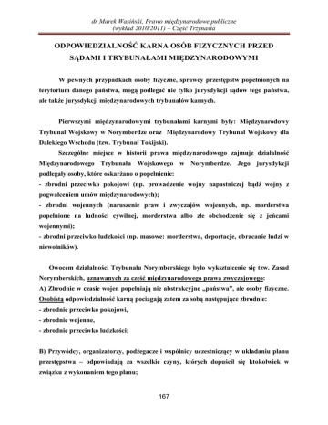 dr Marek Wasiński, Prawo międzynarodowe publiczne (wykład 2010/2011) – Część Trzynasta ODPOWIEDZIALNOŚĆ KARNA OSÓB FIZYCZNYCH PRZED SĄDAMI I TRYBUNAŁAMI MIĘDZYNARODOWYMI W pewnych przypadkach osoby fizyczne, sprawcy przestępstw popełnionych na terytorium danego państwa, mogą podlegać nie tylko jurysdykcji sądów tego państwa, ale także jurysdykcji międzynarodowych trybunałów karnych. Pierwszymi międzynarodowymi trybunałami karnymi były: Międzynarodowy Trybunał Wojskowy w Norymberdze oraz Międzynarodowy Trybunał Wojskowy dla Dalekiego Wschodu (tzw. Trybunał Tokijski). Szczególne miejsce w historii prawa międzynarodowego zajmuje działalność Międzynarodowego Trybunału Wojskowego w Norymberdze. Jego jurysdykcji podlegały osoby, które oskarżano o popełnienie: - zbrodni przeciwko pokojowi (np. prowadzenie wojny napastniczej bądź wojny z pogwałceniem umów międzynarodowych); - zbrodni wojennych (naruszenie praw i zwyczajów wojennych, np. morderstwa popełnione na ludności cywilnej, morderstwa albo złe obchodzenie się z jeńcami wojennymi); - zbrodni przeciwko ludzkości (np. masowe: morderstwa, deportacje, obracanie ludzi w niewolników). Owocem działalności Trybunału Norymberskiego było wykształcenie się tzw. Zasad Norymberskich, uznawanych za część międzynarodowego prawa zwyczajowego: A) Zbrodnie w czasie wojen popełniają nie abstrakcyjne „państwa”, ale osoby fizyczne. Osobistą odpowiedzialność karną pociągają zatem za sobą następujące zbrodnie: - zbrodnie przeciwko pokojowi, - zbrodnie wojenne, - zbrodnie przeciwko ludzkości; B) Przywódcy, organizatorzy, podżegacze i wspólnicy uczestniczący w układaniu planu przestępstwa – odpowiadają za wszelkie czyny, których dopuścił się ktokolwiek w związku z wykonaniem tego planu; 167 dr Marek Wasiński, Prawo międzynarodowe publiczne (wykład 2010/2011) – Część Trzynasta C) Stanowisko urzędowe oskarżonego nie może stanowić podstawy uwolnienia go od odpowiedzialności karnej; D) Działanie w wykonaniu rozkazu nie uwalnia od odpowiedzialności karnej. *** W latach 90 tych XX wieku Rada Bezpieczeństwa ONZ powołała dwa trybunały ad hoc: Międzynarodowy Trybunał Karny ds. Zbrodni Wojennych w byłej Jugosławii oraz Międzynarodowy Trybunał Karny ds. Zbrodni Wojennych w Rwandzie. Były one jednak powołane do sądzenia sprawców przestępstw popełnionych w konkretnych konfliktach zbrojnych. Do trybunałów powoływanych ad hoc należą także tzw. trybunały hybrydowe, tzn. łączące w sobie elementy jurysdykcji krajowej i międzynarodowej: Nadzwyczajne Izby Orzekające w Kambodży (http://www.eccc.gov.kh/), Specjalne Składy Sądzące ds. Poważnych Zbrodni Wojennych na Timorze Wschodnim, Specjalny Sąd Karny dla Sierra Leone (http://www.sc-sl.org/) oraz Specjalny Trybunał Libański (http://www.stltsl.org/). Pierwszym stałym międzynarodowym sądem karnym jest Międzynarodowy Trybunał Karny z siedzibą w Hadze (http://www.icc-cpi.int/). Utworzony został na podstawie umowy międzynarodowej, czyli Statutu MTK, podpisanego w Rzymie w 1998 roku. Statut MTK wszedł w życie w lipcu 2002 roku. Jest on już zatem instytucją działającą. Stronami Statutu MTK jest już 114 państw (stan na dzień 12 października 2010 roku). Polska jest stroną Statutu. Pod względem czasowym (ratione temporis): jurysdykcja MTK obejmuje wyłącznie zbrodnie popełnione po dniu 1 lipca 2002 roku (a zatem po wejściu w życie Statutu Trybunału). Pod względem przedmiotowym (ratione materiae): jurysdykcji MTK podlegają sprawcy: 168 dr Marek Wasiński, Prawo międzynarodowe publiczne (wykład 2010/2011) – Część Trzynasta - zbrodni ludobójstwa; Art. 6 Statutu MTK „Dla celów niniejszego statutu "ludobójstwo" oznacza którykolwiek z następujących czynów, dokonany z zamiarem zniszczenia w całości lub części grupy narodowej, etnicznej, rasowej lub religijnej, takich jak: (a) zabójstwo członków grupy; (b) spowodowanie poważnego uszkodzenia ciała lub rozstroju zdrowia psychicznego członków grupy; (c) rozmyślne stworzenie dla grupy warunków życia, obliczonych na spowodowanie jej całkowitego lub częściowego zniszczenia fizycznego; (d) stosowanie środków, które mają na celu wstrzymanie urodzin w obrębie grupy; (e) przymusowe przekazywanie dzieci członków grupy do innej grupy”. - zbrodni przeciwko ludzkości Art. 7 Statutu MTK „1. Dla celów niniejszego statutu "zbrodnia przeciwko ludzkości" oznacza którykolwiek z następujących czynów, popełniony w ramach rozległego lub systematycznego, świadomego ataku skierowanego przeciwko ludności cywilnej: (a) zabójstwo; (b) eksterminacja; (c) niewolnictwo; (d) deportacja lub przymusowe przemieszczanie ludności; (e) uwięzienie lub inne dotkliwe pozbawienie wolności fizycznej z naruszeniem podstawowych reguł prawa międzynarodowego; (f) tortury; (g) zgwałcenie, niewolnictwo seksualne, przymusowa prostytucja, wymuszona ciąża, przymusowa sterylizacja oraz jakiekolwiek inne formy przemocy seksualnej porównywalnej wagi; (h) prześladowanie jakiejkowiek możliwej do zidentyfikowania grupy lub zbiorowości z powodów politycznych, rasowych, narodowych, etnicznych, kulturowych, religijnych, płci (gender) w rozumieniu ustępu 3 lub z innych powodów powszechnie uznanych za niedopuszczalne na podstawie prawa międzynarodowego, w związku z jakimkolwiek czynem, 169 dr Marek Wasiński, Prawo międzynarodowe publiczne (wykład 2010/2011) – Część Trzynasta do którego odnosi się niniejszy ustęp, lub z jakąkolwiek zbrodnią objętą jurysdykcją Trybunału; (i) wymuszone zaginięcia osób; (j) zbrodnia apartheidu; (k) inne nieludzkie czyny o podobnym charakterze celowo powodujące ogromne cierpienie lub poważne uszkodzenie ciała albo zdrowia psychicznego lub fizycznego […]”. - zbrodni wojennych Art. 8 Statutu MTK „Dla celów niniejszego statutu "zbrodnie wojenne" oznaczają [międz