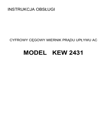 INSTRUKCJA OBSŁUGI CYFROWY CĘGOWY MIERNIK PRĄDU UPŁYWU AC MODEL KEW 2431 1. CECHY CHARAKTERYSTYCZNE ; Cyfrowy miernik cęgowy przeznaczony do pomiaru prądu upływu AC ; Specjalnie ukształtowane szczęki pomiarowe w formie „kropli” ułatwiają przeprowadzanie pomiarów wszędzie tam, gdzie dotarcie do miejsca pomiaru sprawia szczególny problem (duża ilość przewodów, wąskie szczeliny itp.) ; Funkcja Data Hold umożliwiająca odczyt pomiarów przy niedostatecznym oświetleniu lub w trudno dostępnych miejscach ; Filtr dolnoprzepustowy w celu wyeliminowania harmonicznych generowanych np. przez falowniki ; Funkcja automatycznego wyłączania w celu przedłużenia żywotności baterii 2. UWAGI DOTYCZĄCE BEZPIECZEŃSTWA Niniejsza instrukcja obsługi zawiera ostrzeżenia oraz zalecenia dotyczące bezpieczeństwa, które muszą być spełnione przez użytkownika aby zapewnić mu bezpieczne operowanie przyrządem pomiarowym, oraz dotyczące przechowywania go we właściwych warunkach. Dlatego też należy dokładnie przeczytać niniejszą instrukcję przed przystąpieniem do pomiarów. Ì OSTRZEŻENIE • Należy dokładnie i ze zrozumieniem przeczytać uwagi i zalecenia zawarte w tej instrukcji obsługi. • Miej niniejszą instrukcję „pod ręką”, aby zawsze gdy jest to niezbędne móc się do niej odnieść. • Należy dokonywać tylko takich pomiarów do jakich miernik ten został zaprojektowany, zgodnie z opisanymi w tej instrukcji procedurami. • Upewnij się czy zrozumiałeś i czy przestrzegasz wszystkich zaleceń dotyczących bezpieczeństwa zawartych w tej instrukcji. W przeciwnym wypadku może dojść do wypadku, zniszczenia miernika lub uszkodzenia testowanego urządzenia. Ten symbol Ì umieszczony na mierniku oznacza, że użytkownik musi się odnieść do odpowiednich rozdziałów niniejszej instrukcji aby bezpiecznie dokonać pomiarów Ì NIEBEZPIECZEŃSTWO określa takie warunki i działania, które z pewnym prawdopodobieństwem mogą spowodować poważne wypadki lub obrażenia Ì OSTRZEŻENIE określa takie warunki i działania, które mogą spowodować poważne wypadki lub ciężkie obrażenia Ì UWAGA określa takie warunki i działania, które mogą spowodować wypadek lub uszkodzenie urządzeń/miernika. Ì NIEBEZPIECZEŃSTWO • Nie wolno dokonywać pomiarów w obwodzie powyżej 300V AC. Miernik jest przeznaczony do pomiarów w obwodach niskiego napięcia do 300V AC. • Nie wolno dokonywać pomiarów w otoczeniu, w którym obecne są gazy palne. W przeciwnym razie używanie miernika w tych warunkach może wywołać iskrzenia i spowodować eksplozję. • Szczęki miernika są wykonane z metalu i ich końcówki nie są izolowane. Zalecamy daleko idącą ostrożność ze względu na możliwość zwarcia w przypadku, jeśli mierzony obwód ma odsłonięte części przewodzące prąd. • Nigdy nie wolno przystępować do pomiarów jeżeli użytkownik ma mokre lub wilgotne dłonie. • Nie wolno przekraczać maksymalnych dozwolonych wartości na danym zakresie pomiarowym. • Nie wolno otwierać przedziału baterii w czasie gdy dokonywane są pomiary. Ì OSTRZEŻENIE • Nie wolno dokonywać żadnych pomiarów jeżeli naruszona została struktura miernika (uszkodzona obudowa lub odkryte metalowe części). • Nie wolno samodzielnie dokonywać żadnych przeróbek ani napraw miernika. Należy zwrócić się do dystrybutora jeżeli miernik wymaga naprawy lub ponownej kalibracji. • Zawsze należy wyłączyć miernik przed otwarciem przedziału baterii. Ì UWAGA • Upewnij się przed przystąpieniem do pomiarów, że przełącznik zakresów jest ustawiony we właściwej pozycji. • Upewnij się, po zakończeniu pomiarów przełącznik zakresów jest ustawiony w poz. OFF. Gdy miernik nie będzie używany przez dłuższy okres czasu należy wyjąć z niego baterie. • Nie należy narażać miernika na bezpośrednie ekstremalnych temperatur oraz zawilgocenia. działanie słońca, 3. SPECYFIKACJA DOKŁADNOŚĆ ZAKRES 20mA 0 ~ 19.99mA 200mA 0 ~ 199.9mA 0 ~ 100.0A 200A 100.1~199.9A Pozycja przełącznika częstotliwości WIDE 50/60 ±2.0%odcz. ±4cyfry (50/60Hz) ±3.0%odcz. ±5cyfr (50/60Hz) ±5.0%odcz.±6cyfr (40~400Hz) ±5.0%odcz. ±4cyfry (50/60Hz) ±5.0%odcz. ±5cyfr (50/60Hz) Sygnalizacja przekroczenia zakresu : migająca „1” na najwyższej cyfrze Czas odpowiedzi : około 2s Próbkowanie Zamrożenie pomiarów „HOLD” : 2x/s : na wszystkich zakresach Temperatura i wilgotność przechowywania : -10°C ~ 50°C przy wilgotności wzgl.(RH)<75% (bez kondensacji) Temperatura i wilgotność pracy : 0°C ~ 40°C przy wilgotności wzgl.(RH)<85% (bez kondensacji) Zasilanie : dwie baterie LR44 lub SR44 Pobór prądu : około 5mA Żywotność baterii : około 15 godzin pracy ciągłej Automatyczne wyłączanie zasilania : po około 10 minutach od włączenia miernika Zabezpieczenie : 300A AC przez 1 minutę Wytrzymałość elektryczna : 1000V AC przez 1 minutę pomiędzy obudową i metalowymi elementami szczęk. Maksymalna średnica przewodu : 24mm Wymiary : 149 x 60 x 26mm Waga : około120g (z bateriami) Akcesoria : Instrukcja obsługi, dwie baterie LR44, futerał. Opcje dodatkowe : Multi-Tran Model 8004, 8008 4. INSTRUKCJA OBSŁUGI 4-1 Pomiary prądu AC Ì NIEBEZPIECZEŃSTWO • Nie wolno dokonywać pomiarów w obwodzie powyżej 300V AC • Szczęki miernika są wykonane z metalu, a ich końcówki nie są izolowane. Zalecamy daleko idącą ostrożność ze względu na możliwość zwarcia w przypadku, jeśli mierzony obwód ma odsłonięte części przewodzące prąd. • Nie wolno przystępować do pomiarów jeżeli przedziału baterii jest otwarty. Ì UWAGA • Szczęki miernika, a w szczególności ich końcówki zostały precyzyjnie wyregulowane w celu osiągnięcia maksymalnej dokładności. Należy więc unikać uderzeń, wstrząsów i przykładania nadmiernej siły do miernika. • Szczęki miernika nie zamkną się do końca jeżeli jakieś ciało obc