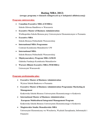 Rating MBA 2012: (uwaga: programy w klasach ratingowych są w kolejności alfabetycznej) Programy mistrzowskie: Canadian Executive MBA (CEMBA) Szkoła Główna Handlowa w Warszawie Executive Master of Business Administration Wielkopolska Szkoła Biznesu przy Uniwersytecie Ekonomicznym w Poznaniu Executive MBA Szkoła Biznesu Politechniki Warszawskiej International MBA Programme Centrum Kształcenia Menedżerów UW International MBA Szkoła Biznesu Politechniki Warszawskiej Międzynarodowy Program MBA GFKM Gdańska Fundacja Kształcenia Menedżerów Warsaw-Illinois Executive MBA (WIEMBA) Uniwersytet Warszawski Programy profesjonalne plus: Executive Master of Business Administration Wyższa Szkoła Bankowa w Poznaniu Executive Master of Business Administration Programme Marketing & Management Krakowska Szkoła Biznesu Uniwersytetu Ekonomicznego w Krakowie International Master of Business Administration European Multicultural Integrated Management Program Krakowska Szkoła Biznesu Uniwersytetu Ekonomicznego w Krakowie Magisterskie Studia Menedżerskie MBA Uniwersytet Ekonomiczny we Wrocławiu, Wydział Zarządzania, Informatyki i Finansów Podyplomowe Studia Menedżerskie Executive Master of Business Administration Zachodniopomorska Szkoła Biznesu Viadrina MBA - Management for Central and Eastern Europe Europa Universitat Viadrina Programy profesjonalne: Francusko-Polskie Studia Podyplomowe w zakresie Zarządzania - Program „Master Administration des Entreprises” Centrum Francusko-Polskich Studiów w zakresie Zarządzania Uniwersytetu Ekonomicznego w Poznaniu Franklin University MBA Wyższa Szkoła Bankowa we Wrocławiu Master of Business Administration Społeczna Akademia Nauk w Łodzi Master of Business Administration Uniwersytet Gdański Master of Business Administration Wyższa Szkoła Biznesu - National Louis University MBA „Zarządzanie w Agrobiznesie” Wydział Ekonomiczno-Rolniczy Szkoły Głównej Gospodarstwa Wiejskiego Polsko-francuski program studiów w zakresie zarządzania typu MBA Uniwersytet Łódzki Program MBA Wyższa Szkoła Bankowa we Wrocławiu Programy obiecujące: BREmba (Wewnętrzny Program Studiów MBA) Gdańska Fundacja Kształcenia Menedżerów General MBA Wyższa Szkoła Bankowa w Gdańsku Master of Business Administration Wyższa Szkoła Handlowa we Wrocławiu Master of Science Finances and Auditing Śląska Międzynarodowa Szkoła Handlowa i UE w Katowicach Podyplomowe Studia Menadżerskie EXECUTIVE MASTER OF BUSINESS ADMINISTRATION IN IT Zachodniopomorska Szkoła Biznesu Szkoła Biznesu – Institute of Business Studies Politechnika Krakowska Programy aspirujące: MBA Zarządzanie Strategiczne Programami i Projektami Politechnika Gdańska Studia Podyplomowe „Polsko-Amerykańska Szkoła Biznesu” Politechnika Wrocławska