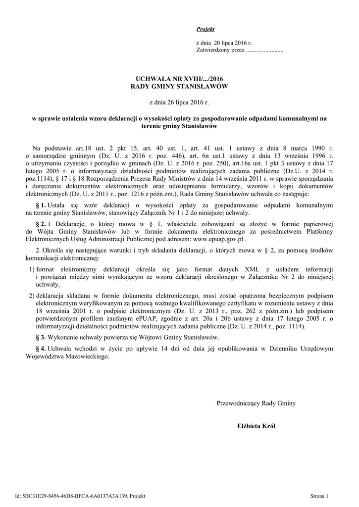 Projekt uchwały w sprawie ustalenia wzoru deklaracji o wysokości