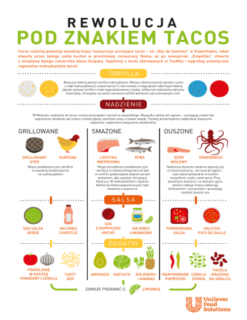 REWOLUCJA POD ZNAKIEM TACOS Coraz częściej powstają wysokiej klasy restauracje serwujące tacos – od „Hija de Sanchez” w Kopenhadze, lokal otwarty przez byłego szefa kuchni w prestiżowej restauracji Noma, aż po nowojorski „Empellón” otwarty z inicjatywy byłego cukiernika Alexa Stupaka. Zapomnij o tacos oferowanych w TexMex i wypróbuj autentyczne regionalne meksykańskie tacos! TORTILLA Bazą jest dobrej jakości tortilla kukurydziana. Możesz własnoręcznie wyrobić ciasto z mąki kukurydzianej („masa harina”) i uformować z niego placki albo kupić dobrej jakości gotowe tortille z mąki wyprodukowanej z białej, żółtej lub niebieskiej odmiany kukurydzy. Dostępne są nawet czerwone tortille barwione sproszkowanym chili. NADZIENIE W Meksyku nadzienie do tacos można przyrządzić niemal ze wszystkiego. Wszystko zależy od regionu – występują nawet tak egzotyczne składniki jak mięso z koziej głowy, świńskie uszy, a nawet owady. Poniżej prezentujemy najbardziej klasyczne nadzienia i optymalne połączenia składników. GRILLOWANE GRILLOWANY STEK SMAŻONE KURCZAK Mięso poddawane jest obróbce w wysokiej temperaturze na suchej patelni. DUSZONE ŁOPATKA WIEPRZOWA RYBA Mięso początkowo poddawane jest obróbce w niskiej temperaturze (jak w confit) i podsmażane dopiero przed podaniem, aby uzyskać chrupiącą teksturę. W meksykańskim regionie Kalifornia Dolna popularna jest ryba smażona w panierce. OZÓR WOŁOWY OŚMIORNICA Nadzienia duszone idealnie wpisują się w trend kulinarny „od nosa do ogona”, czyli wykorzystywanie w kuchni wszystkich części zwierzęcia. Przy powolnym duszeniu na wolnym ogniu tańsze rodzaje mięsa nabierają delikatności i soczystości i pozwalają uzyskać pyszny sos. SALSA SOS SALSA VERDE MAJONEZ CHIPOTLE SOS Z PAPRYCZEK ANCHO MAJONEZ LIMONKOWY POMIDOROWA SALSA SAŁATKA PICO DE GALLO DODATKI POKROJONE W KOSTKĘ POMIDORY I CEBULA TARTY SER AWOKADO KAPUSTA ZAWSZE PODAWAĆ Z: KOLENDRA I ANANAS LIMONKĄ FASOLA MARYNOWANE CEBULA SMAŻONA PAPRYCZKI DYMKA NA SMALCU