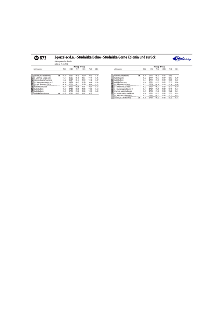Zgorzelec d.a. - Studniska Dolne - Studniska Gorne Kolonia und zurück Alle Angaben ohne Gewähr. Gültig ab 01.10.2016 EURO-NEISSE-TICKET Fahrtnummer Zgorzelec, d.a.(Busbahnhof) Zg-c,ul.Warsz. k. stacji paliw Zgorzelec, Luzycka/Reymonta Zg-c Reymonta za budynk. nr 27 Zgorzelec, Reymonta Tylicka Studniska Dolne, skrz. Studniska Dolne Studniska Gorne Studniska Gorne, Kolonia ab an 7307 7309 04.50 04.51 04.52 04.54 04.56 05.01 05.03 05.05 05.07 06.55 06.56 06.57 06.59 07.01 07.06 07.08 07.10 07.12 Montag - Freitag 7311 7313 08.45 08.46 08.47 08.49 08.51 08.56 08.58 09.00 09.02 12.50 12.51 12.52 12.54 12.56 13.01 13.03 13.05 13.07 7329 7331 Fahrtnummer 14.40 14.41 14.42 14.44 14.46 14.51 14.53 14.55 14.57 15.45 15.46 15.47 15.49 15.51 15.56 15.58 16.00 Studniska Gorne, Kolonia Studniska Gorne Studniska Dolne Studniska Dolne, skrz. Zg-c ul Reymonta/ul Lesna Zg-c ul Reymonta/ul Widok Zg-c Reymonta przed bud. nr 27 Zg Luzycka naprzeciw kosciola Zg-c Luzycka miedzy wiaduktami Zg-c Warszawska/Maratonska Zgorzelec, d.a.(Busbahnhof) EURO-NEISSE-TICKET v 873 ab an 7308 7310 05.10 05.12 05.14 05.16 05.21 05.22 05.24 05.25 05.26 05.27 05.28 07.15 07.17 07.19 07.21 07.26 07.27 07.29 07.30 07.31 07.32 07.33 Montag - Freitag 7312 7314 09.15 09.17 09.19 09.21 09.26 09.27 09.29 09.30 09.31 09.32 09.33 13.15 13.17 13.19 13.21 13.26 13.27 13.29 13.30 13.31 13.32 13.33 7330 7315 15.05 15.07 15.09 15.11 15.16 15.17 15.19 15.20 15.21 15.22 15.23 16.00 16.02 16.04 16.09 16.10 16.12 16.13 16.14 16.15 16.16
